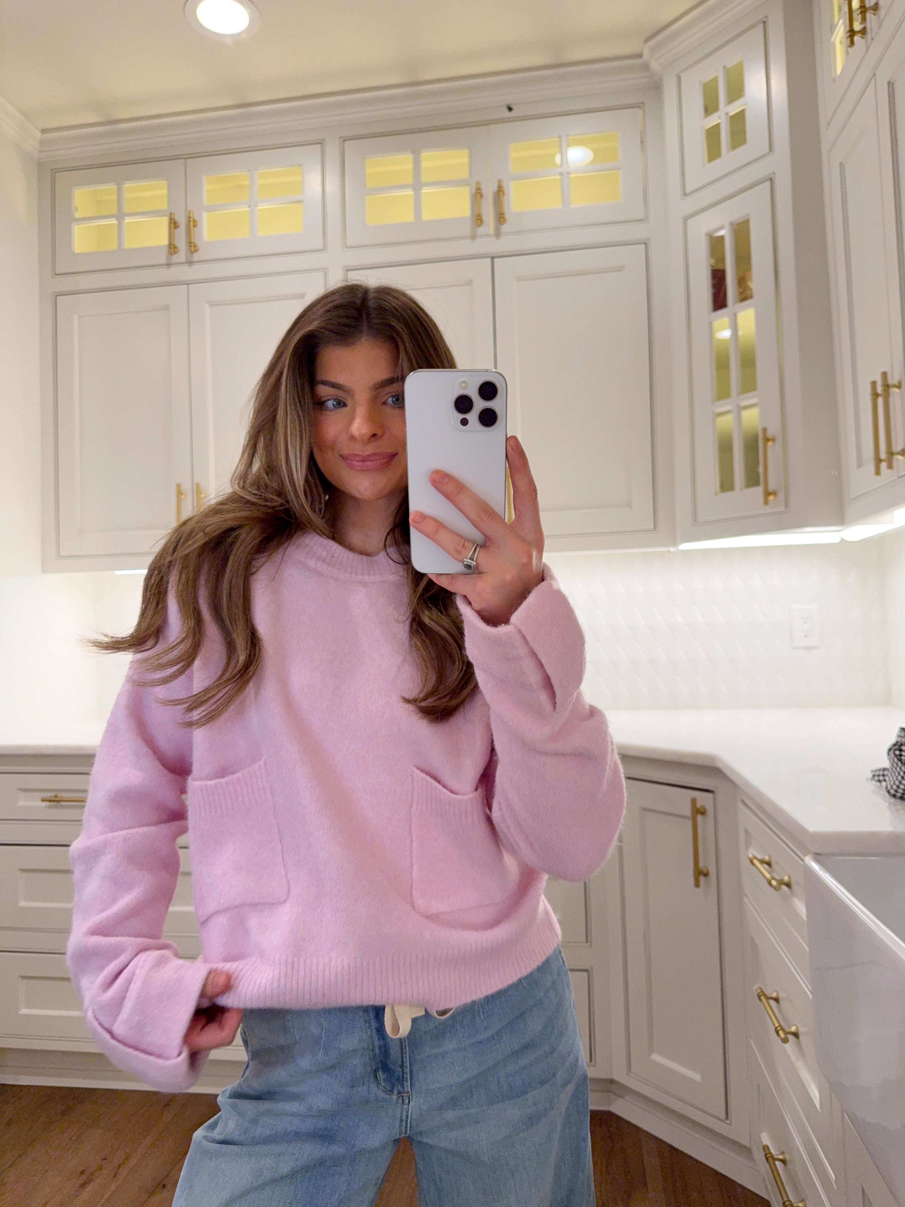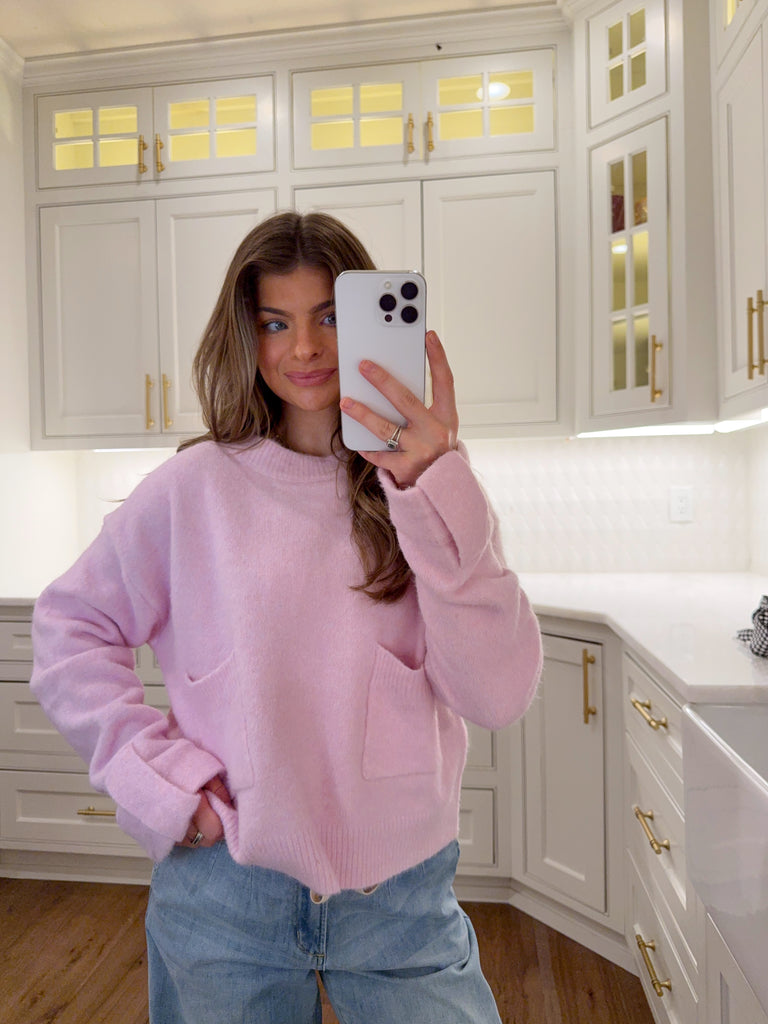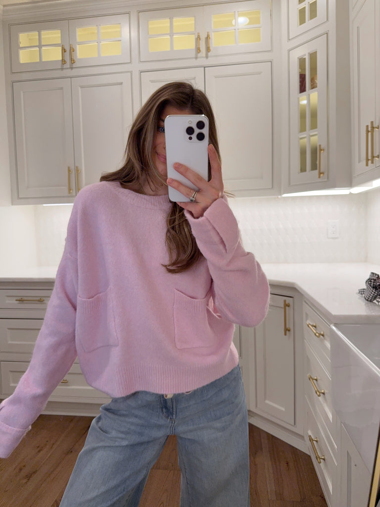 Solid crew neckline long sleeve with fold cuff detail knit pullover sweater top. Double front pocket detail.