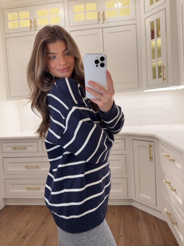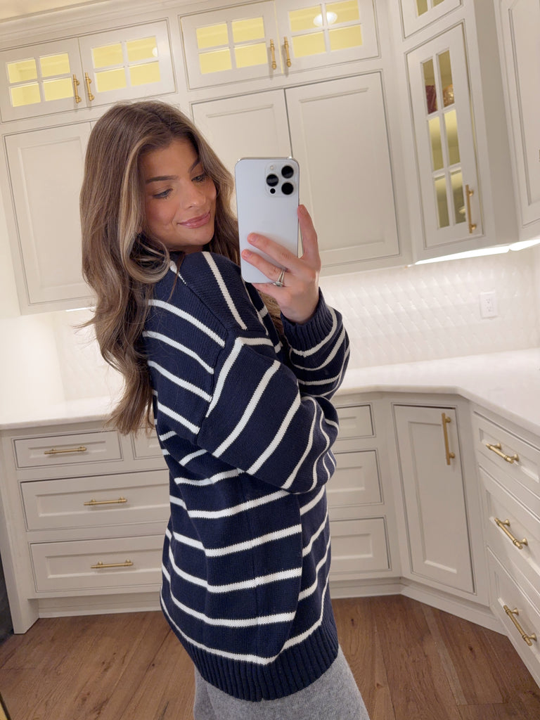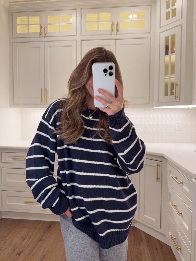 Oversized striped knit sweater featuring a round neck and a relaxed fit.