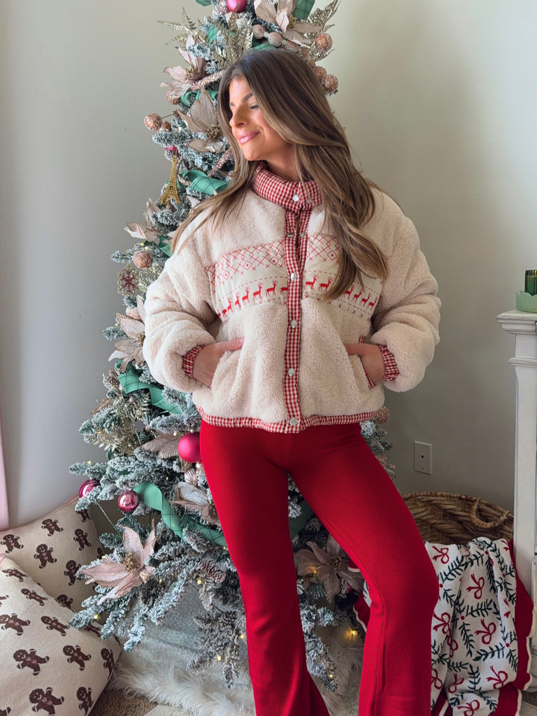 Sherpa Jacket With Gingham Lining and Holiday Trim
