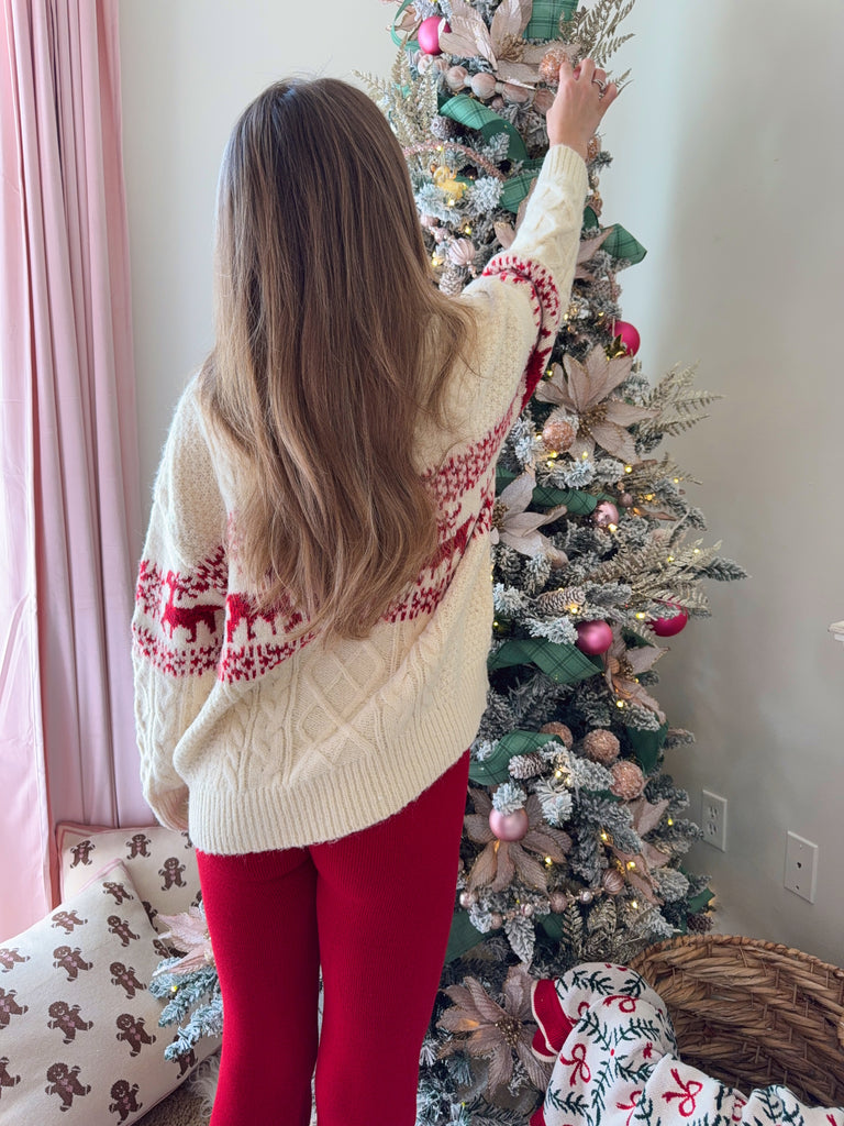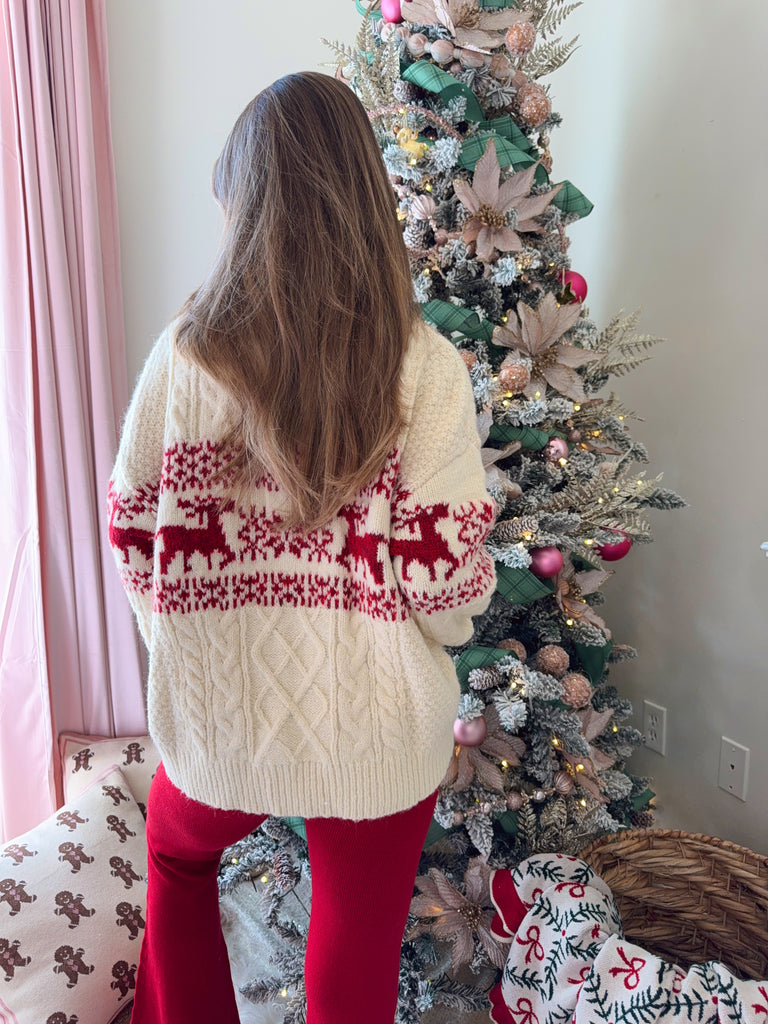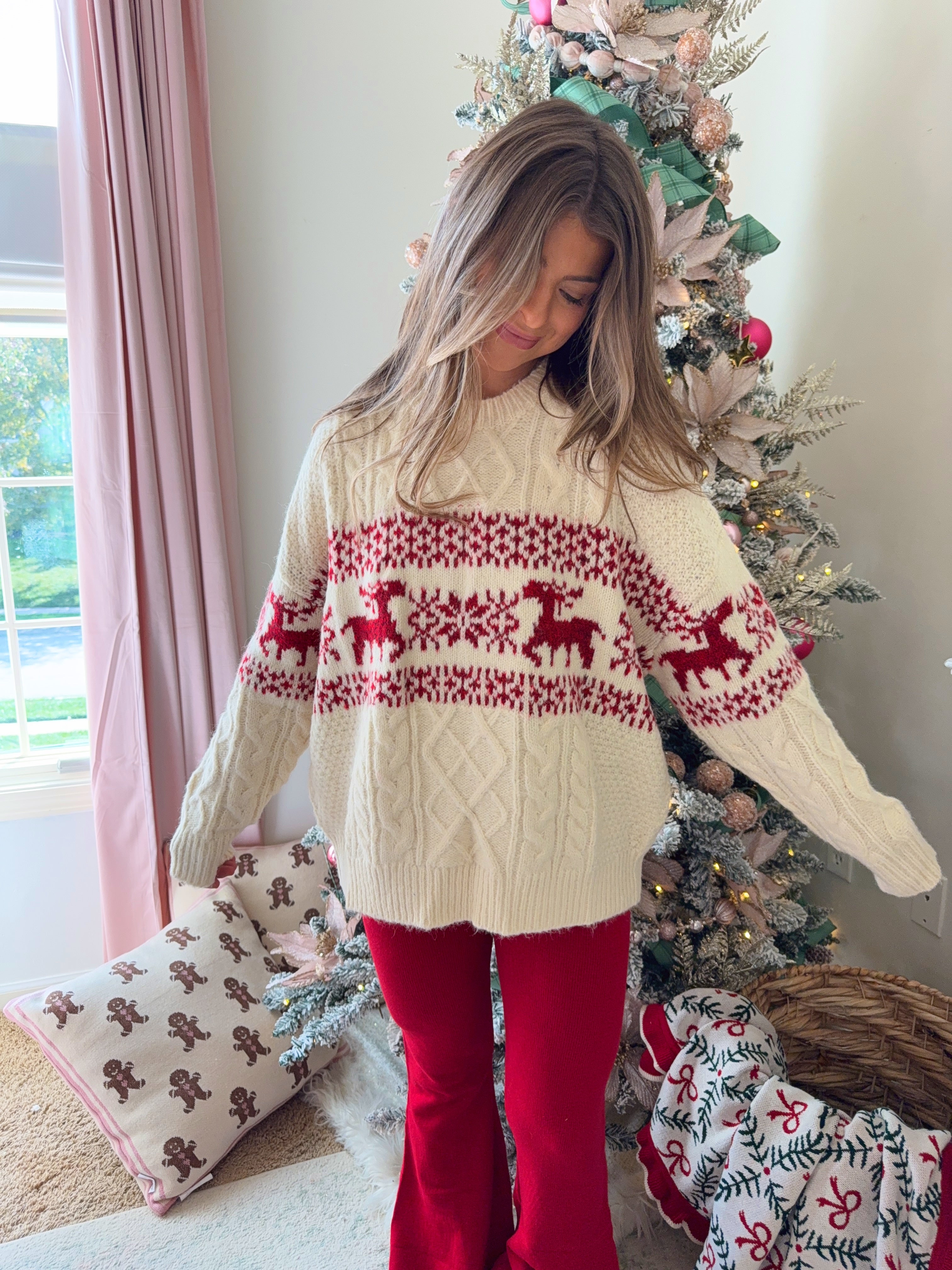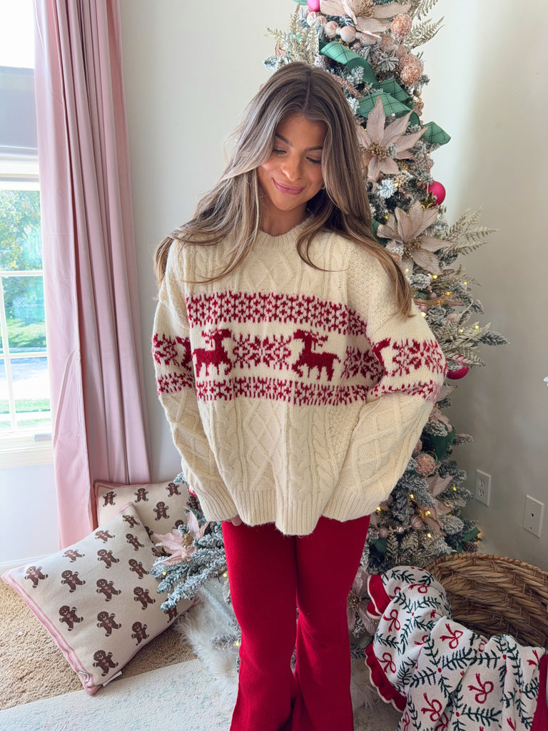 Round neck cable knit sweater featuring a reindeer holiday print. Featuring a relaxed fit and legging approved.