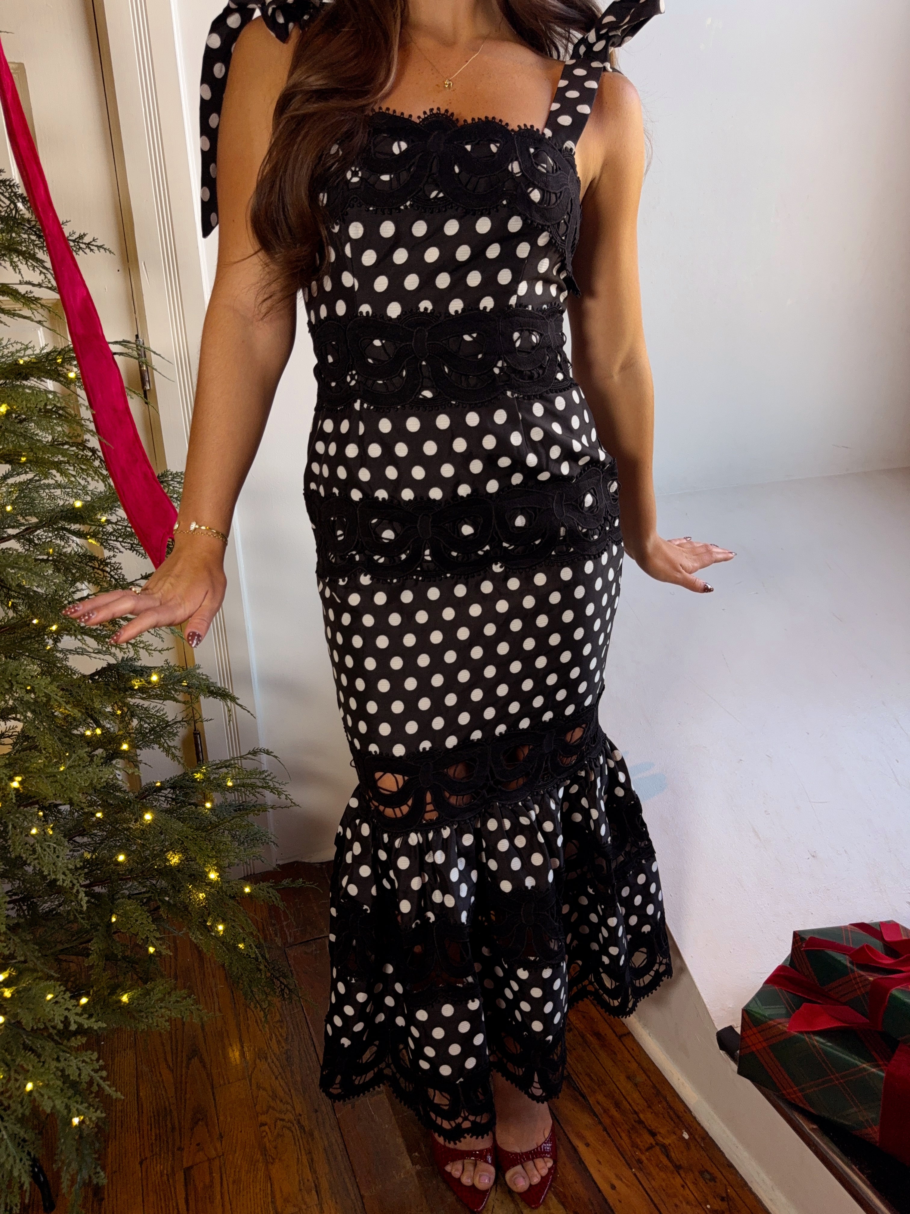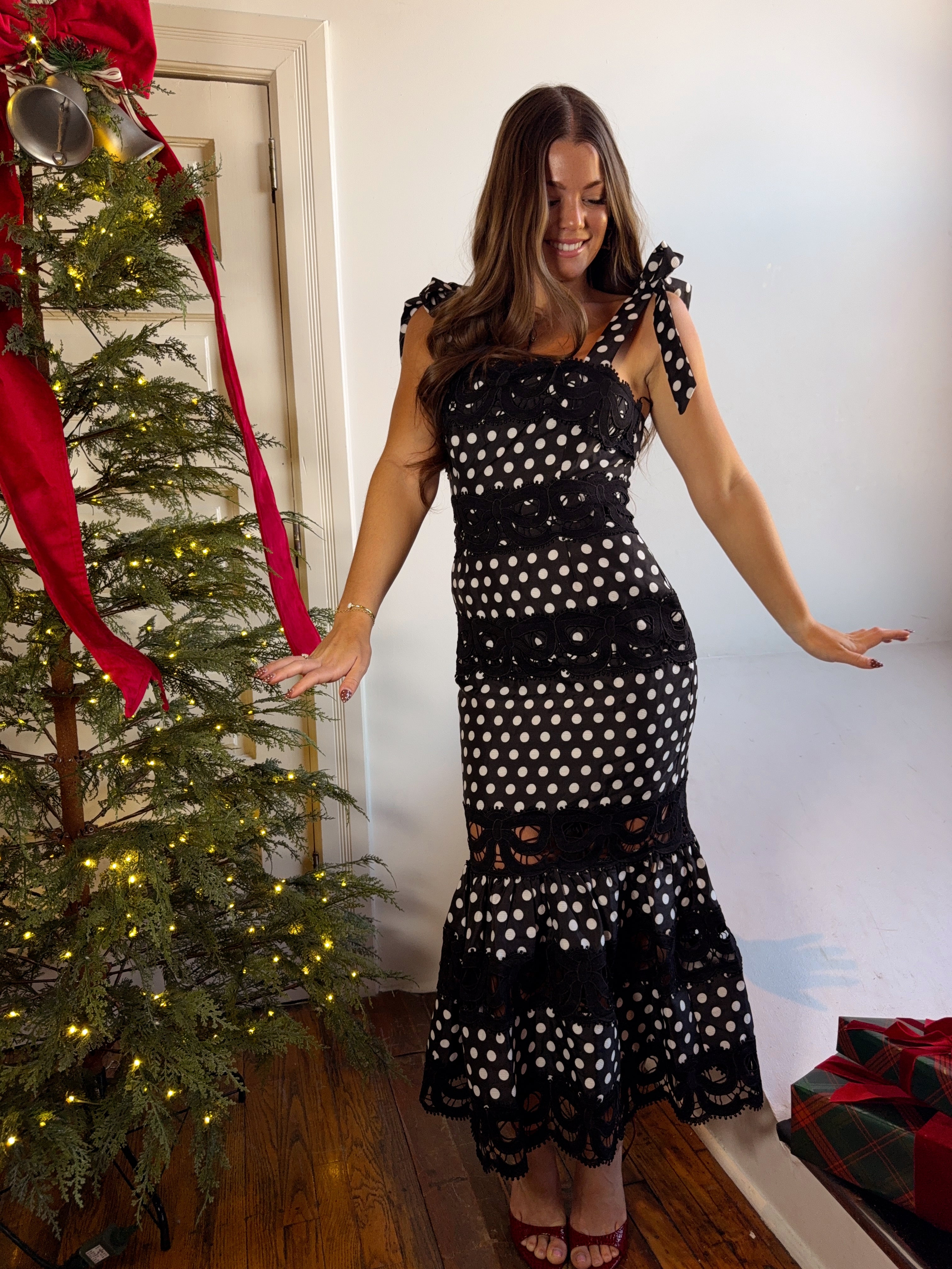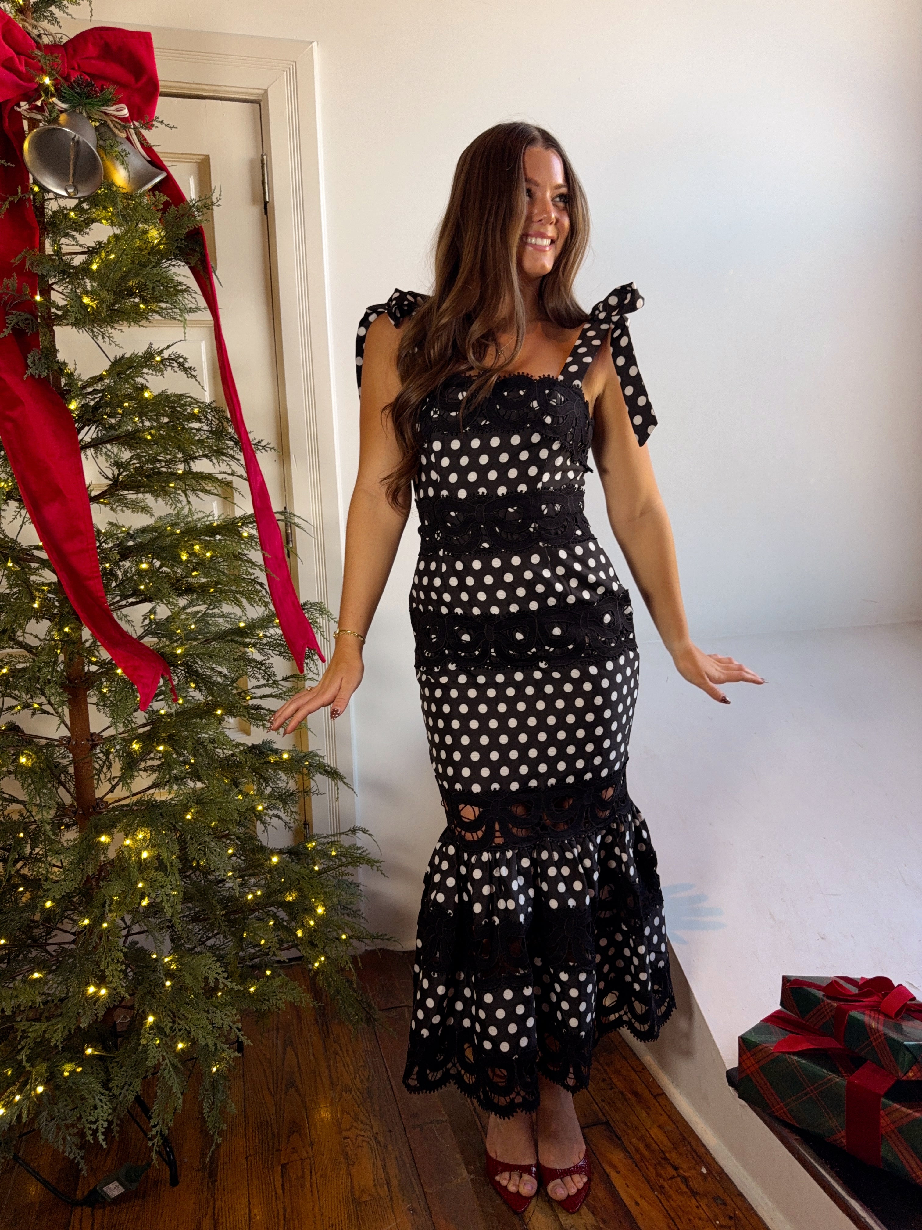 Make a chic and festive fashion statement this holiday season with our Louie Polka Dot Midi Dress! This fitted dress features tie shoulders and a fancy flare hem, all adorned with a playful intermix of black and white polka dots and delicate black lace. Stand out at any event with this fancy and flattering piece. Finished with a zipper up the back.
