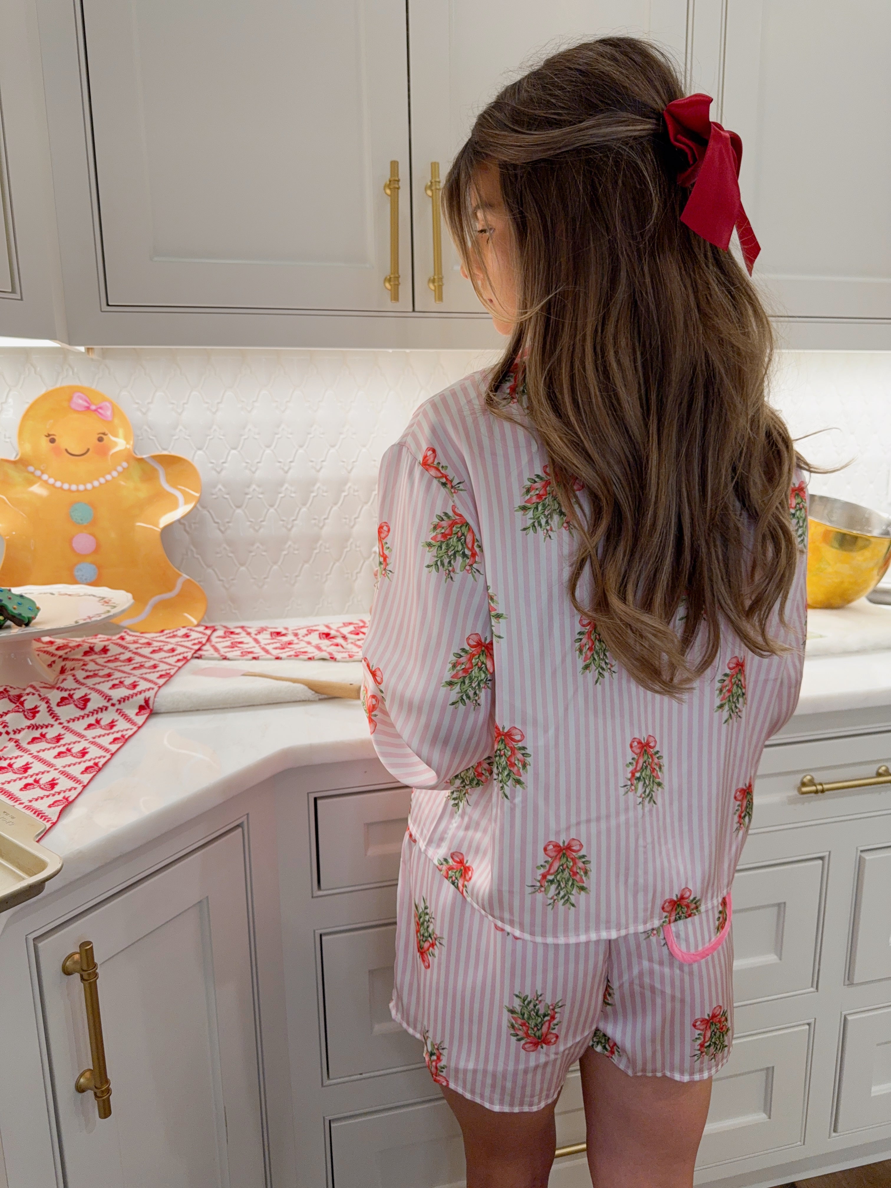 Pink and white stripe pajamas mistletoe printed satin pajamas. Features a high rise elasticized was it with a velvet drawstring details.