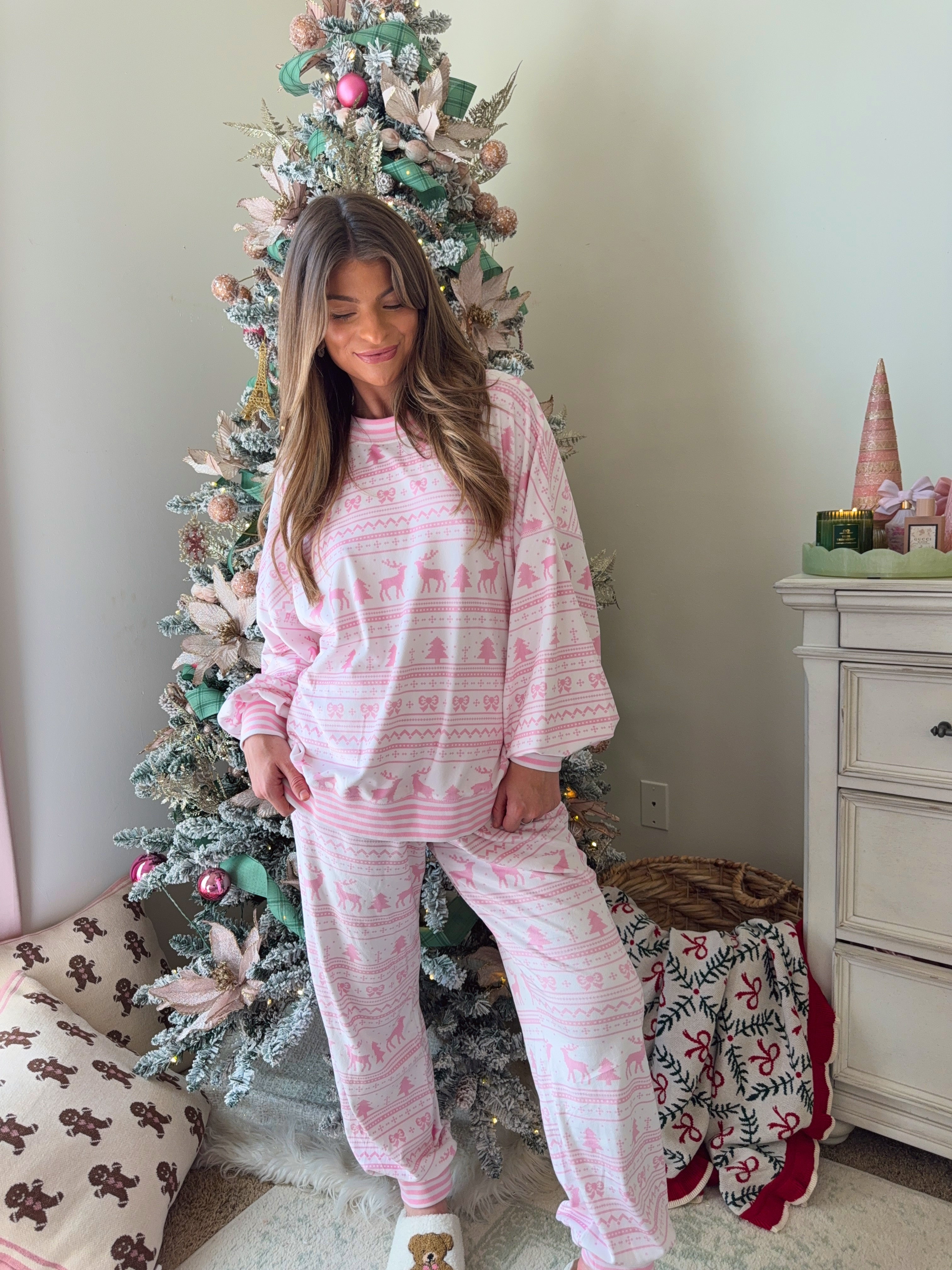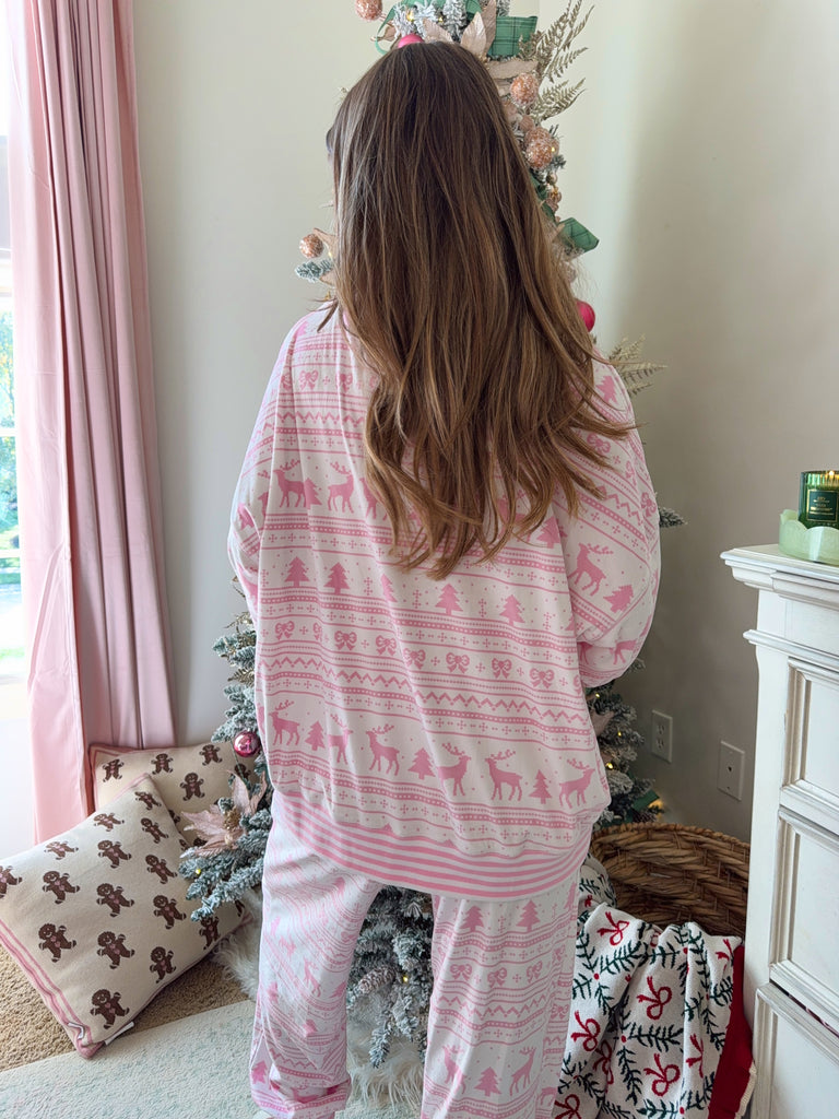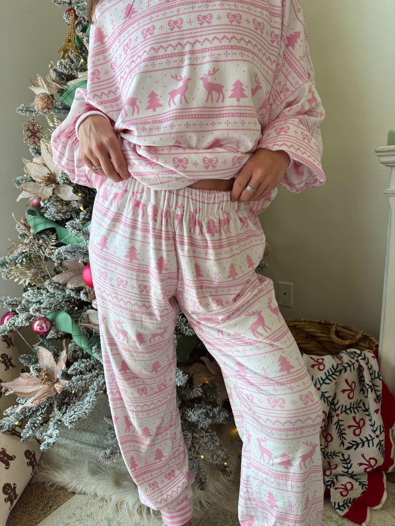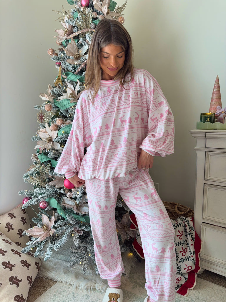 Soft touch fleece Christmas lounge top and jogger set. Featuring a relaxed fit pullover and high rise elastic waist pants.