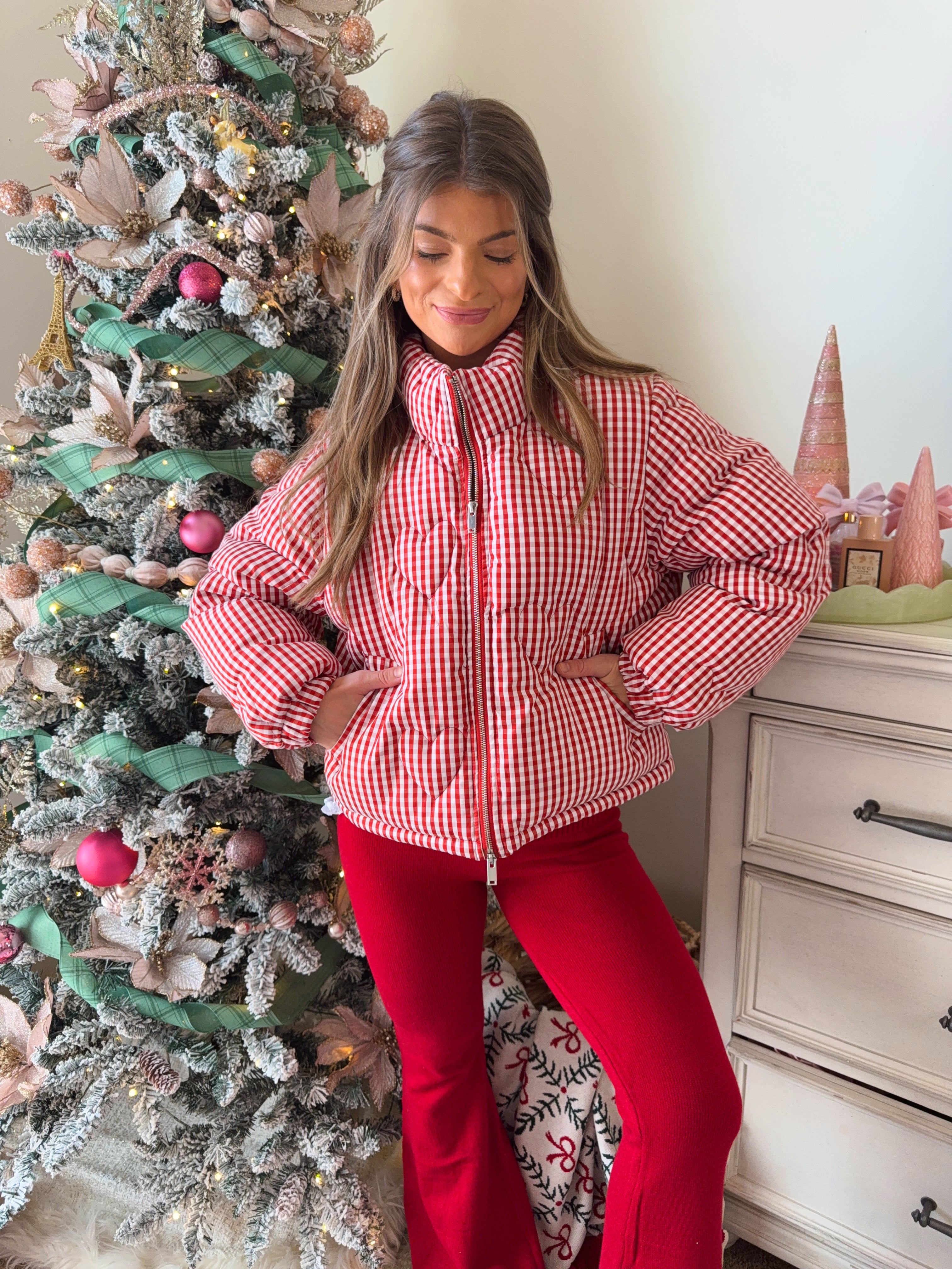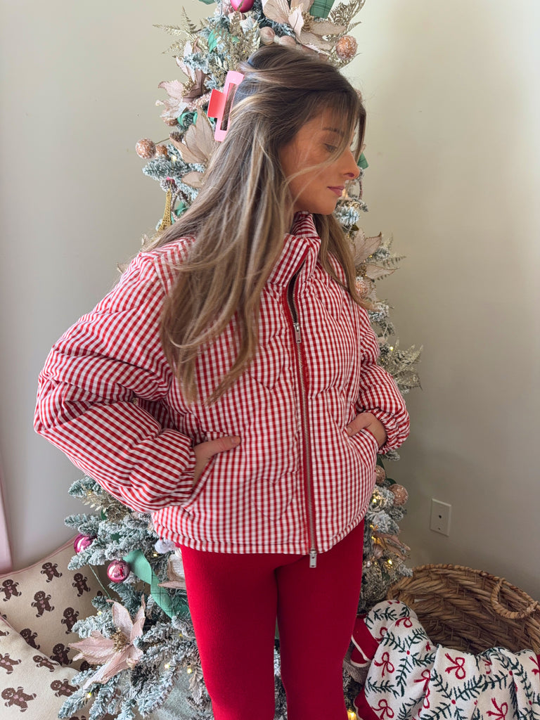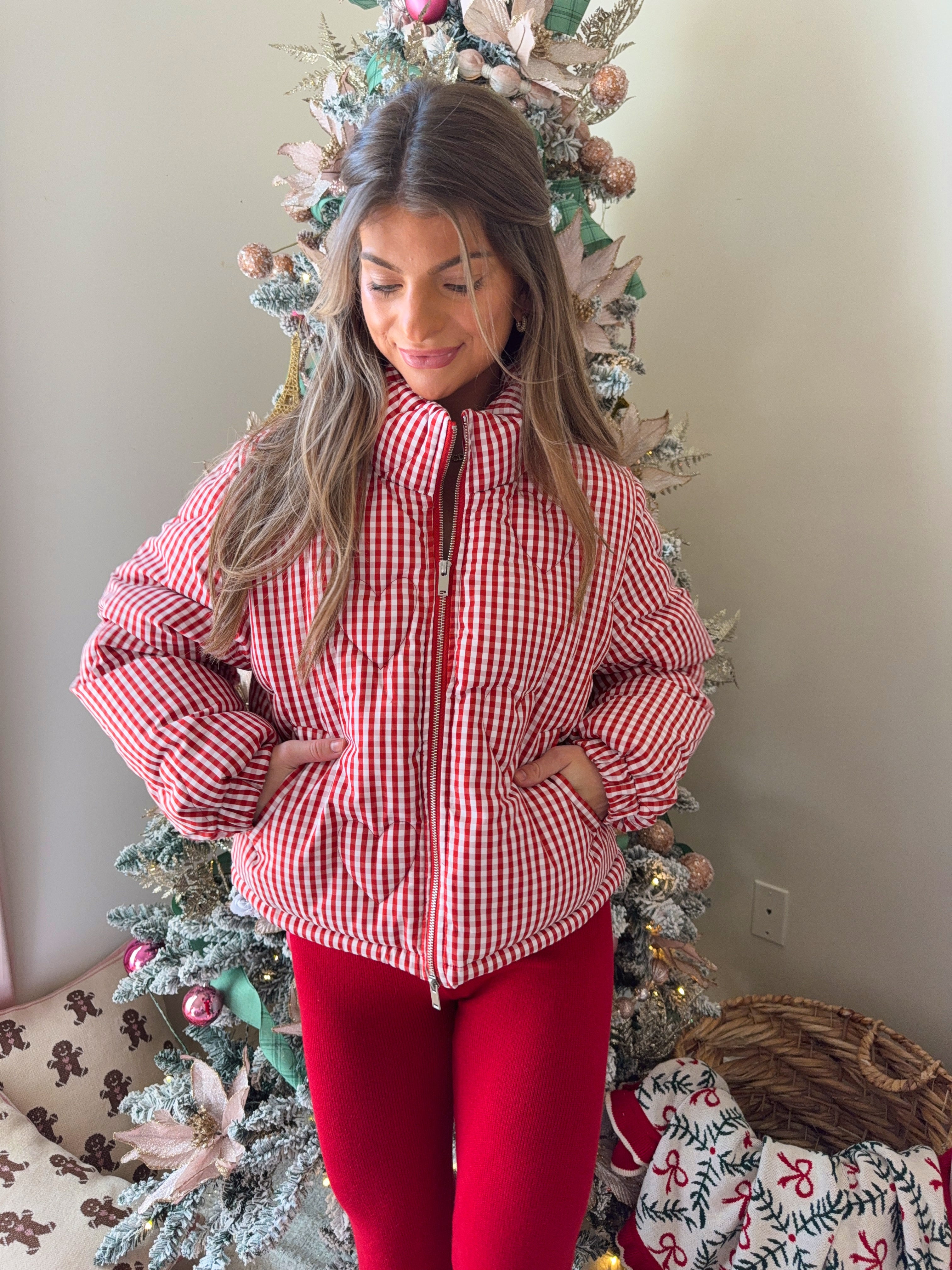 Prancer Gingham Print Puffer Jacket with Heart Shaped Quilting