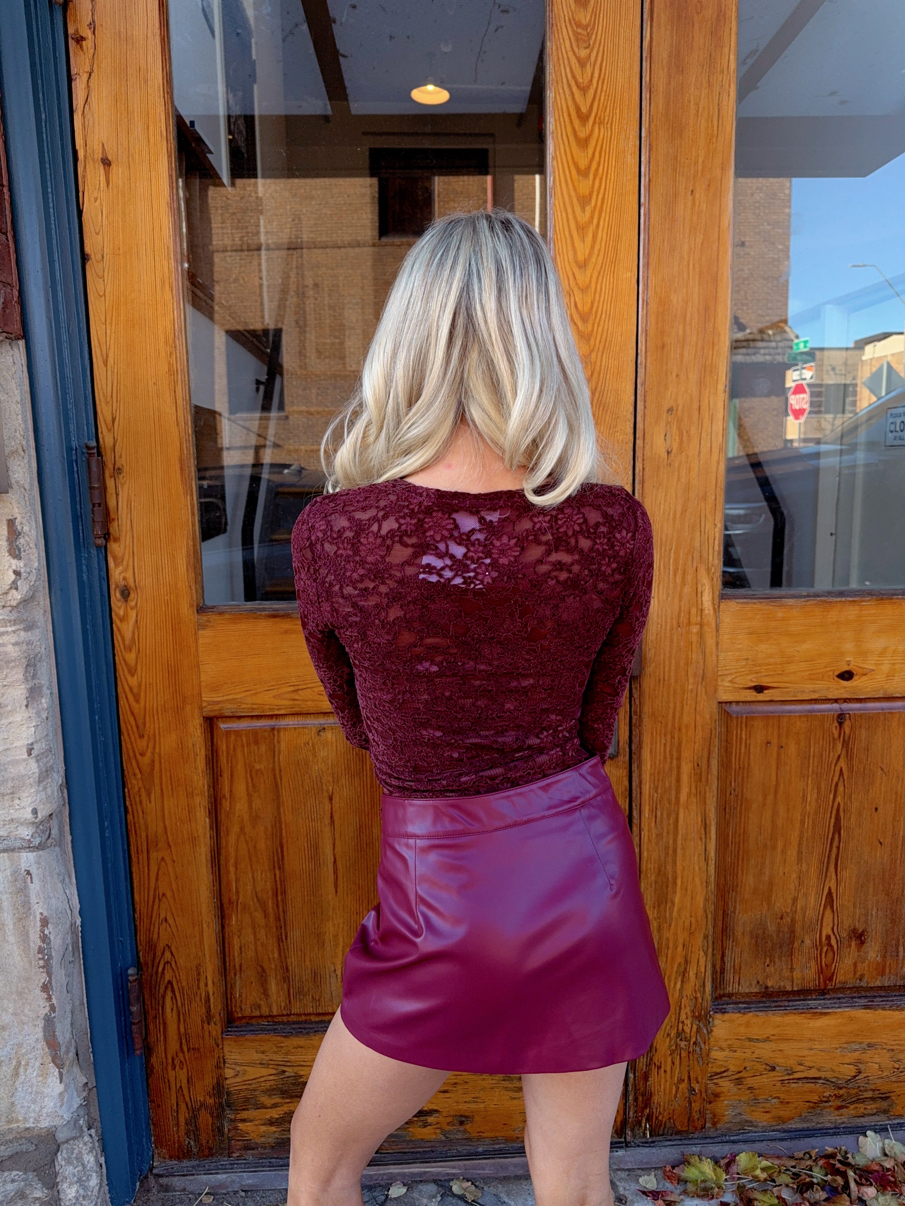 High rise burgundy faux leather mini skirt