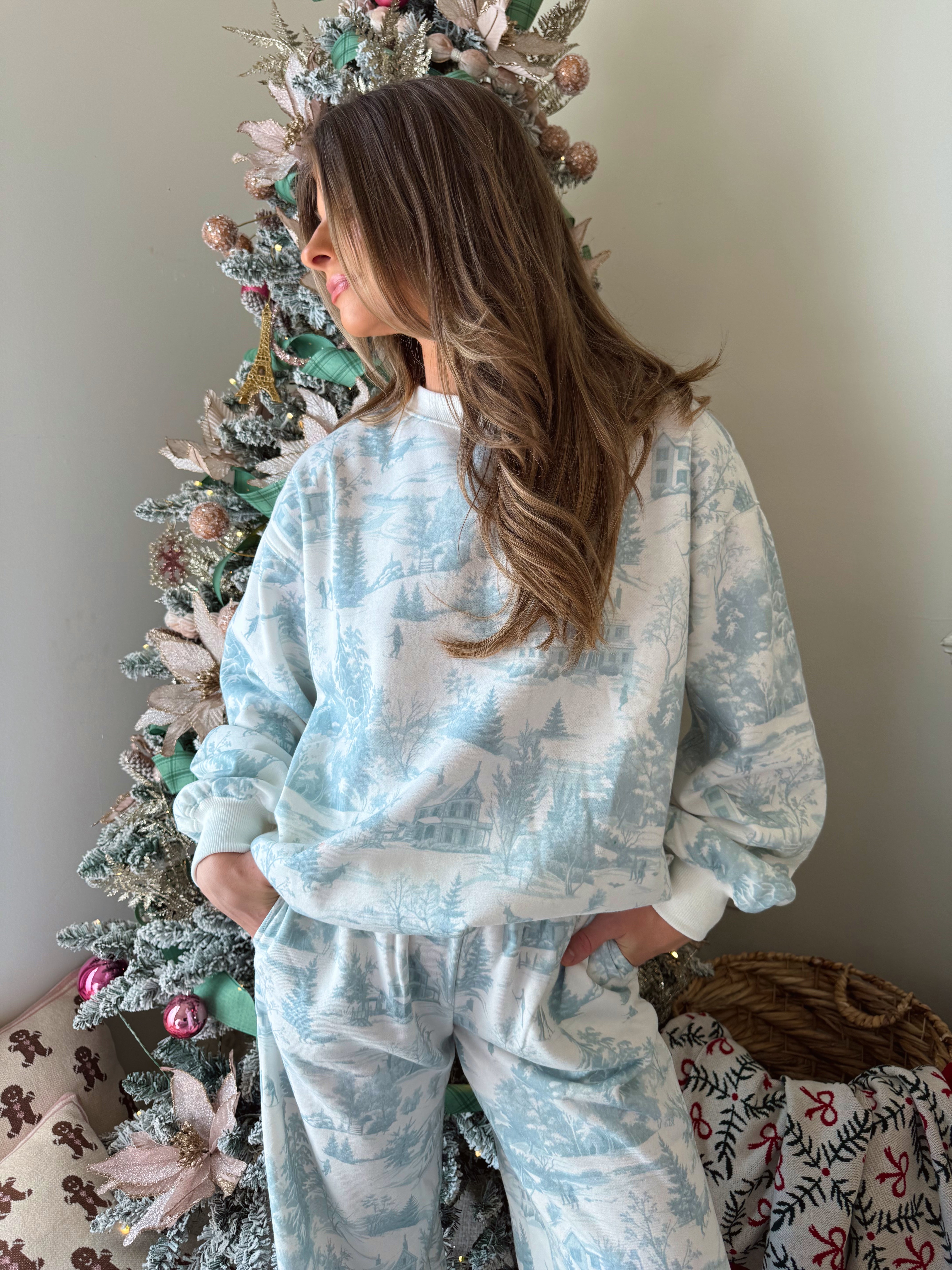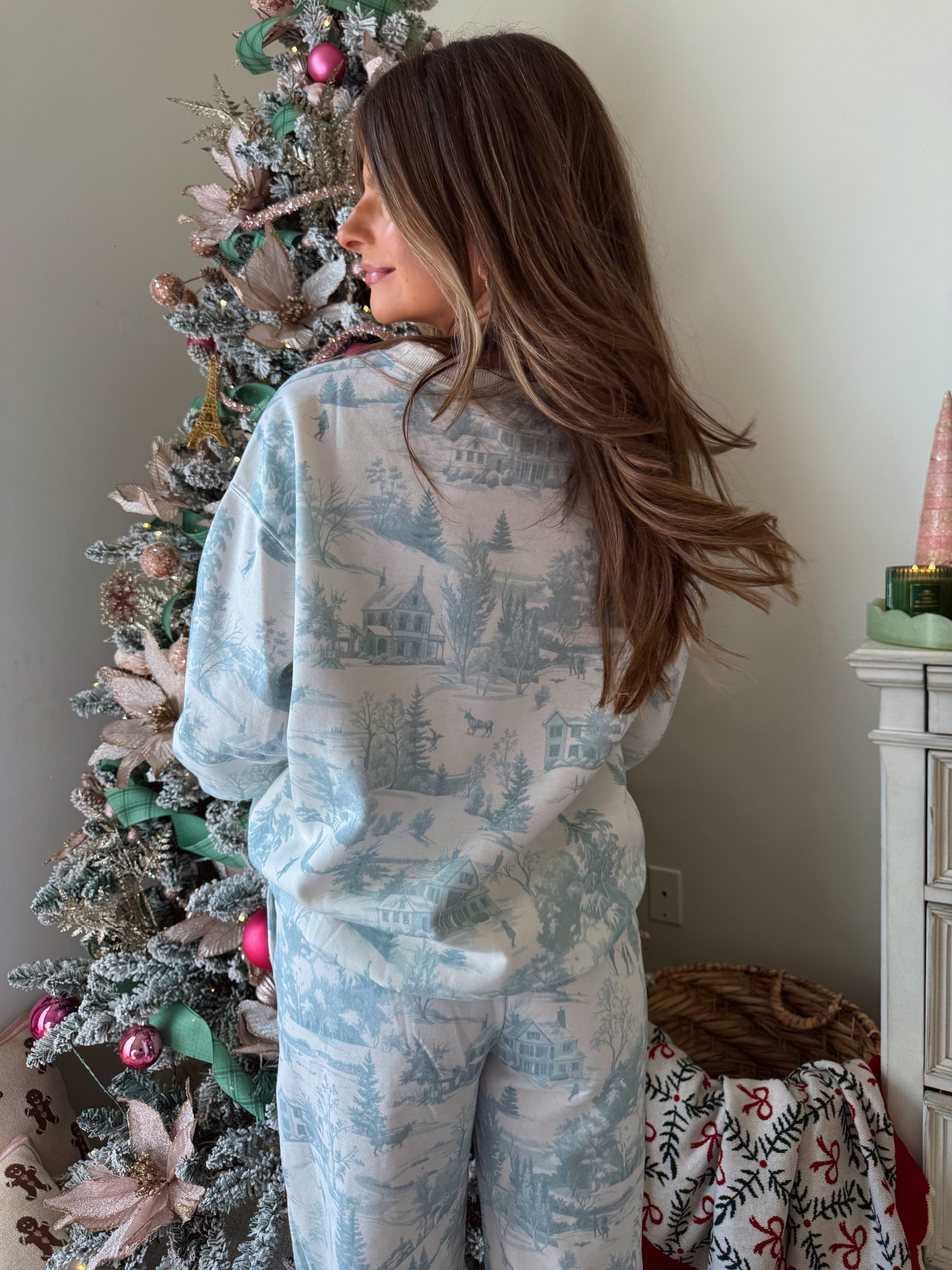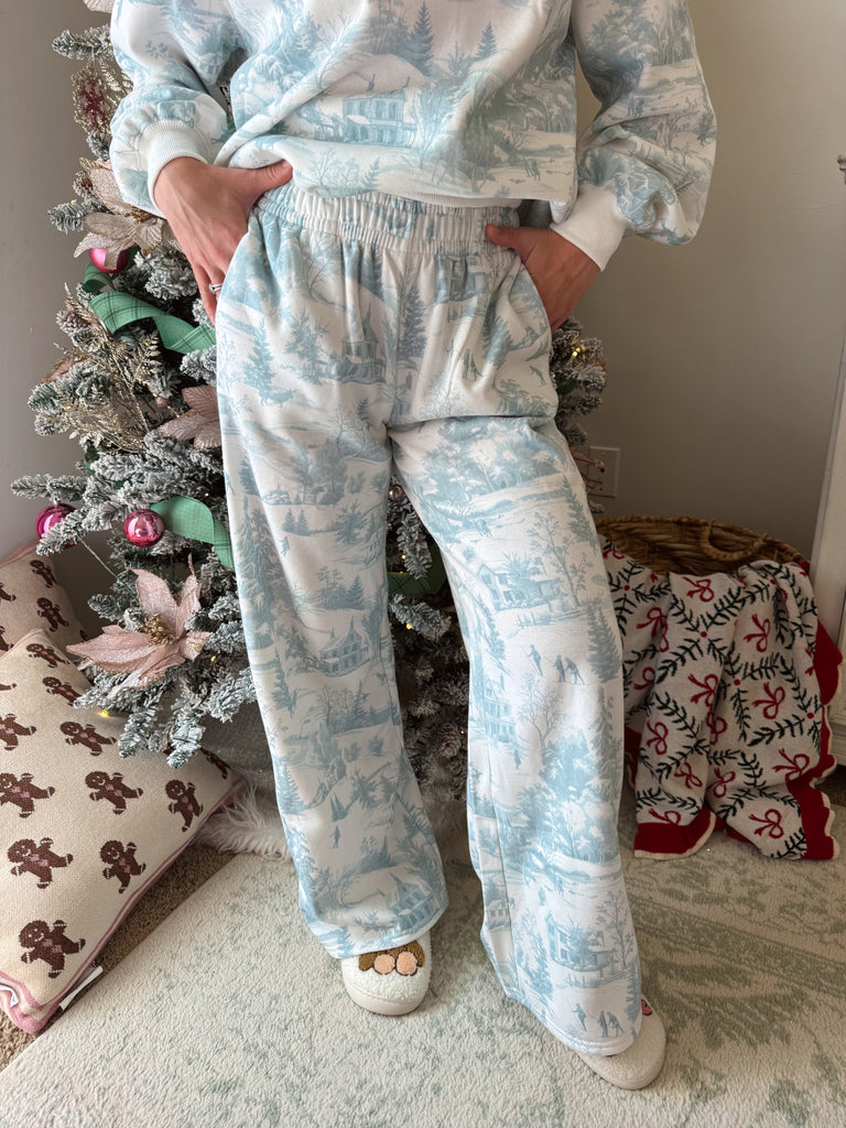 Holiday scenery printed fleece Terry sweatshirt and sweatpants set. Featuring a classic relaxed fit and high rise elastic waist flare lounge pants.