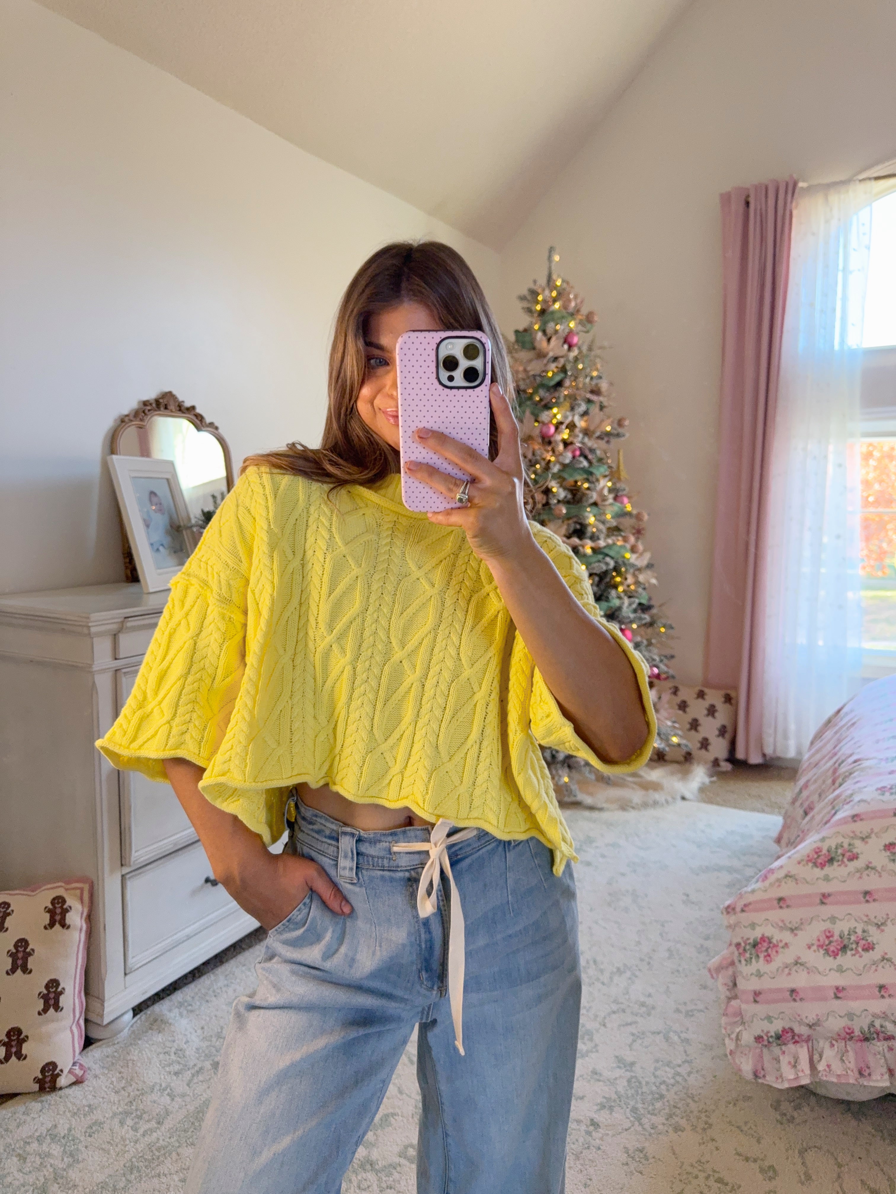 Cableknit crop short sleeve sweater featuring a raw edge hem and a relaxed fit. Perfect to pair with jeans.
