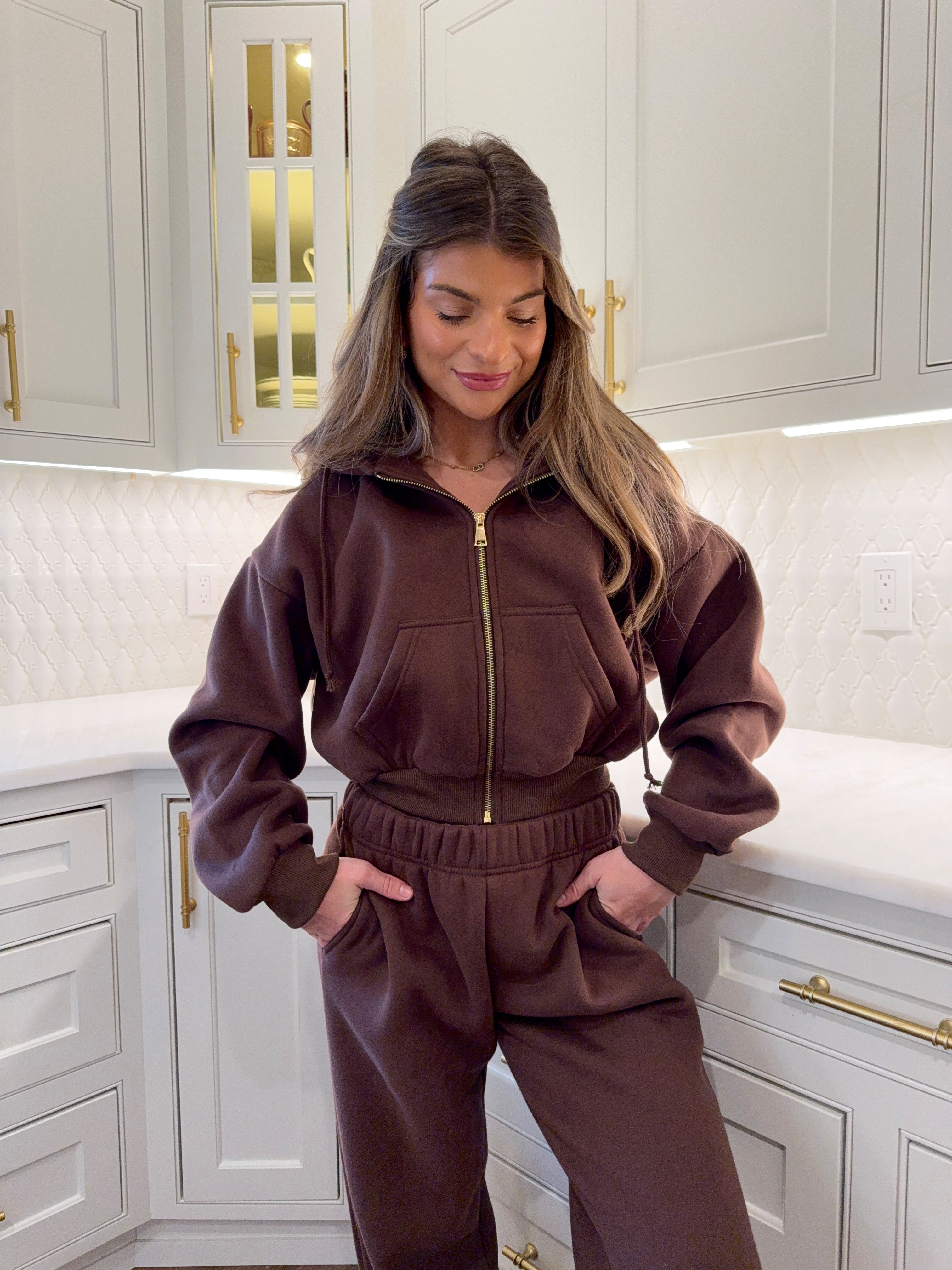 Fleece Oversized Crop Full Zip Hoodie - Chocolate