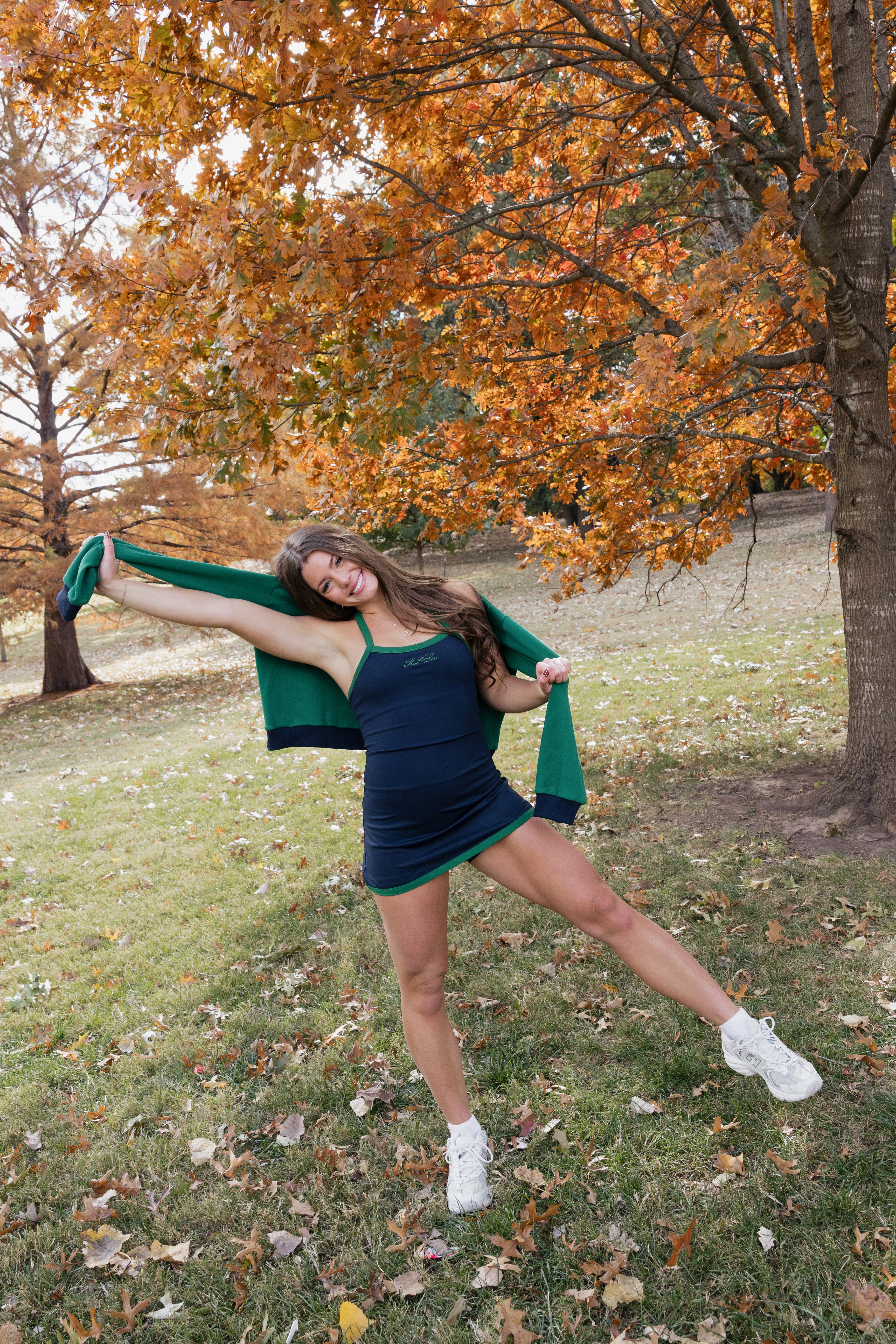 Sapphire fitted active dress featuring a halter neckline and partially built-in shorts for easy movement. Shake things up with your daily walks / workouts with this open back chic active dress.