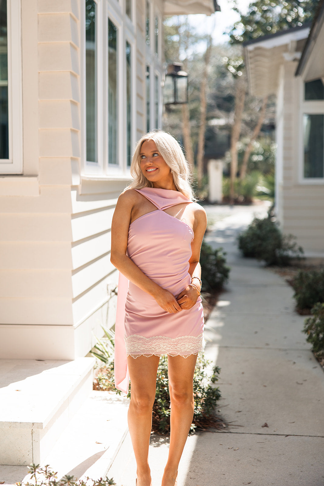 The Fairland Mini Dress is designed to make a statement. This sleek silhouette features a flattering fitted shape with delicate lace trim along the hem for a soft, romantic touch.