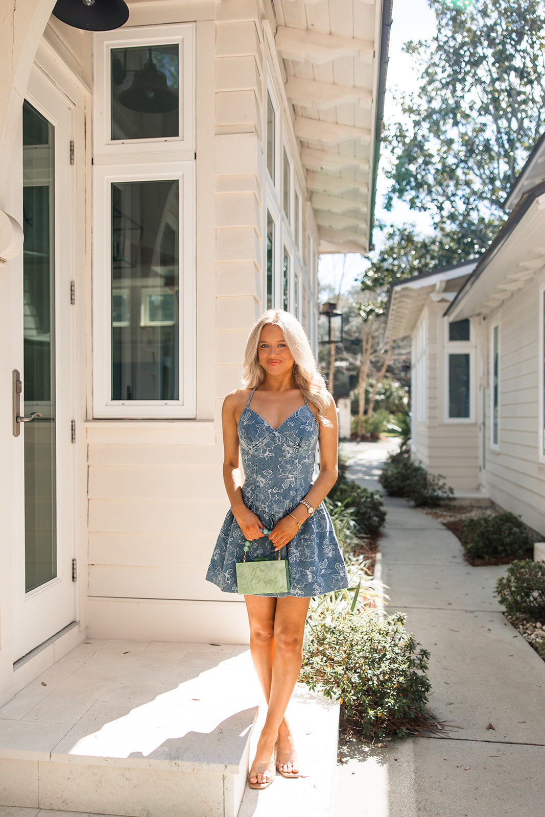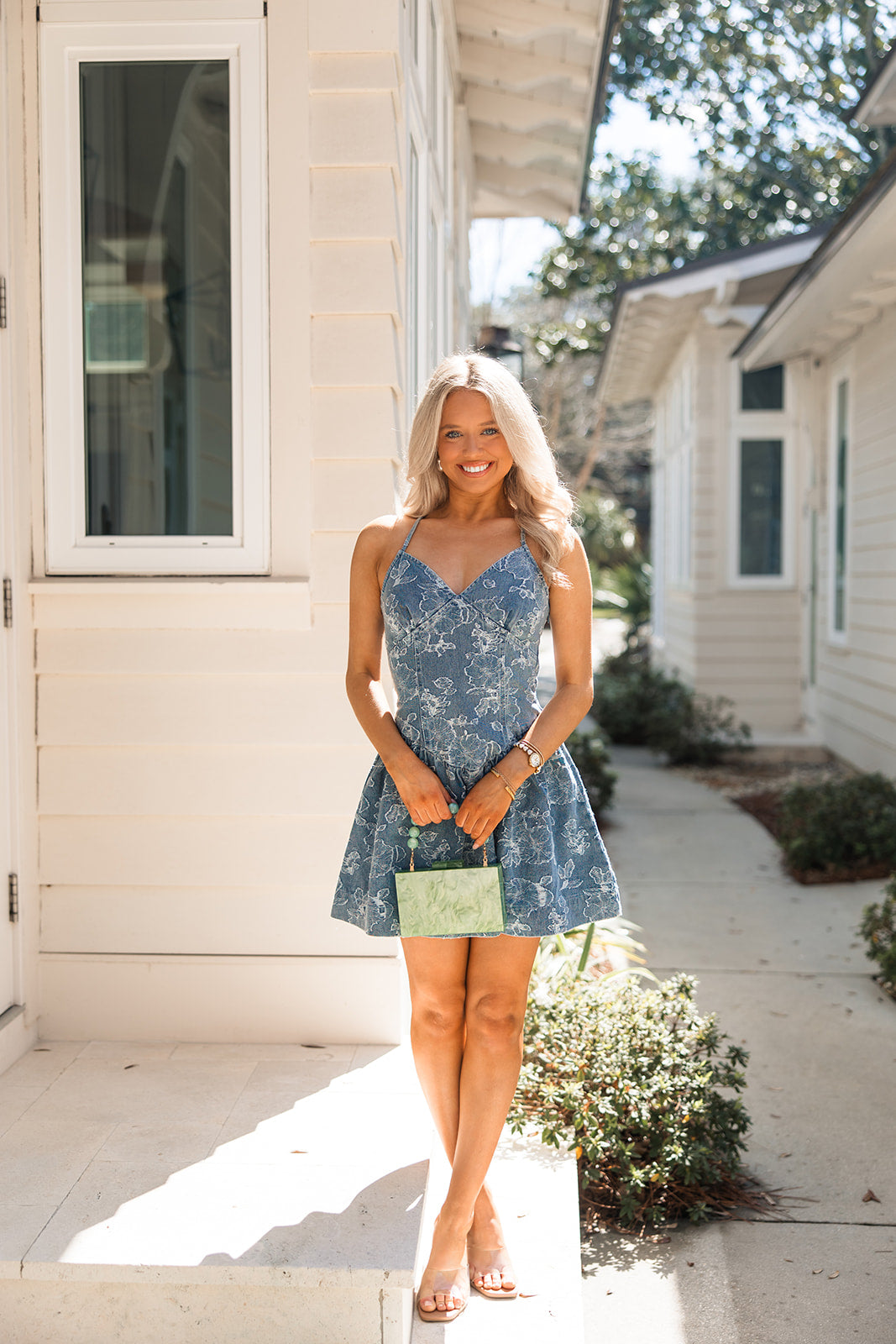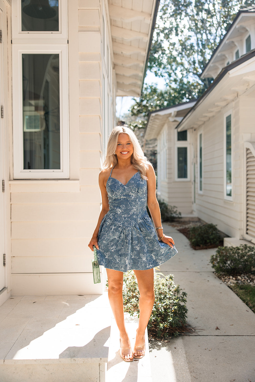 The Hollings Denim Mini Dress is a fresh take on a classic silhouette. Designed in soft denim with a subtle floral print, this flattering mini features a structured bodice that flows into a playful, flared skirt.