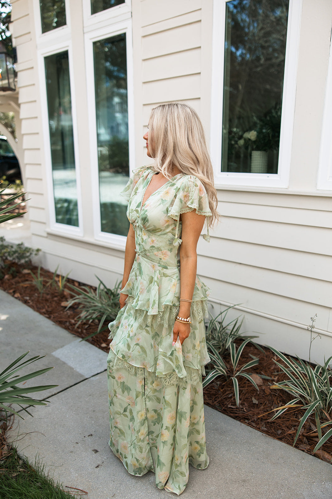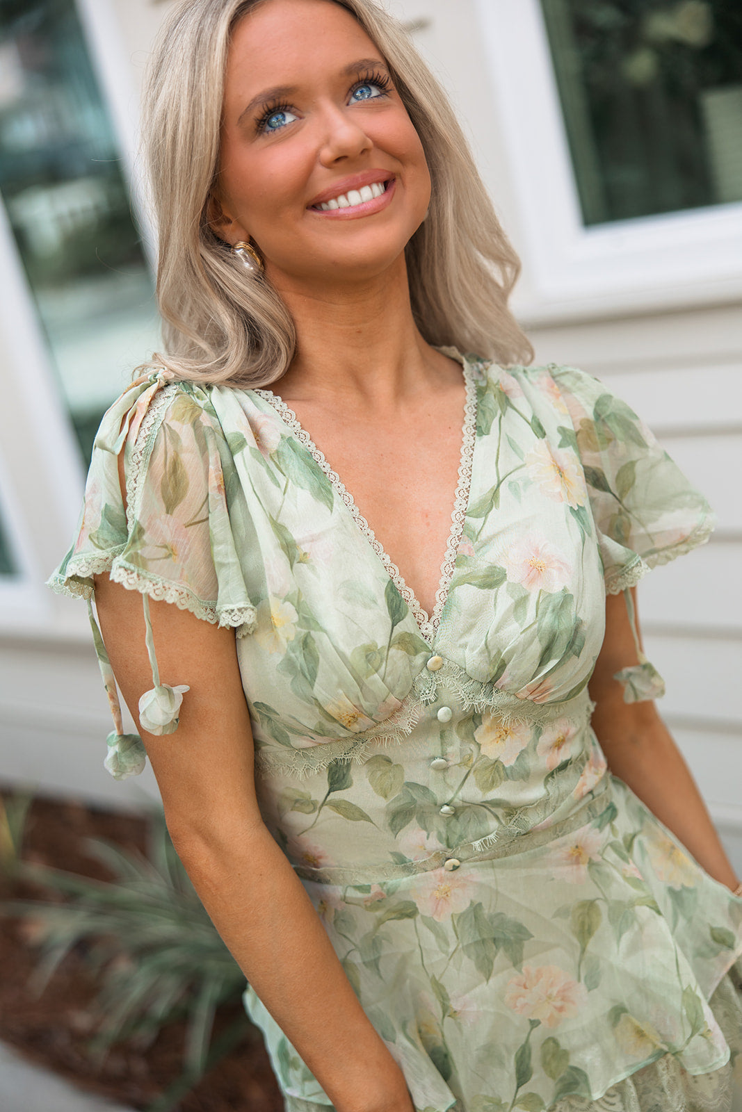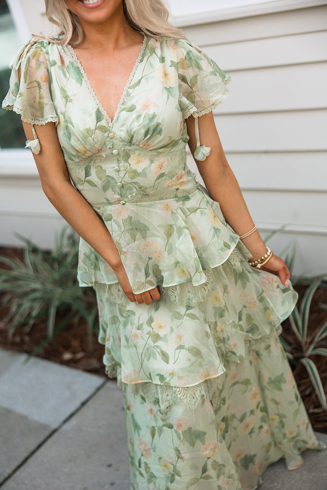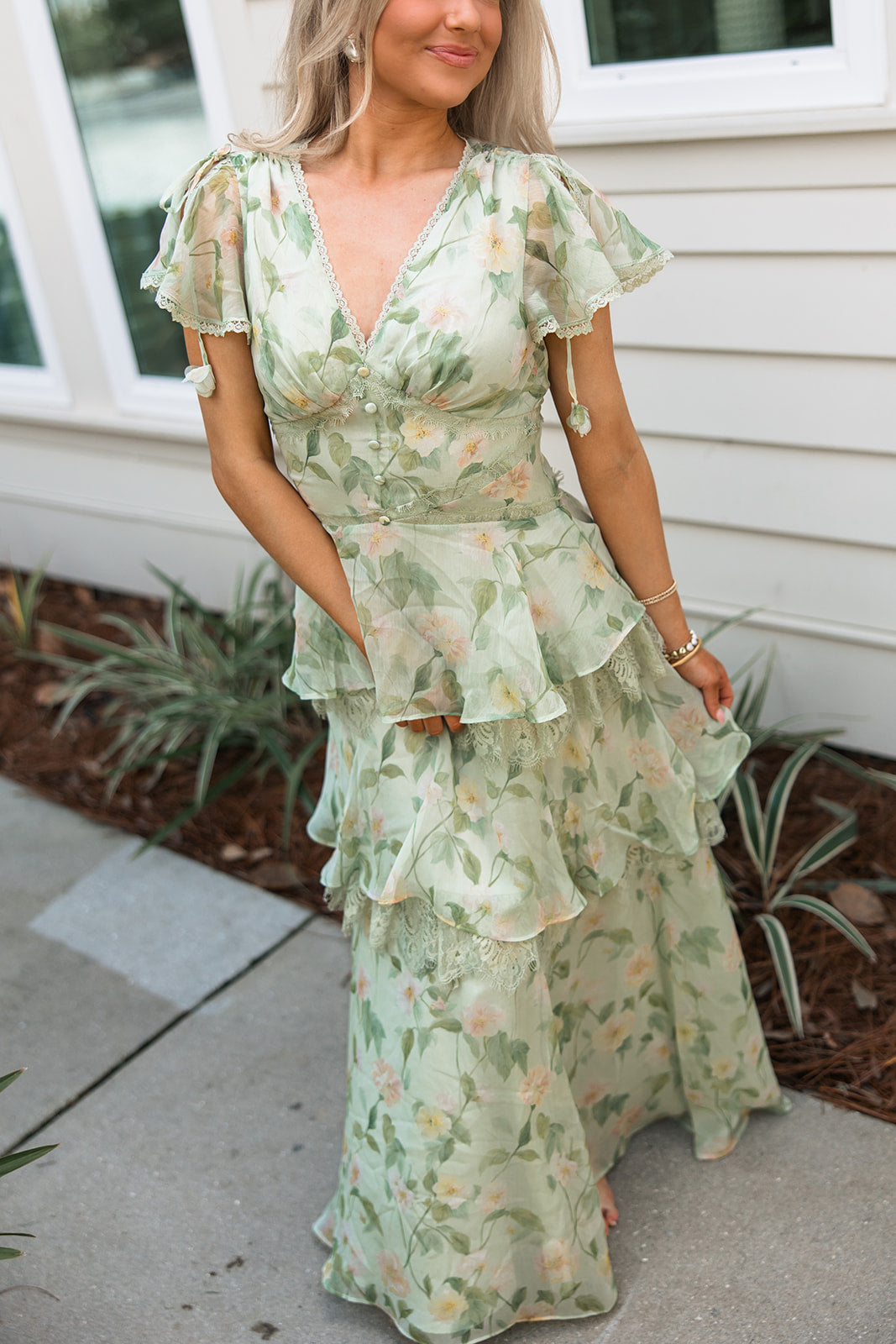 Made from airy chiffon, the dress features a soft sage base with a subtle floral print and layered ruffle tiers trimmed in lace for added texture and movement. The flattering V-neckline is finished with scalloped lace trim and dainty covered buttons down the bodice.