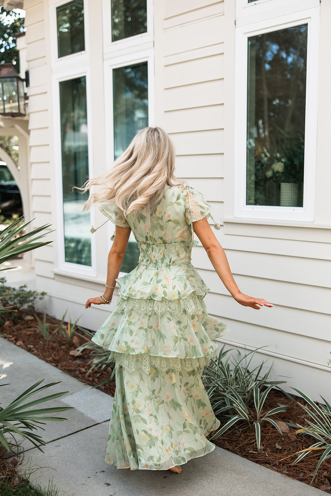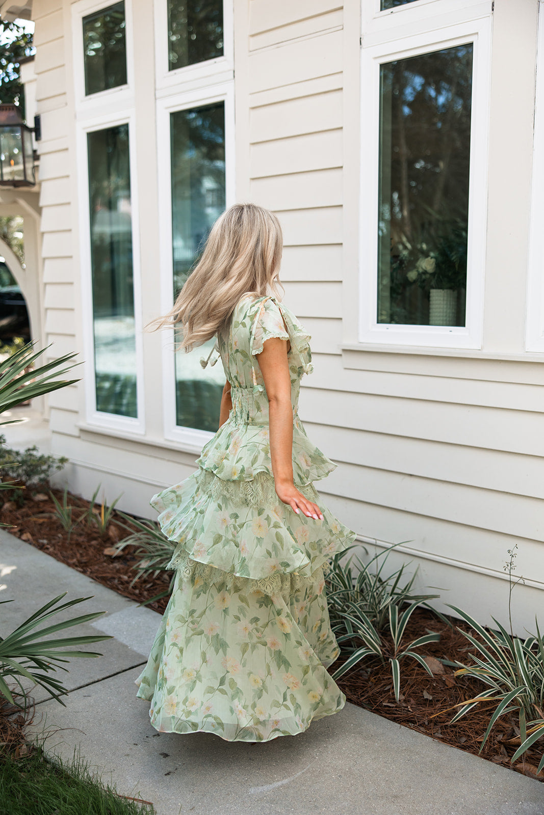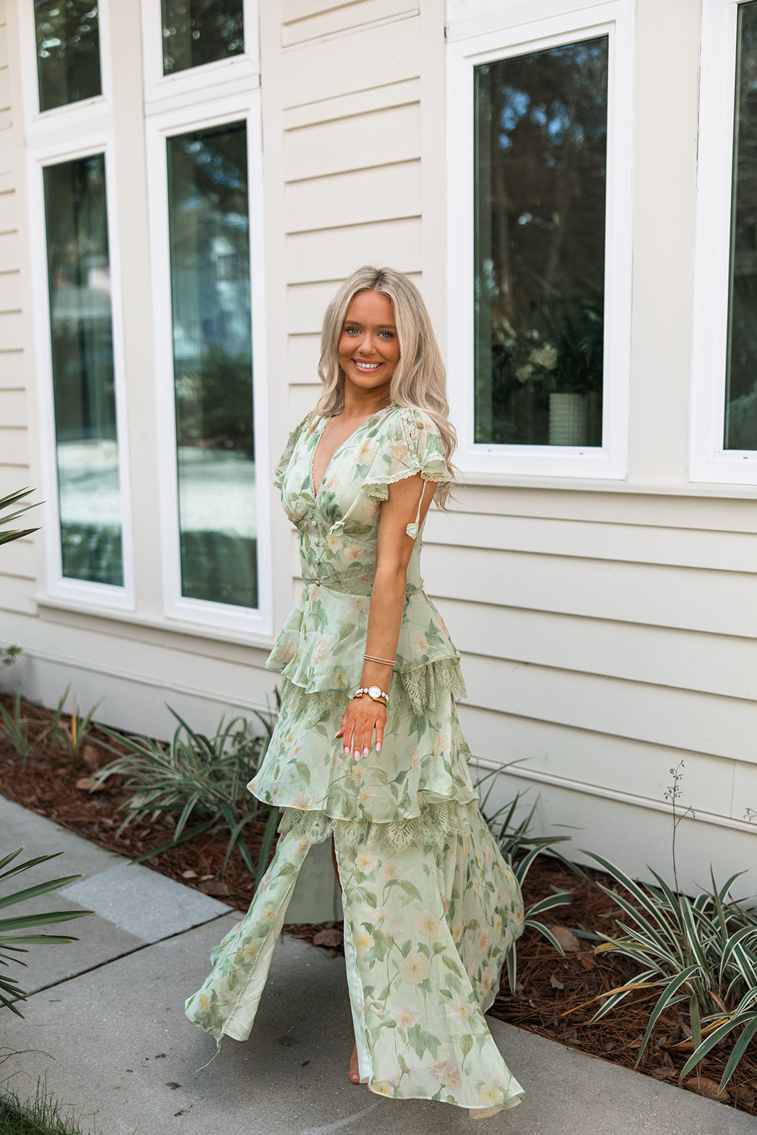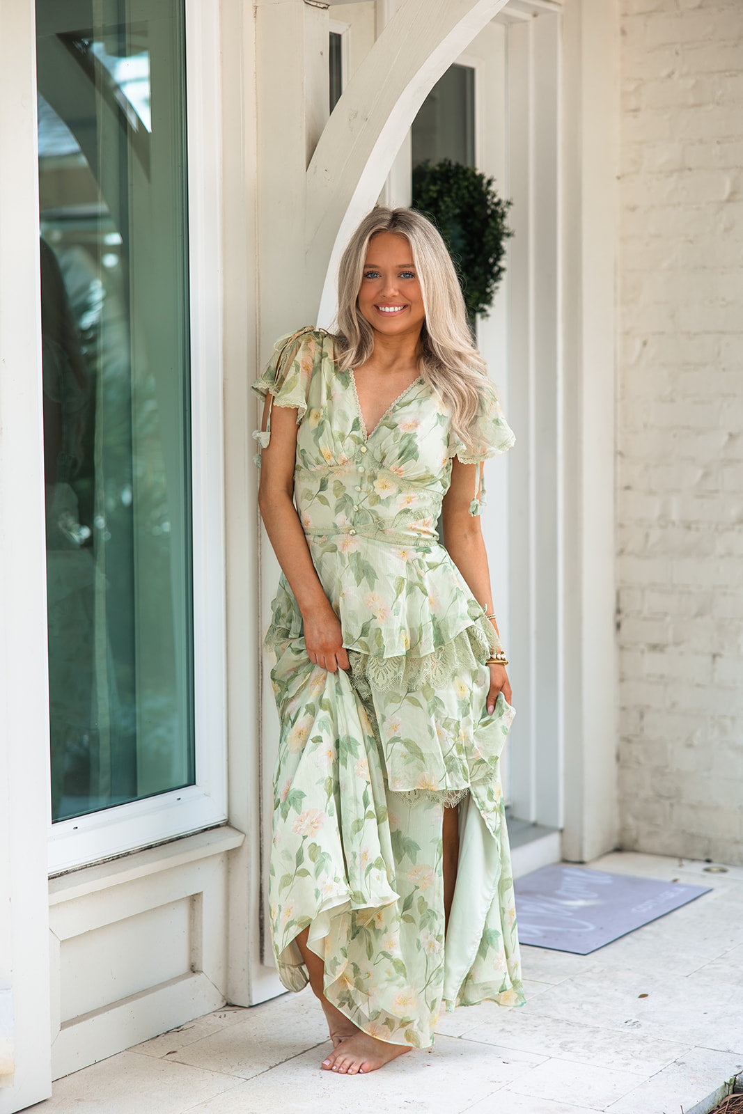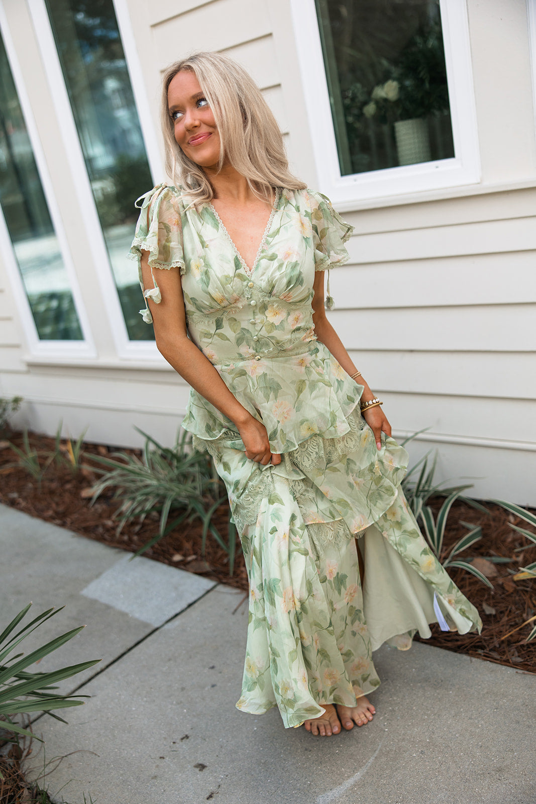 Made from airy chiffon, the dress features a soft sage base with a subtle floral print and layered ruffle tiers trimmed in lace for added texture and movement. The flattering V-neckline is finished with scalloped lace trim and dainty covered buttons down the bodice.