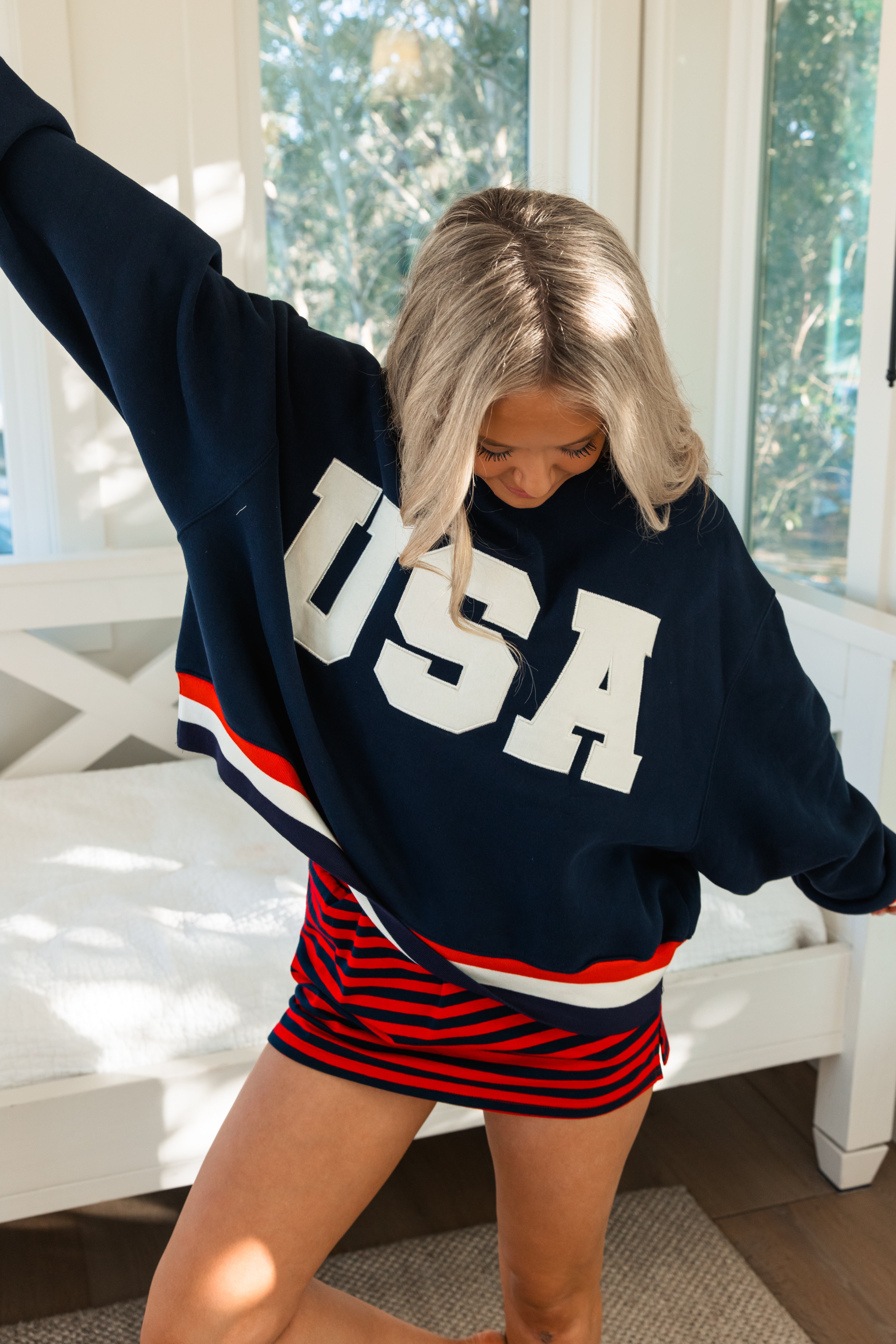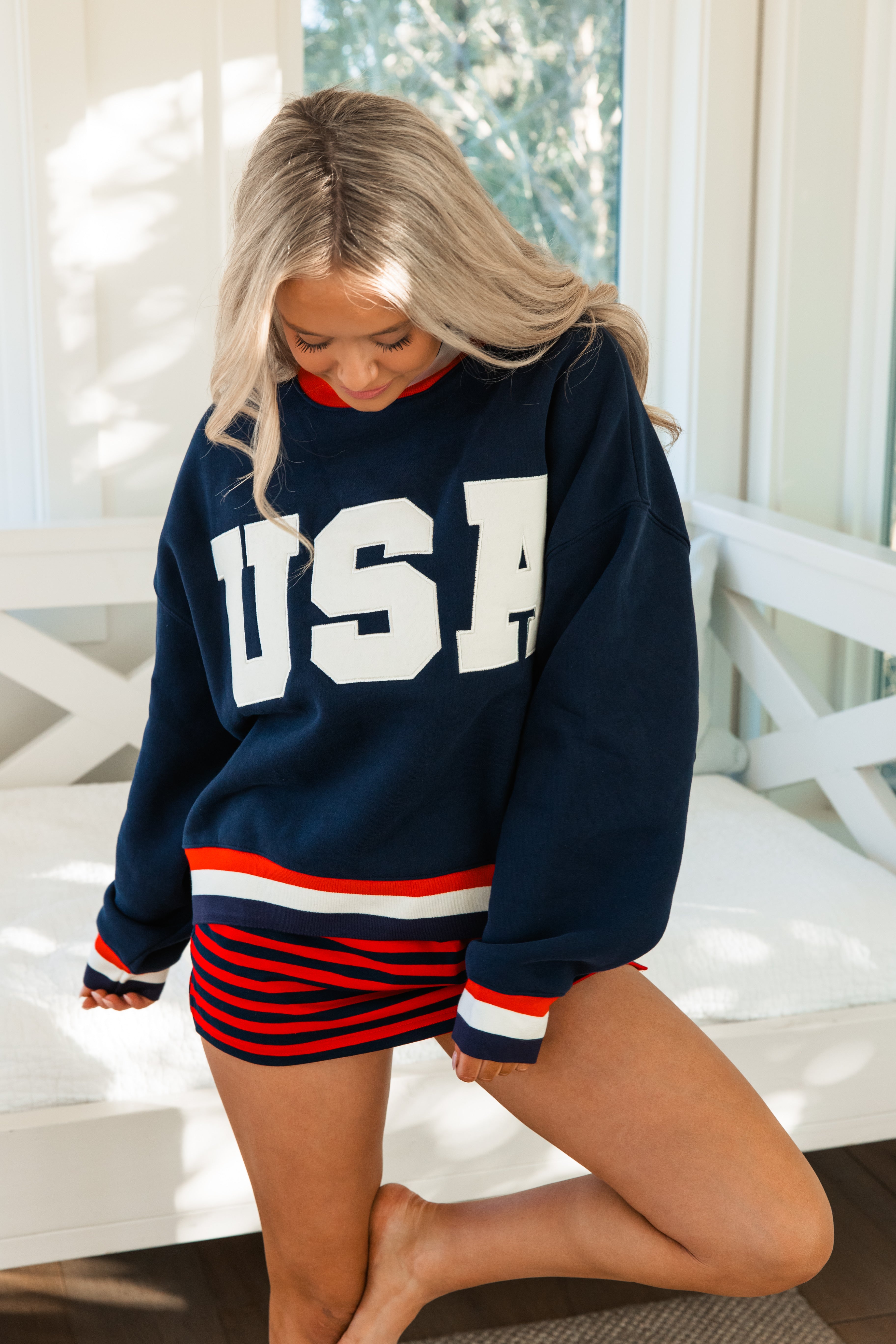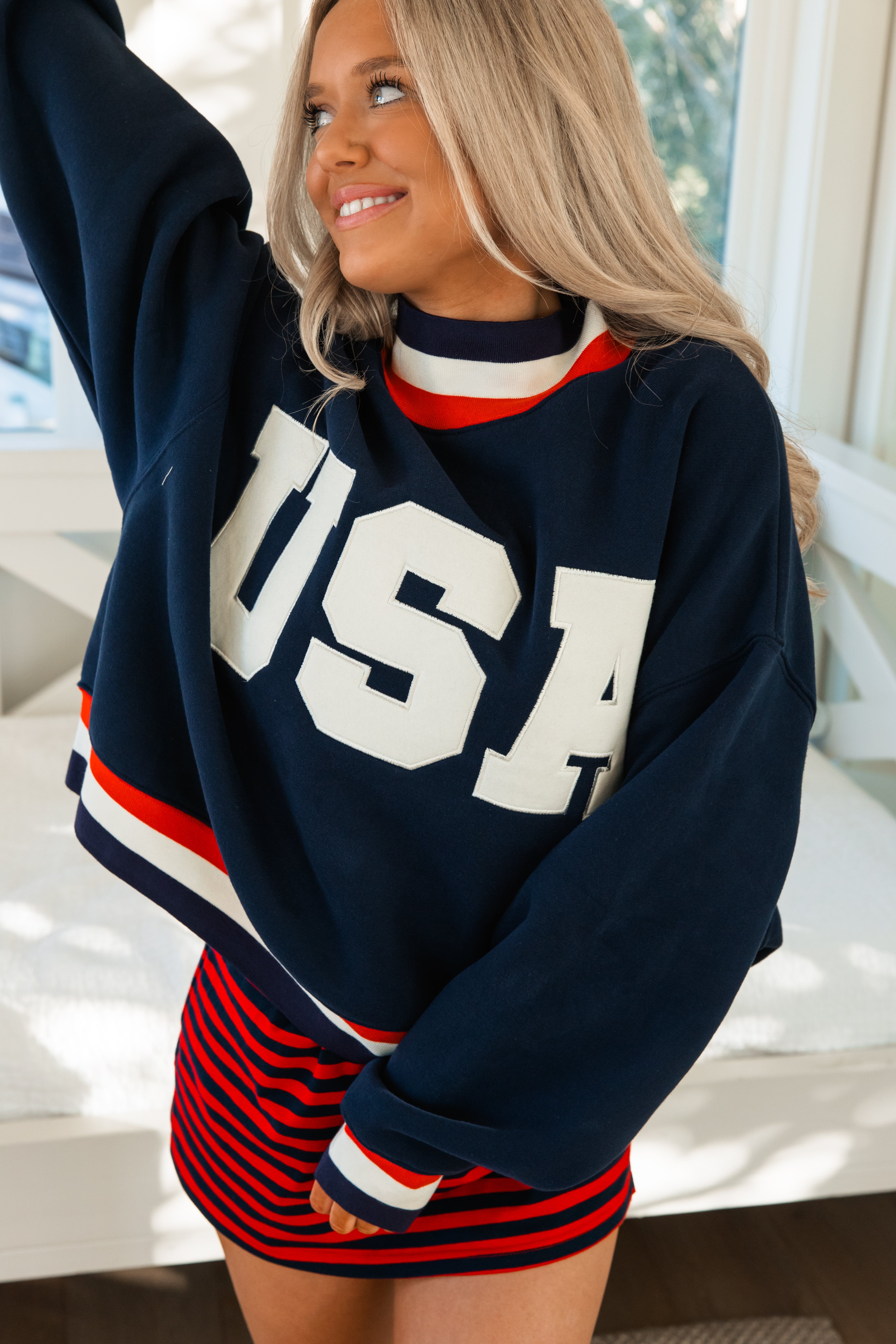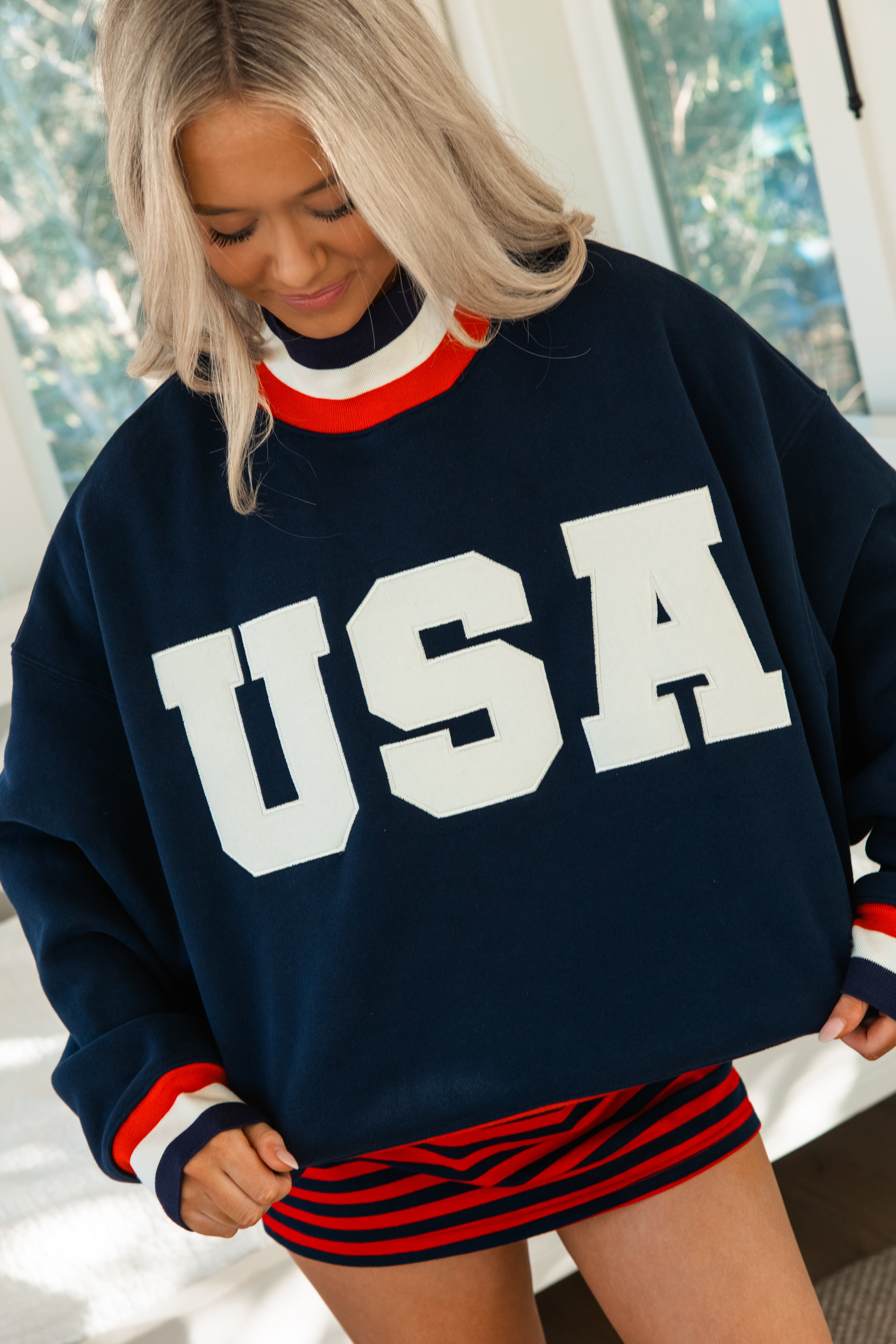 Varsity style oversized sweatshirt featuring bold varsity-style USA lettering across the front. Designed in a rich navy with classic red and white striped trim at the collar and cuffs for a sporty, timeless look. The relaxed fit makes it perfect for layering over dresses, skorts, or your favorite lounge set.