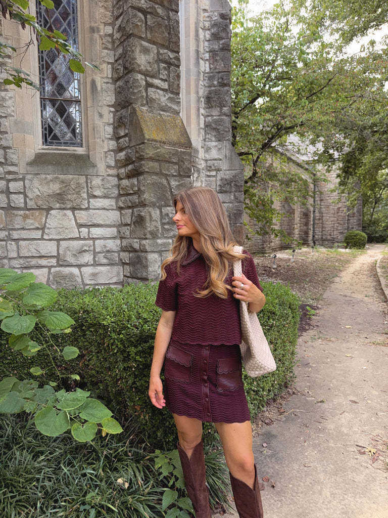 Beautifully crafted wavy knit textured high waist skirt featuring faux leather trim and scalloped edged front pockets with snap buttons down the front for an easy on.