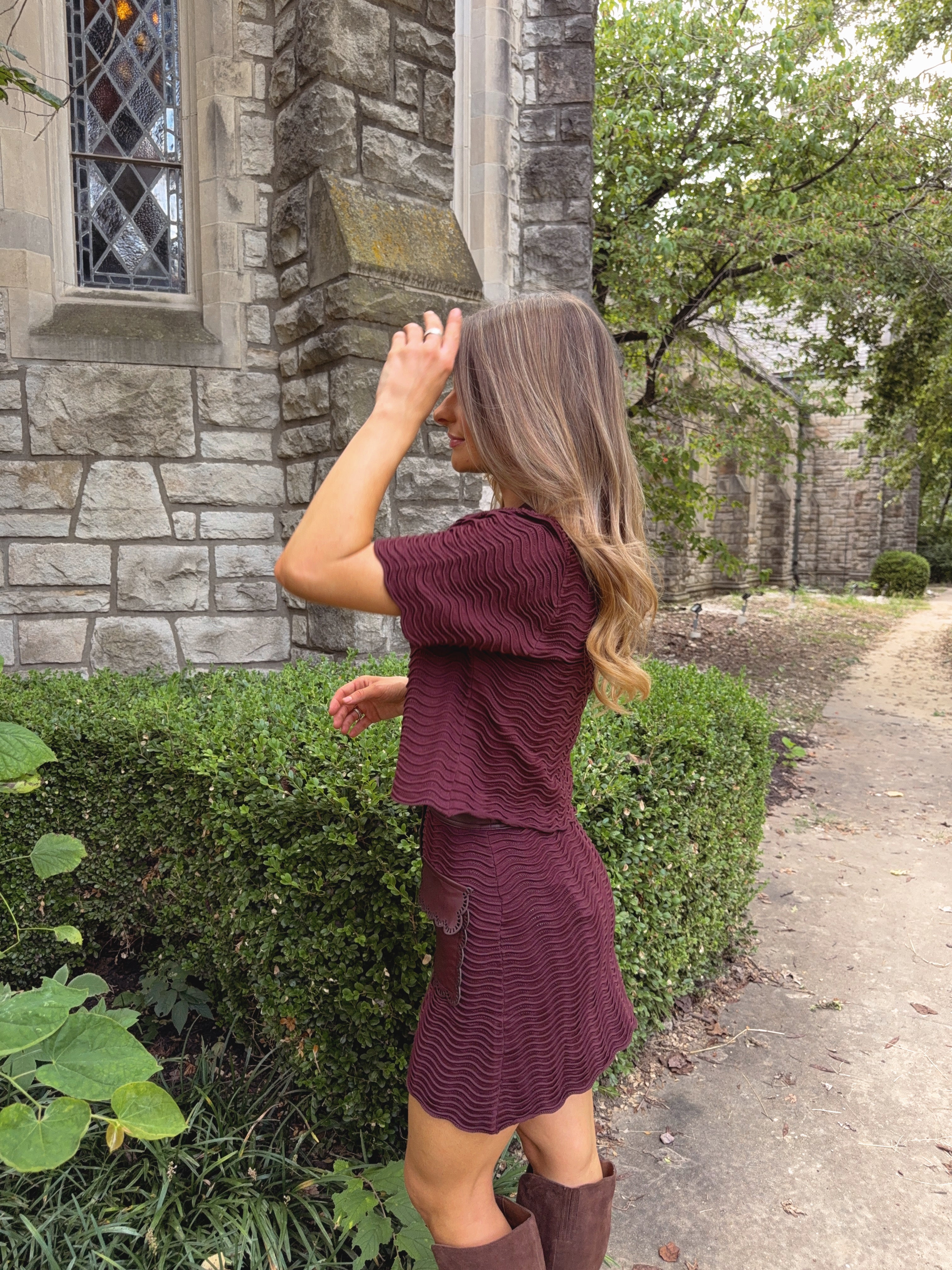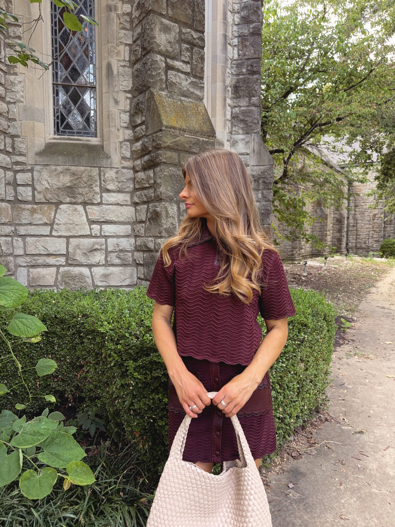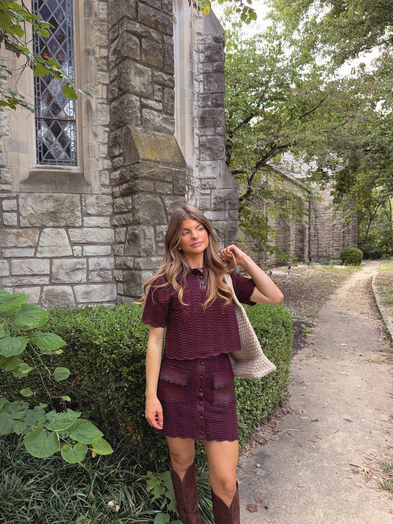 Beautifully crafted wavy knit textured top featuring a faux leather scalloped edged collar with snap button detail and a crop fit.