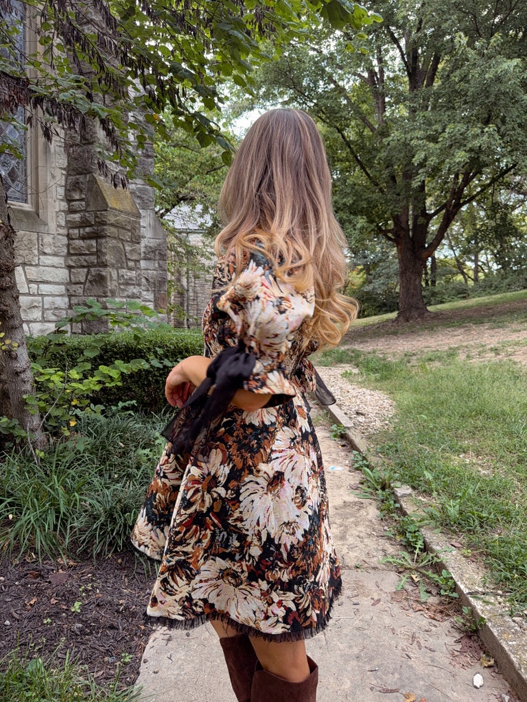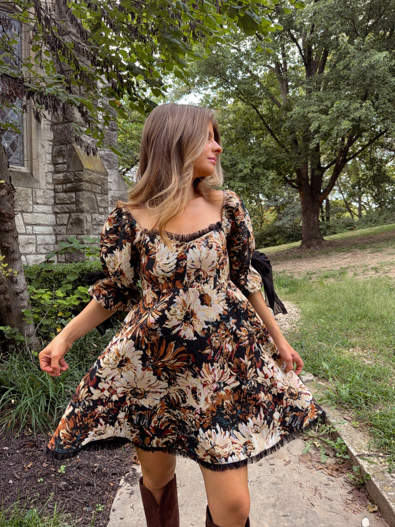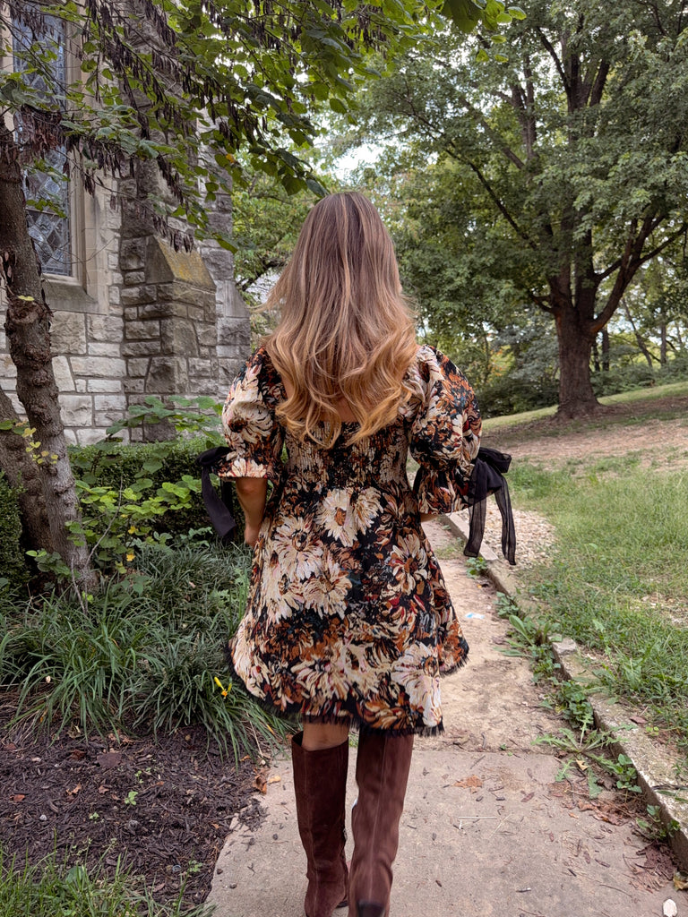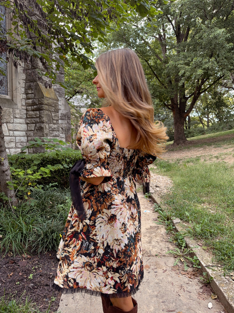 Floral tapestry babydoll dress featuring short puffy sleeves with bow detail and a smocked back for an easy on.