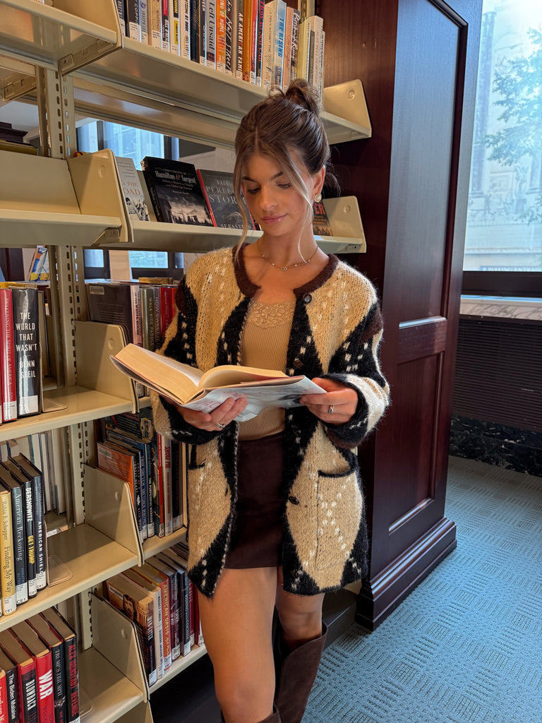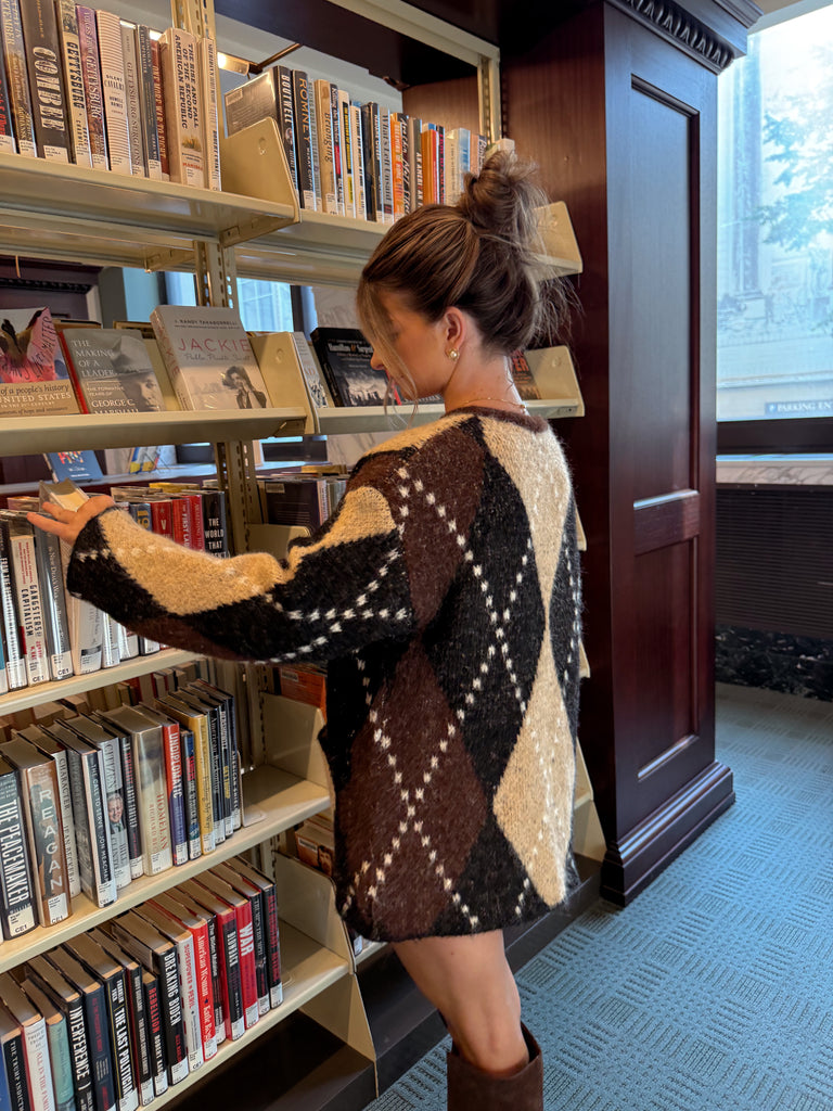 Argyle plaid jacquard knit cardigan sweater featuring a round neckline, wide long sleeves, drop shoulder, front button closure with leather-look braided buttons.