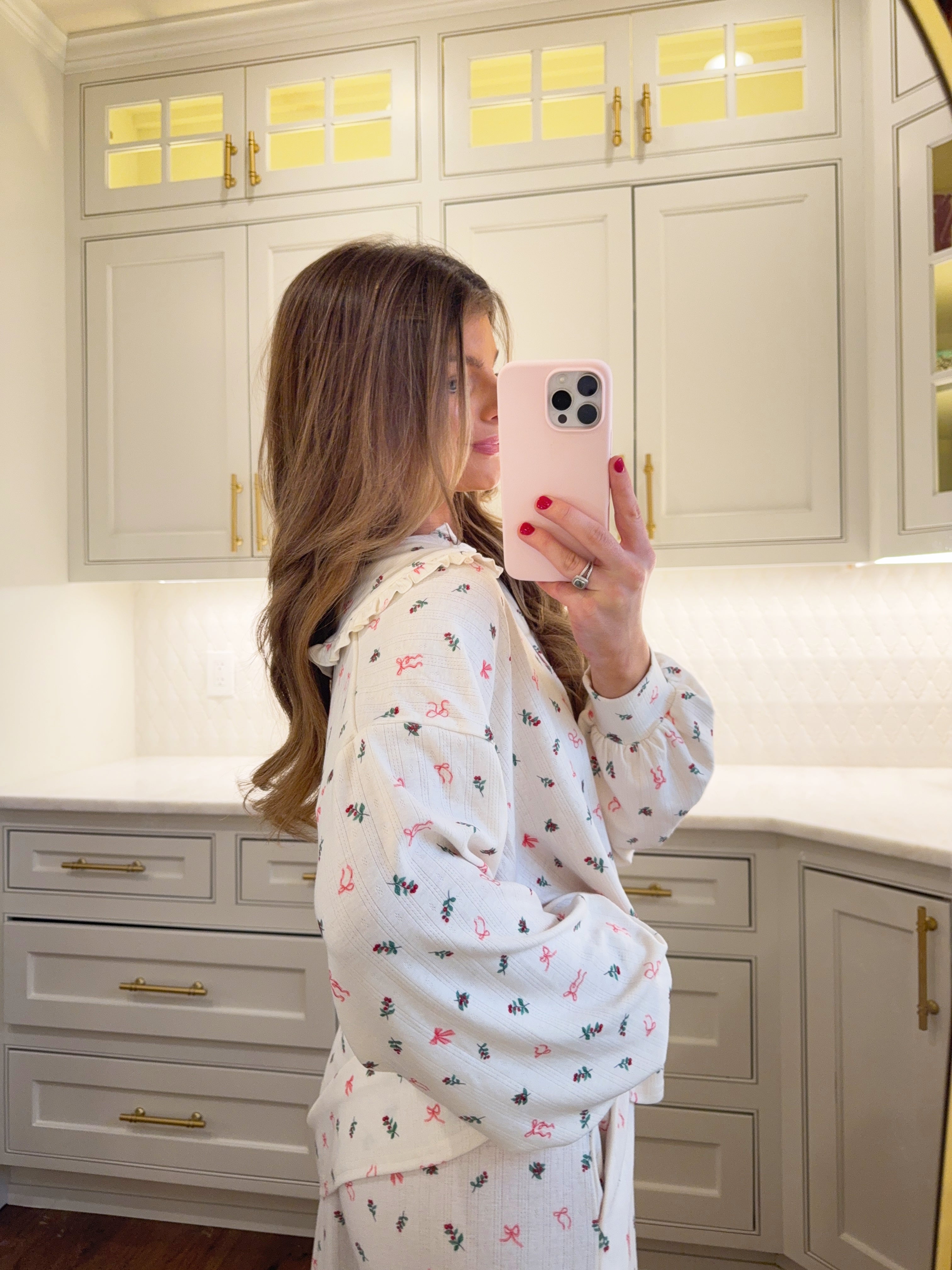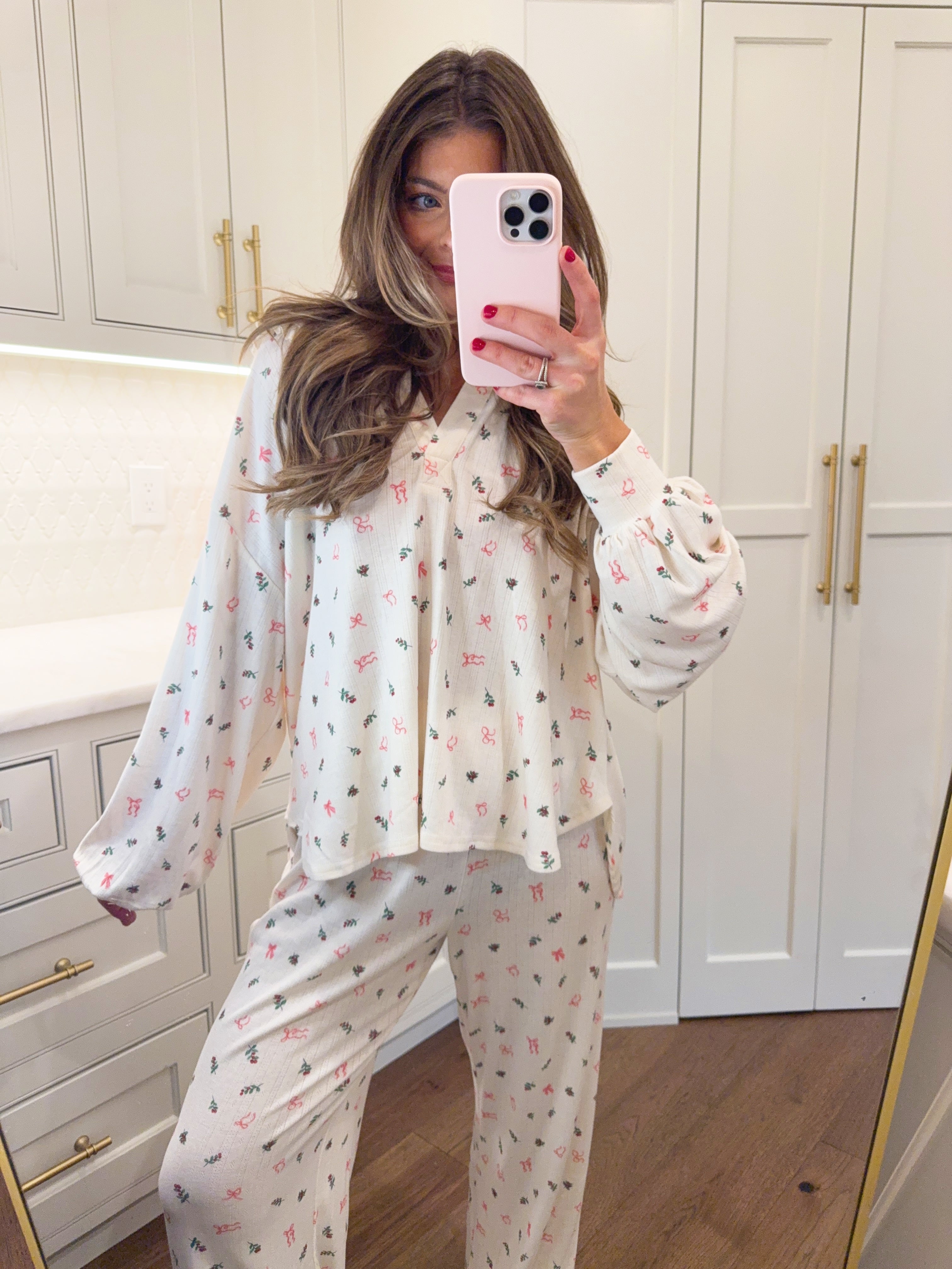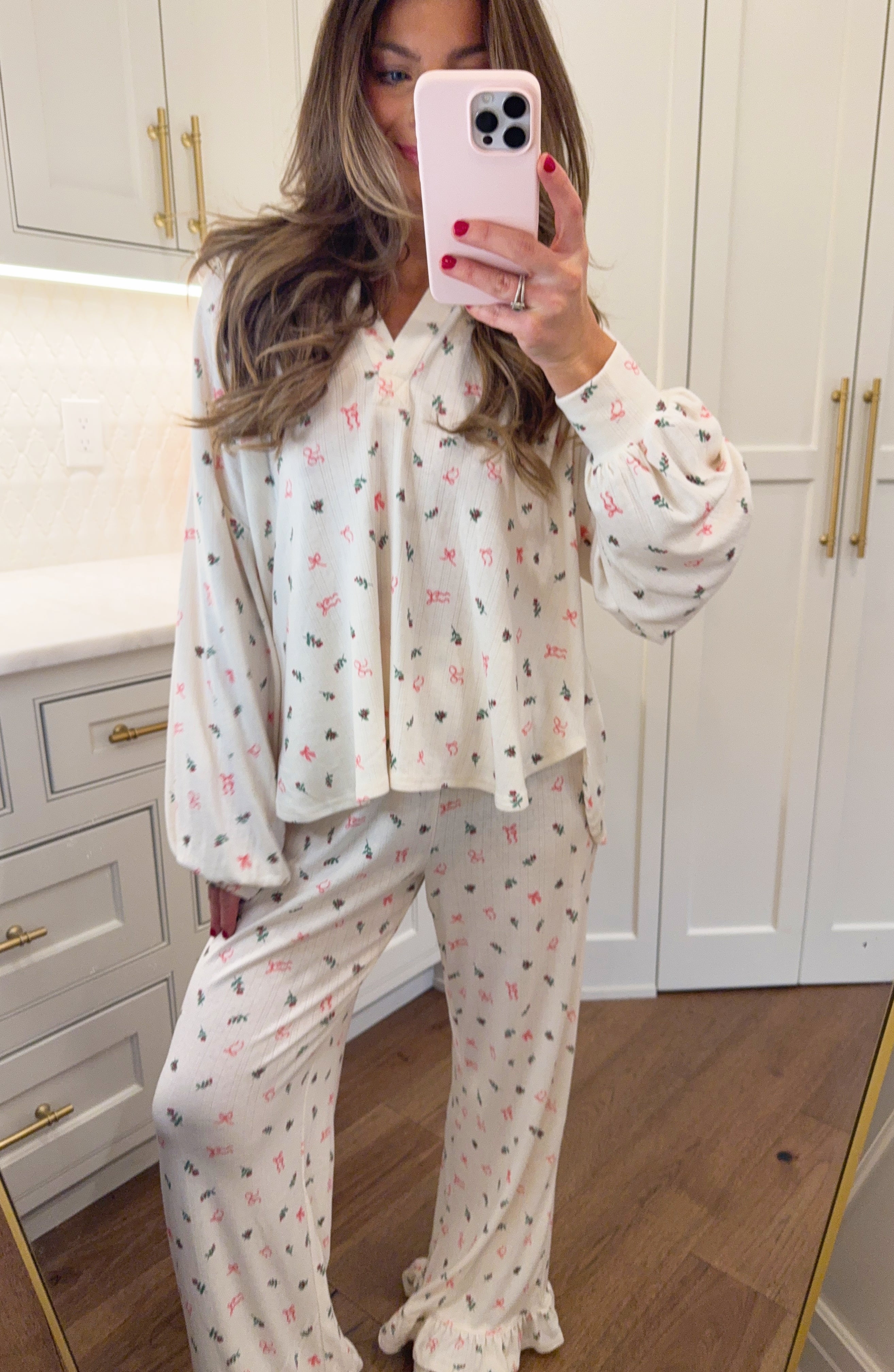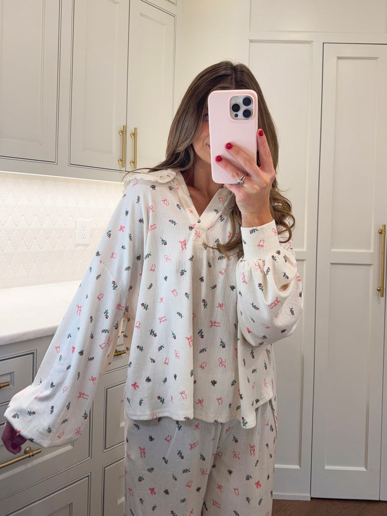 The Fruitcake Pajama Set features a sweet, subtle mistletoe-and-bows motif dancing across a soft, stretchy pointelle rib. Designed for peak comfort and cuteness, the top offers a relaxed silhouette with a feminine doll collar, paired with high-rise elasticized lounge pants finished with a delicate ruffled hem. A festive, cozy set made for slow mornings and holiday magic.