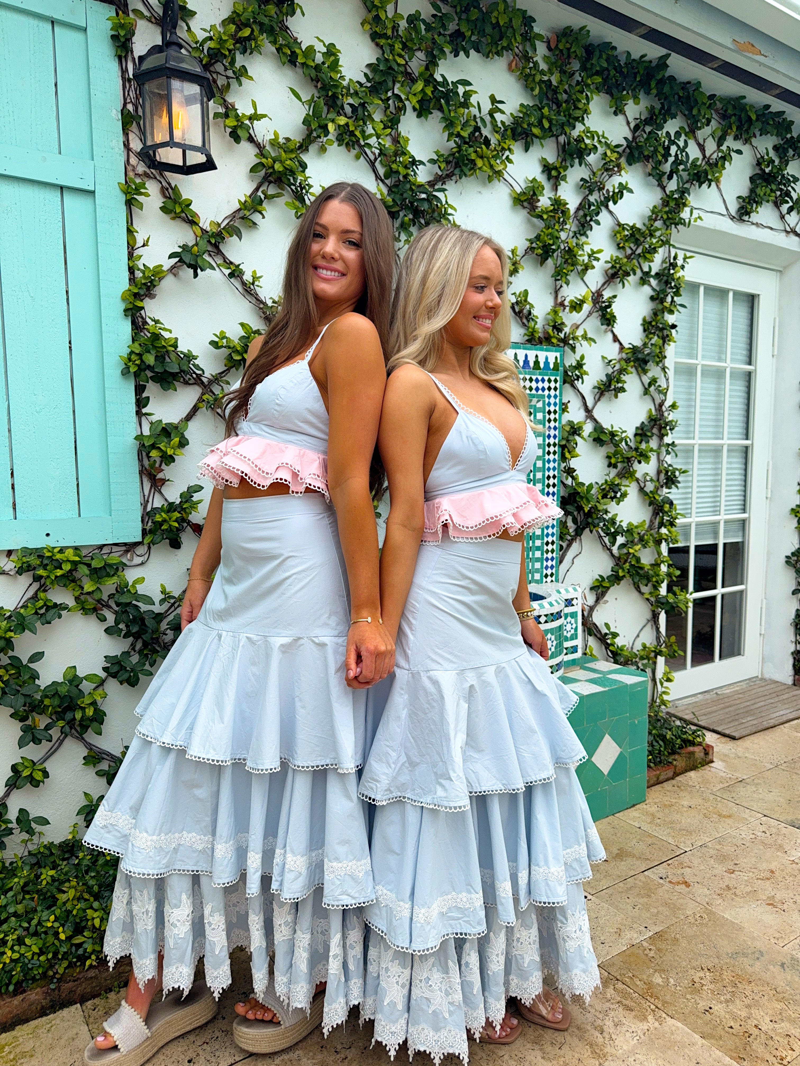Introducing the Lottie Top (pair with our Lottie Skirt). This effortless femme top features adjustable spaghetti shoulder straps lined with a scallop lace trim. The v-neckline is complimented by a double layer of bouncy ruffles. Both sides meet to a double button in the back.