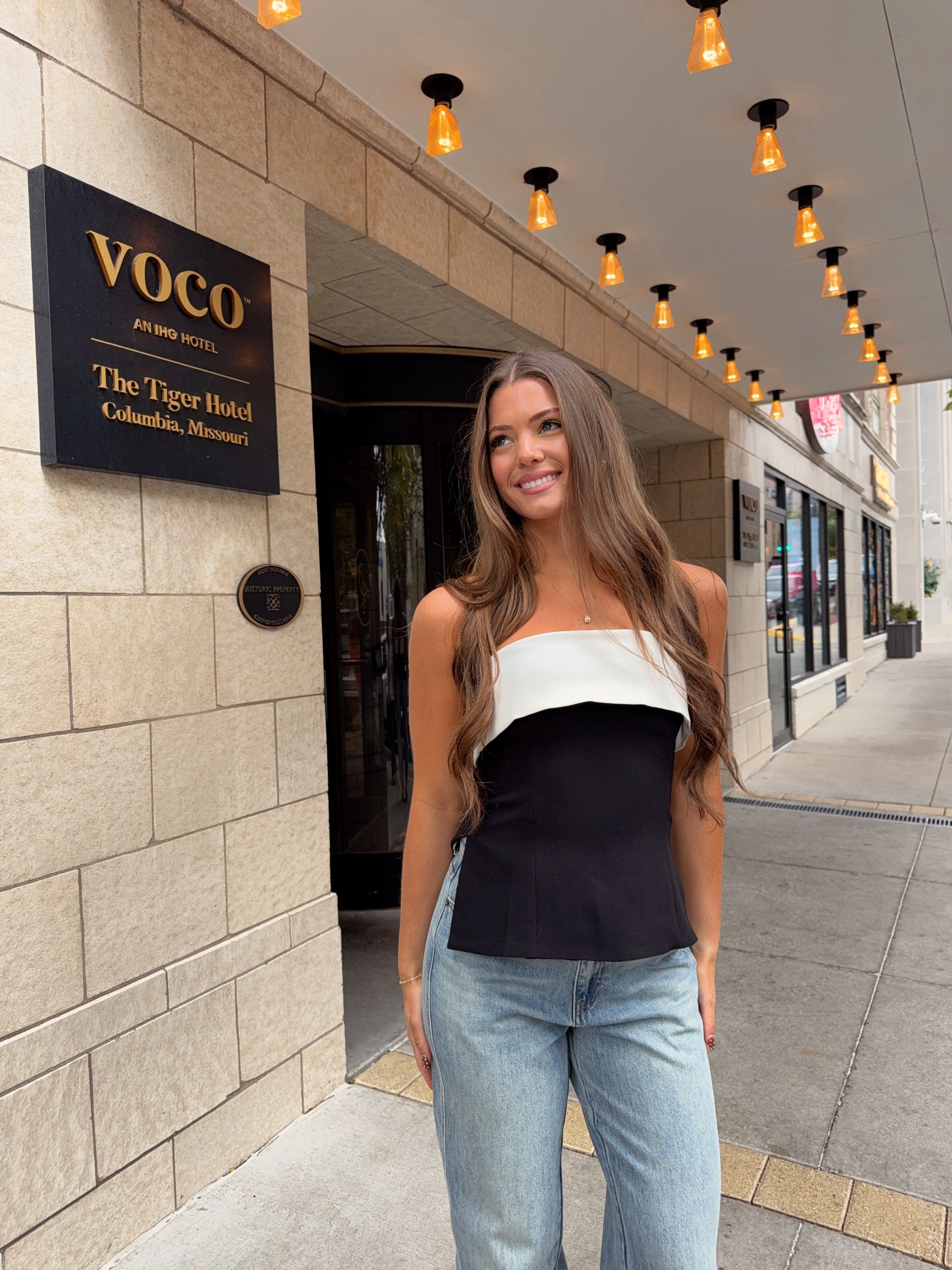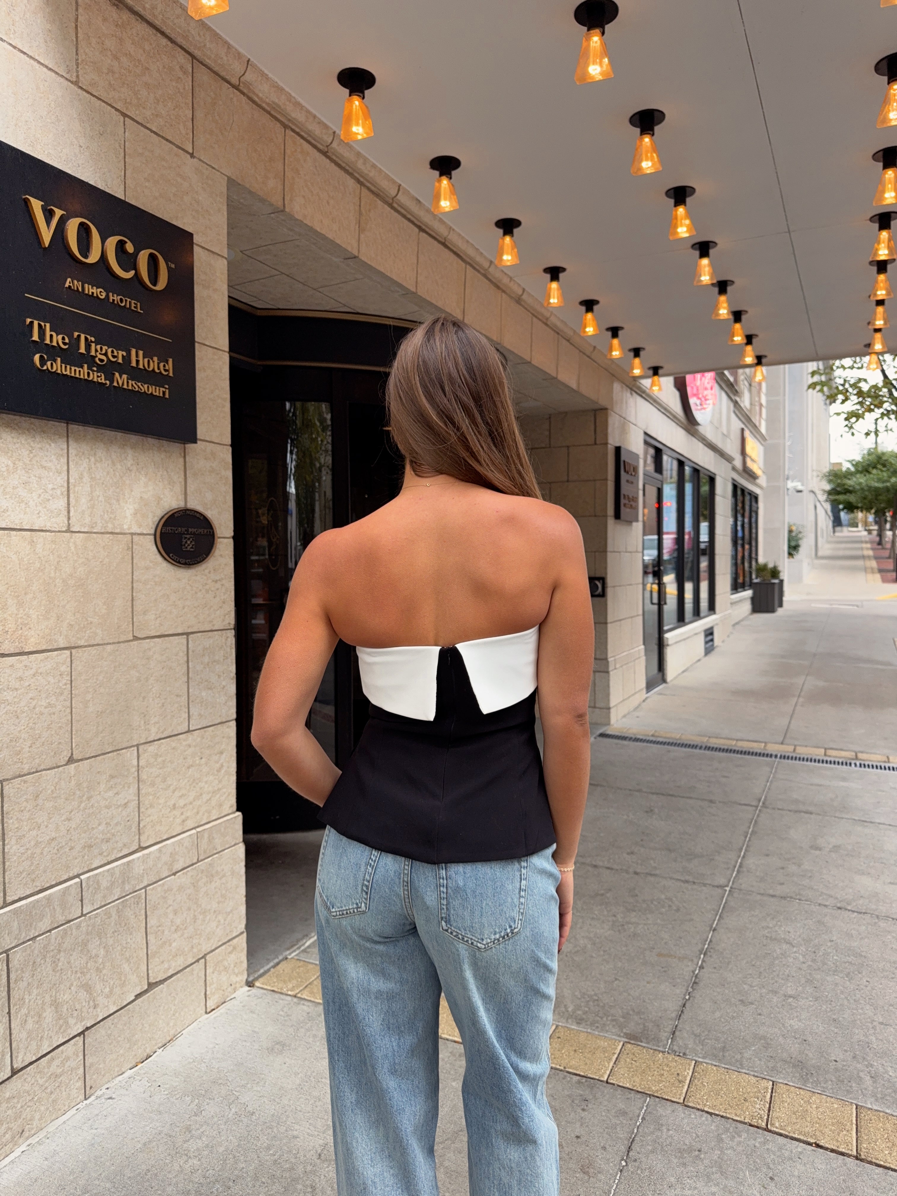 The structured fit subtly sculpts the waist, while the strapless neckline keeps things feminine and refined. Pair it with denim for a cool off-duty vibe or dress it up with tailored pants for an elevated evening moment.