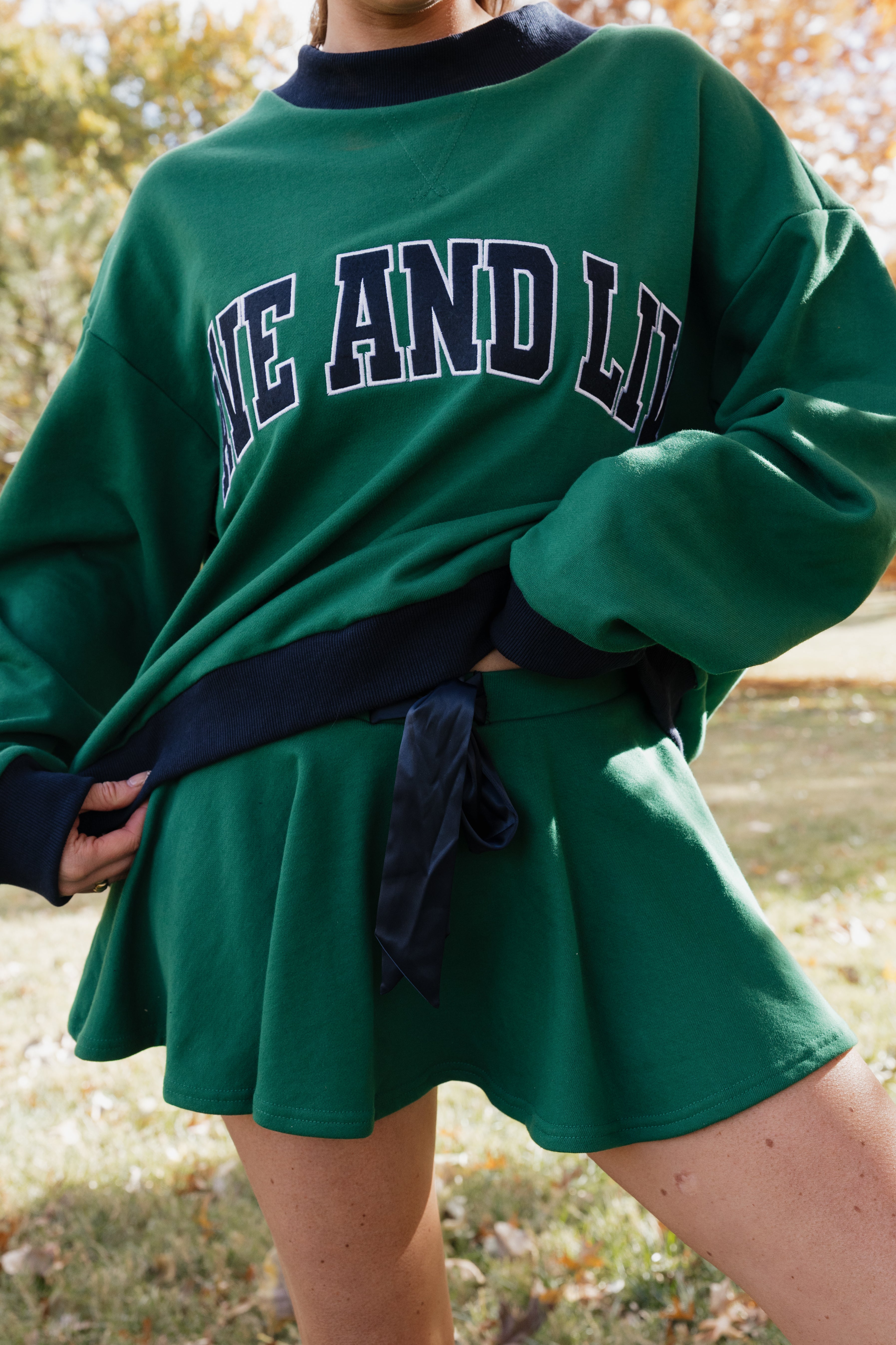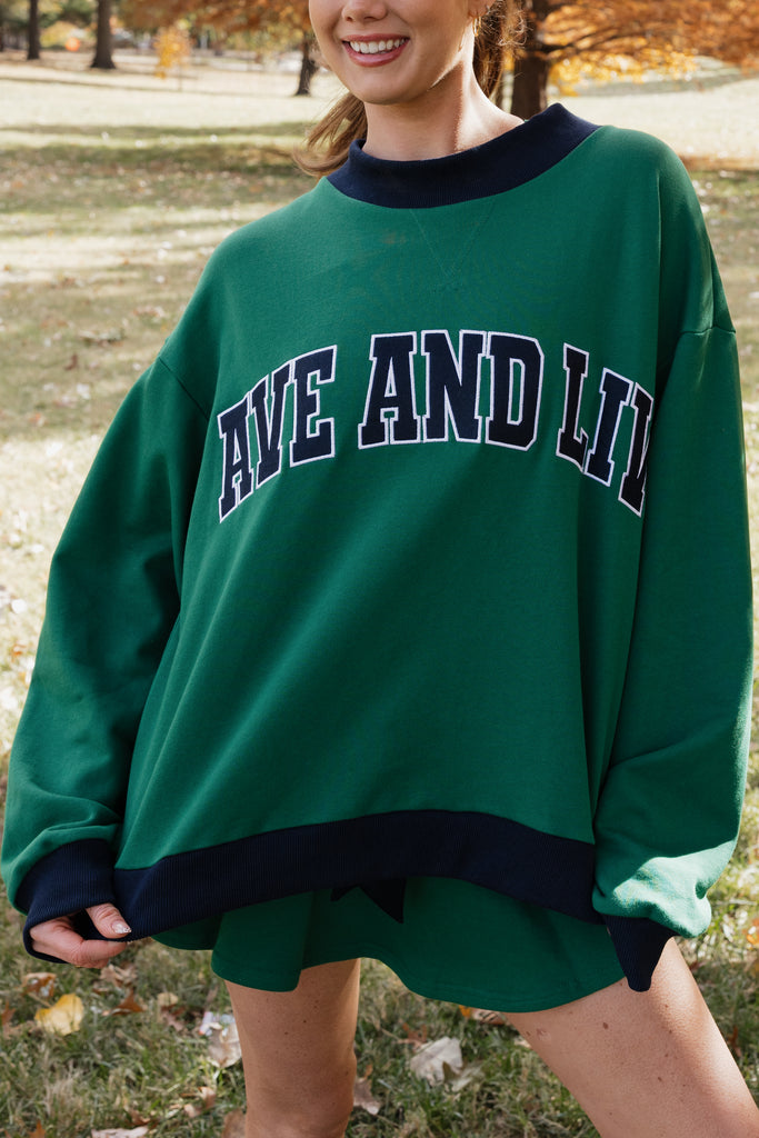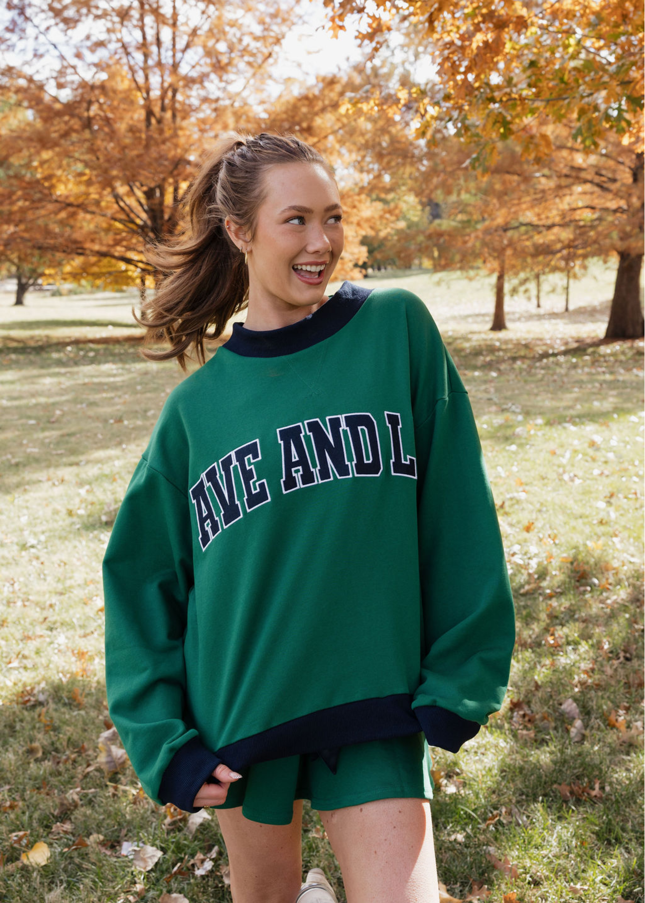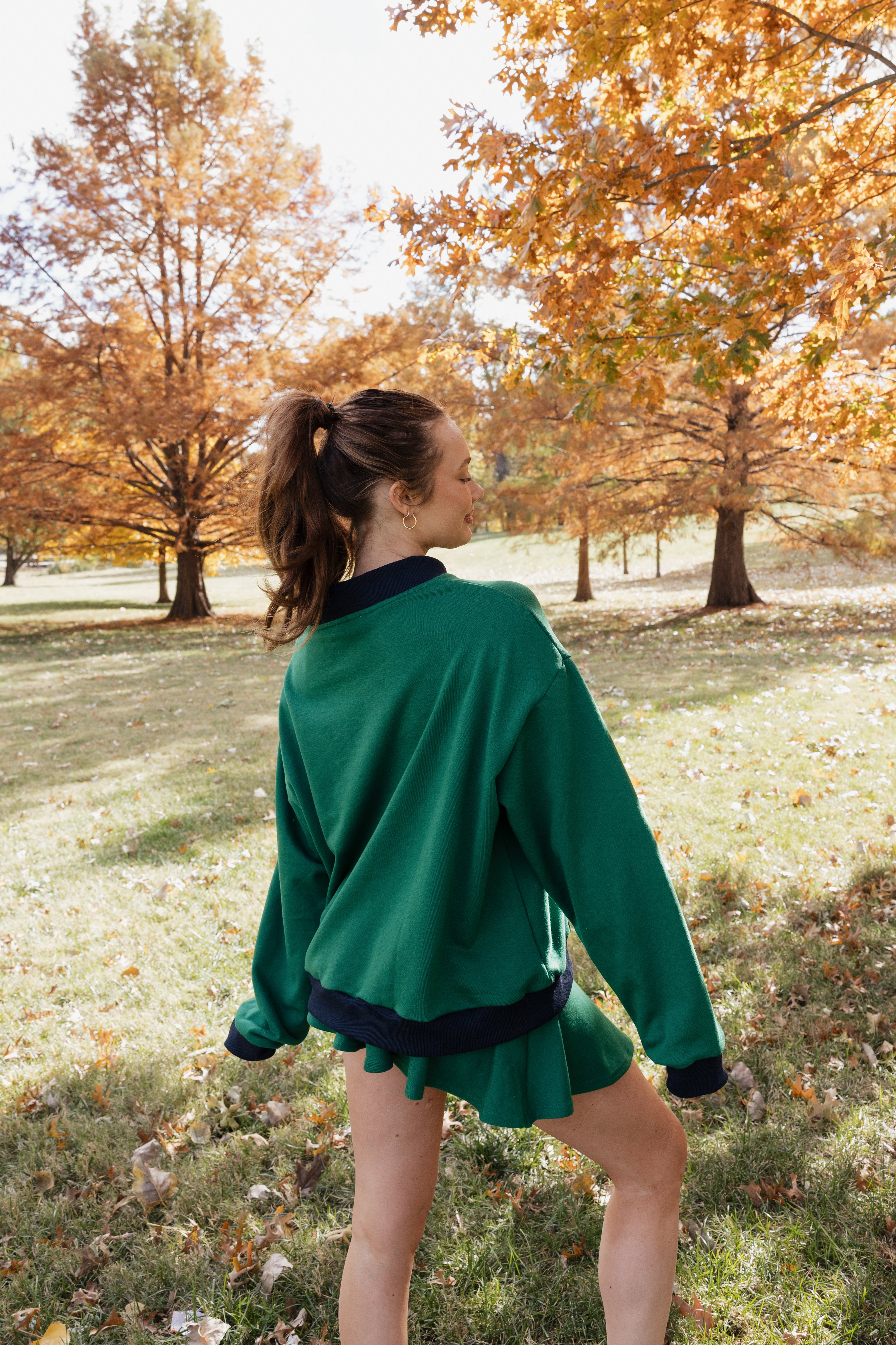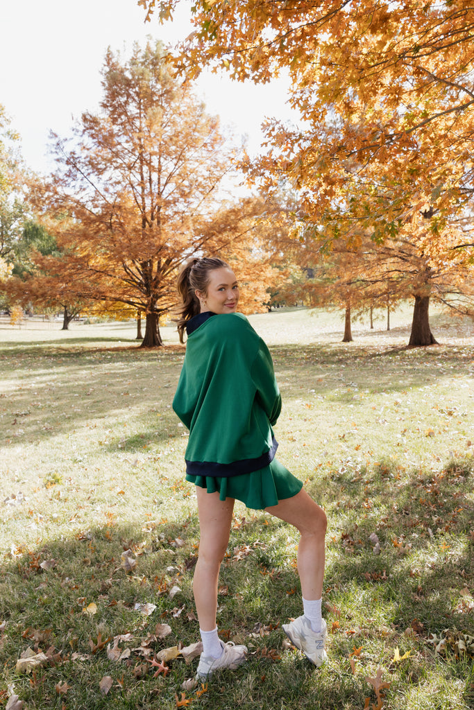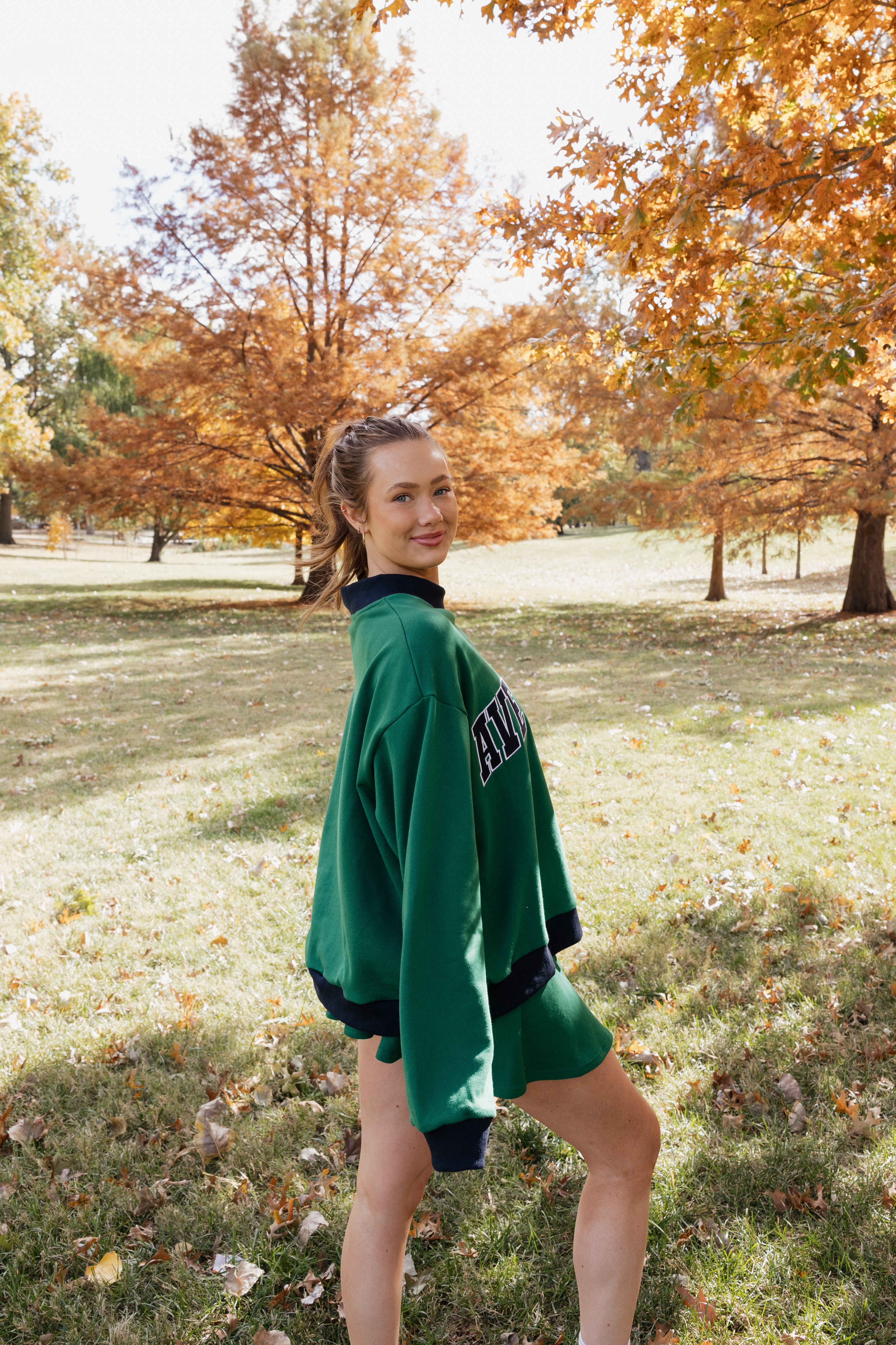 Oversized mockneck sweatshirt featuring a two tone Emerald and Sapphire color combo.