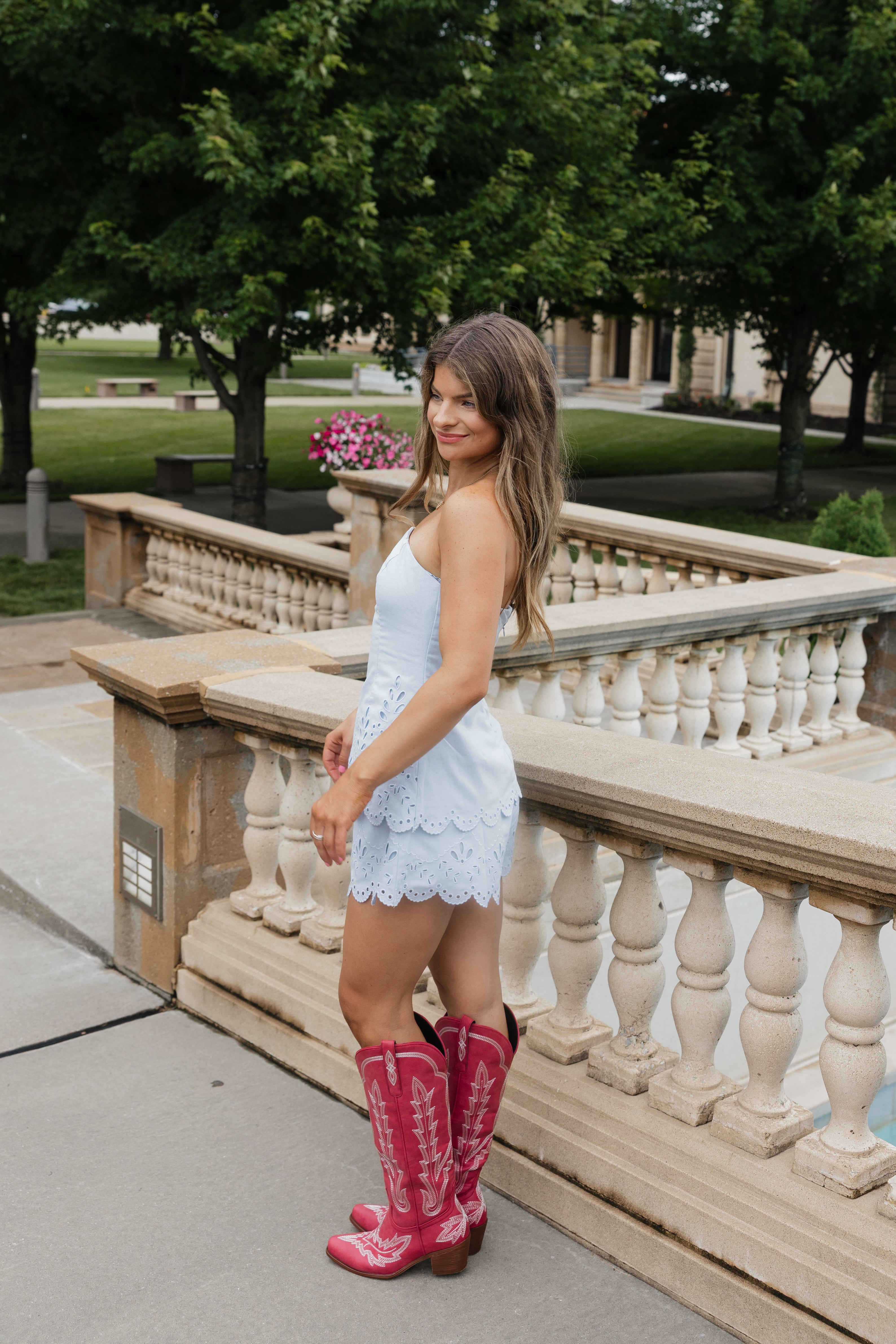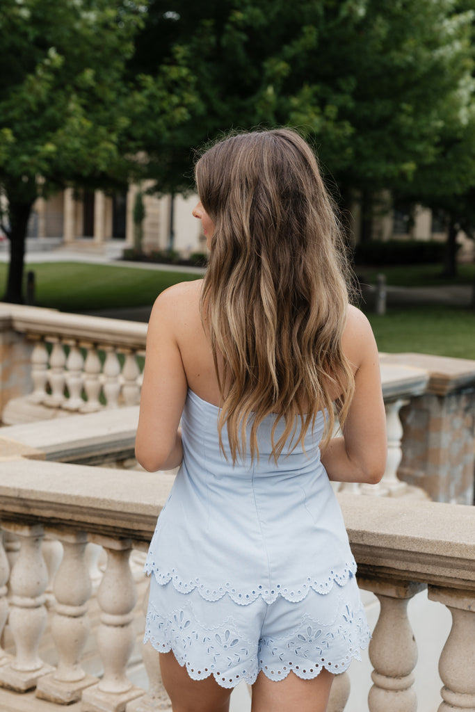 Introducing the Estelle Set. Take your Gameday outfit to the next level with this strapless tube top with a chic scallop hem and matching high waisted shorts. Each piece is finished with a zipper.