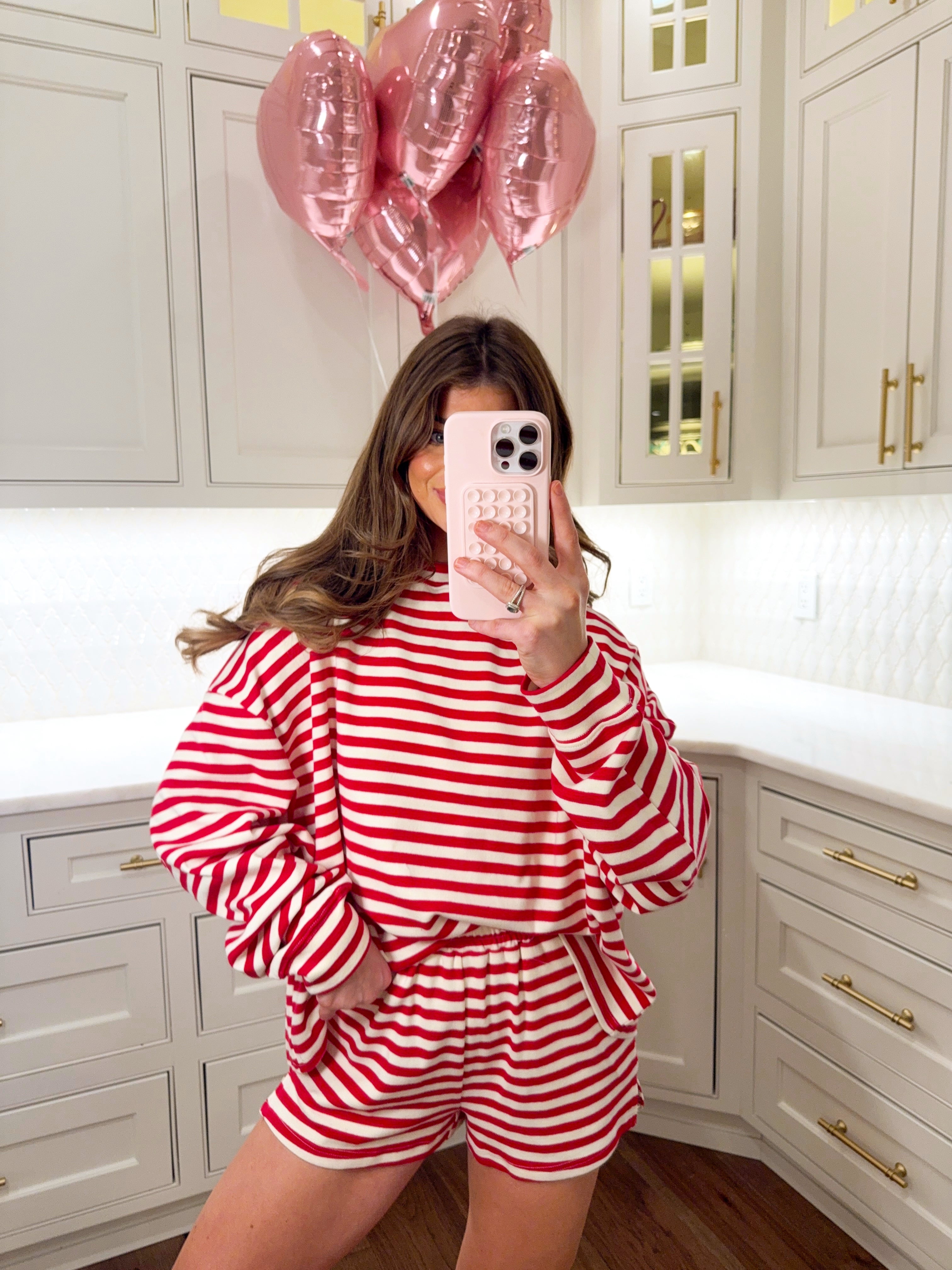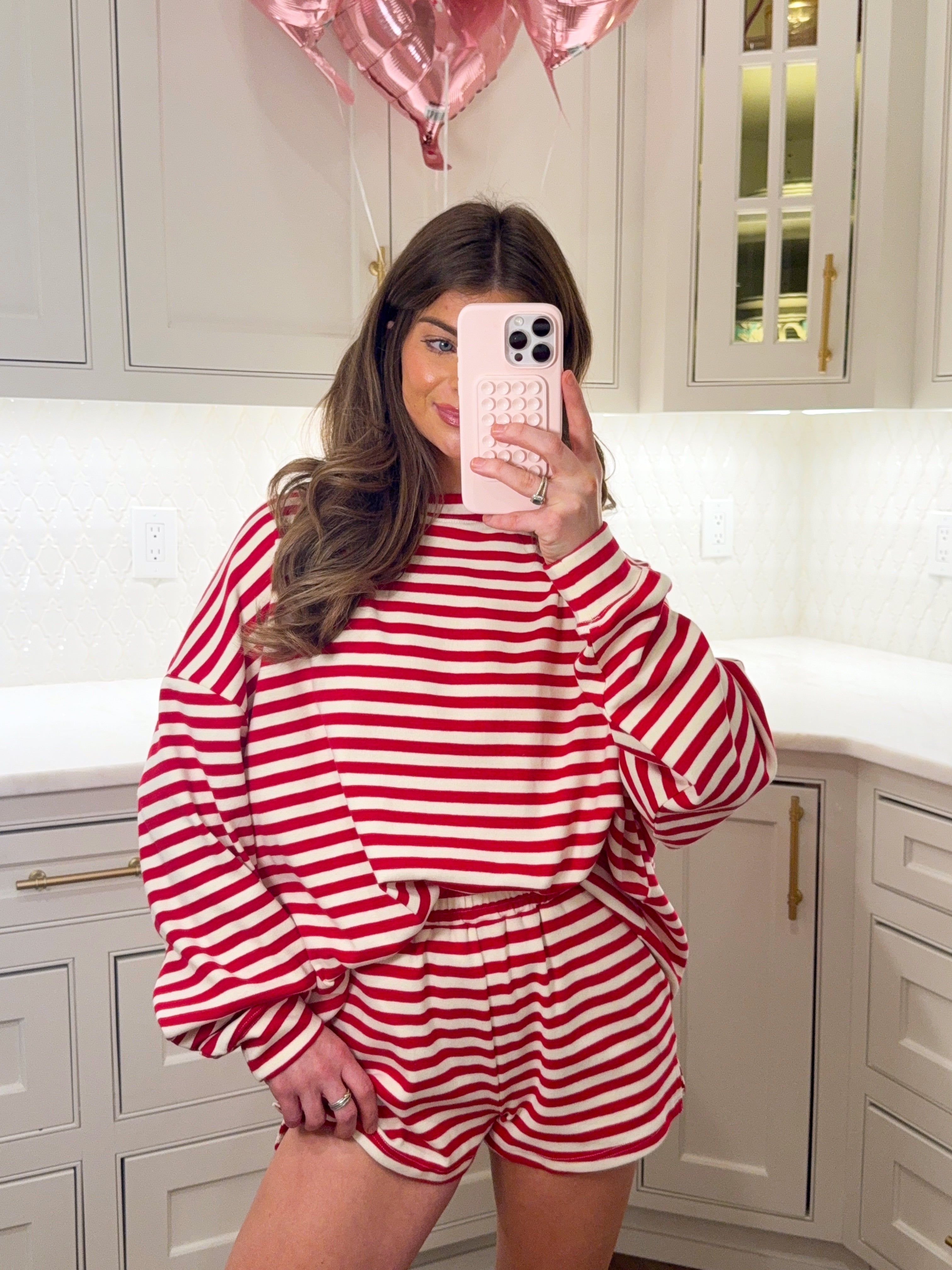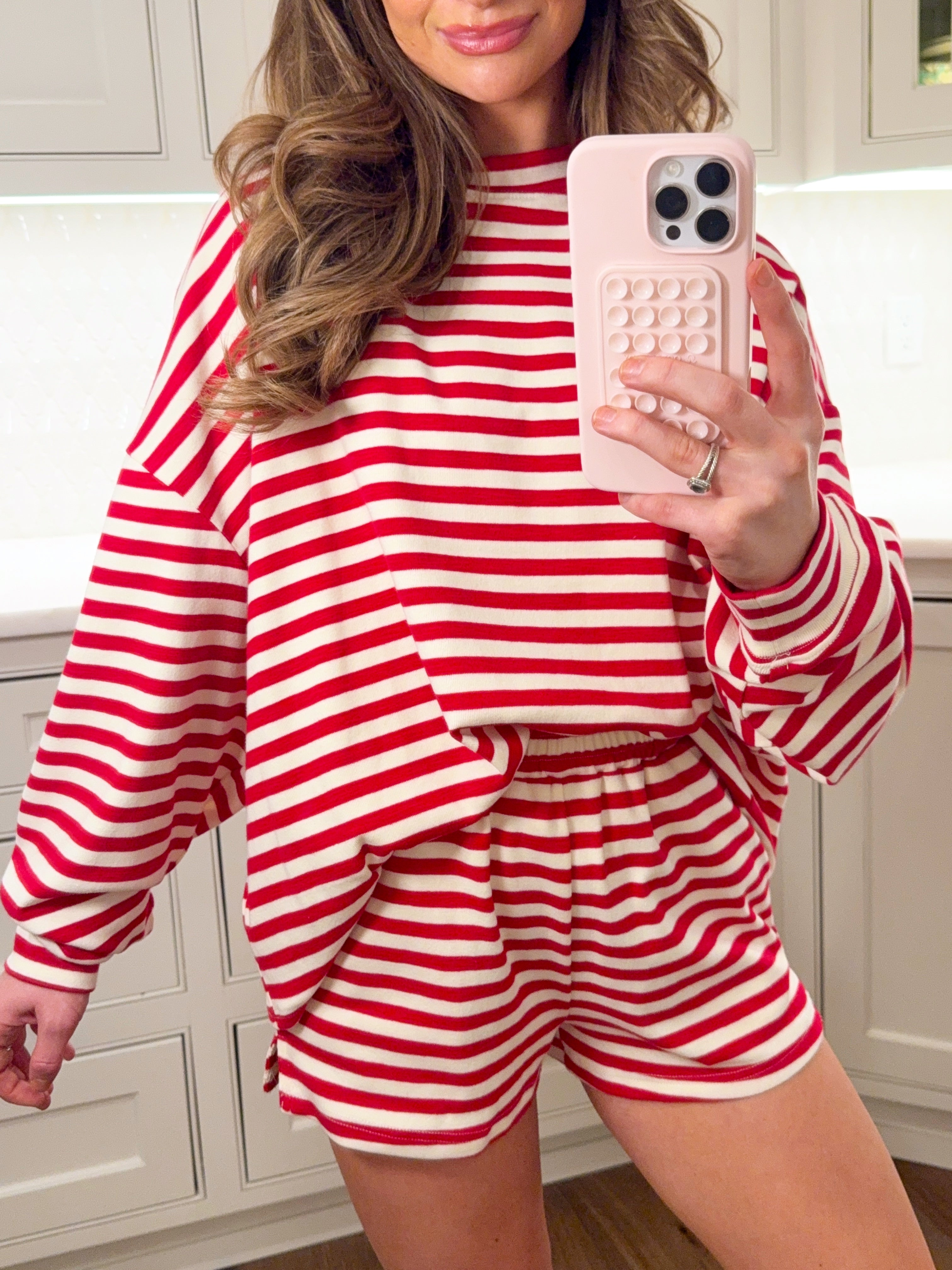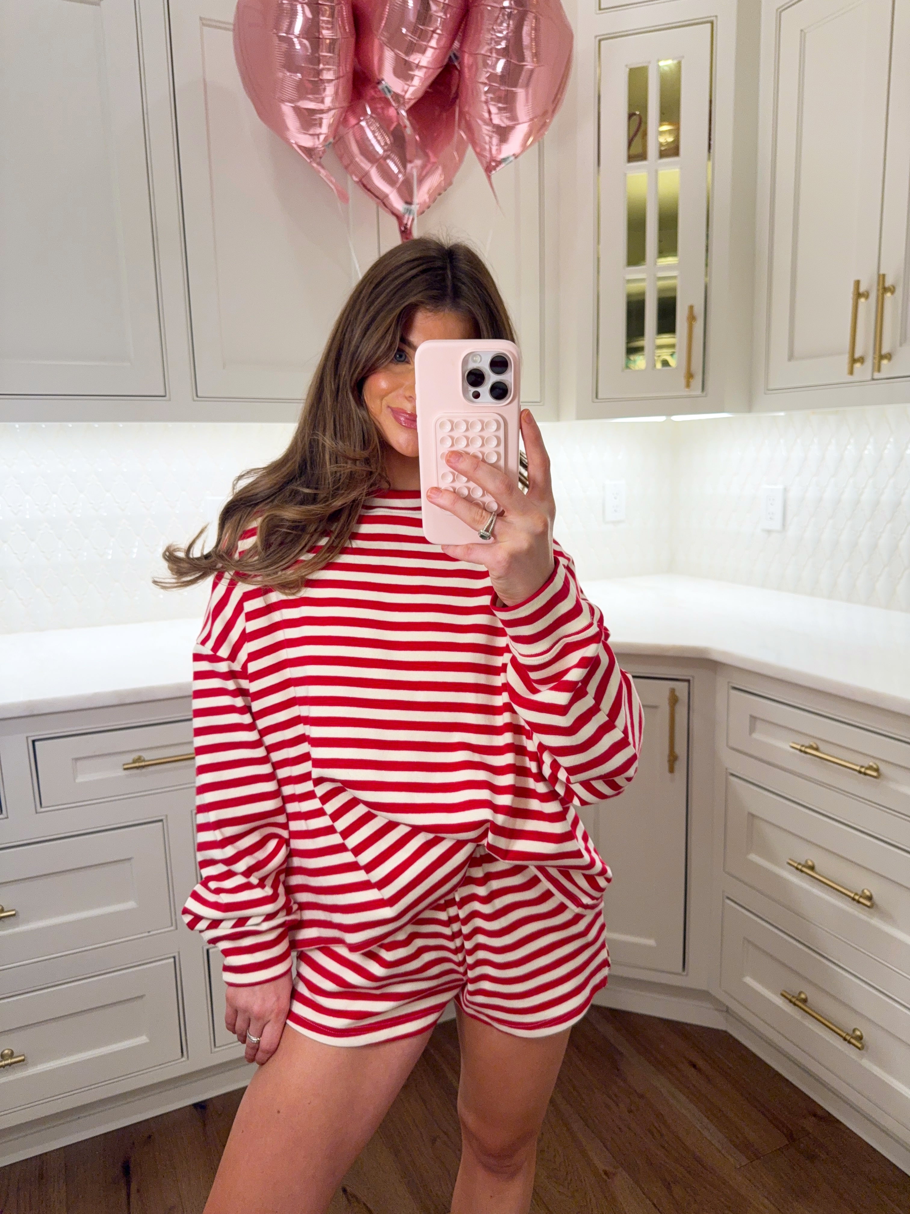 Striped drop shoulders relaxed top and high rise shorts featuring an elastic waist