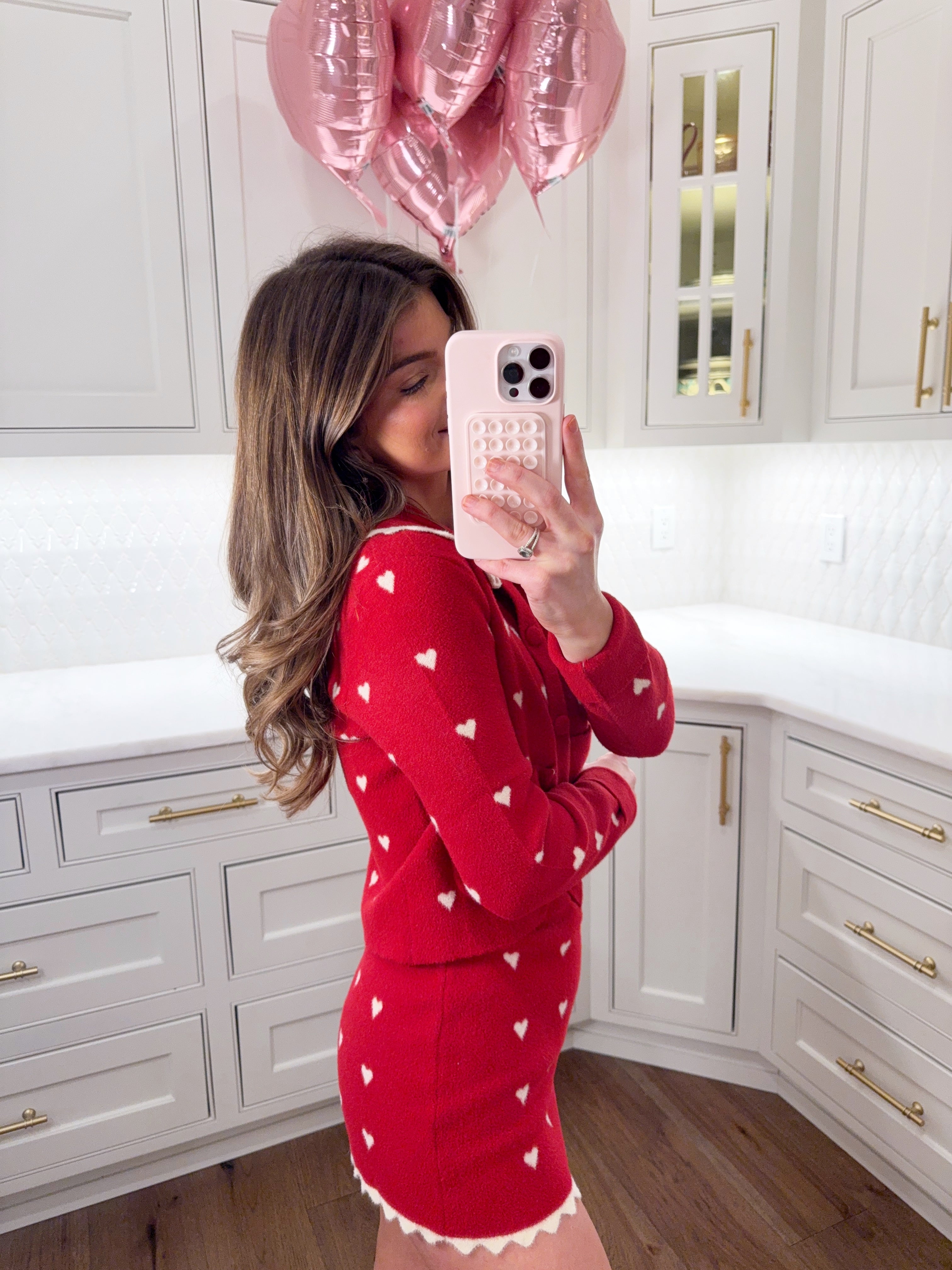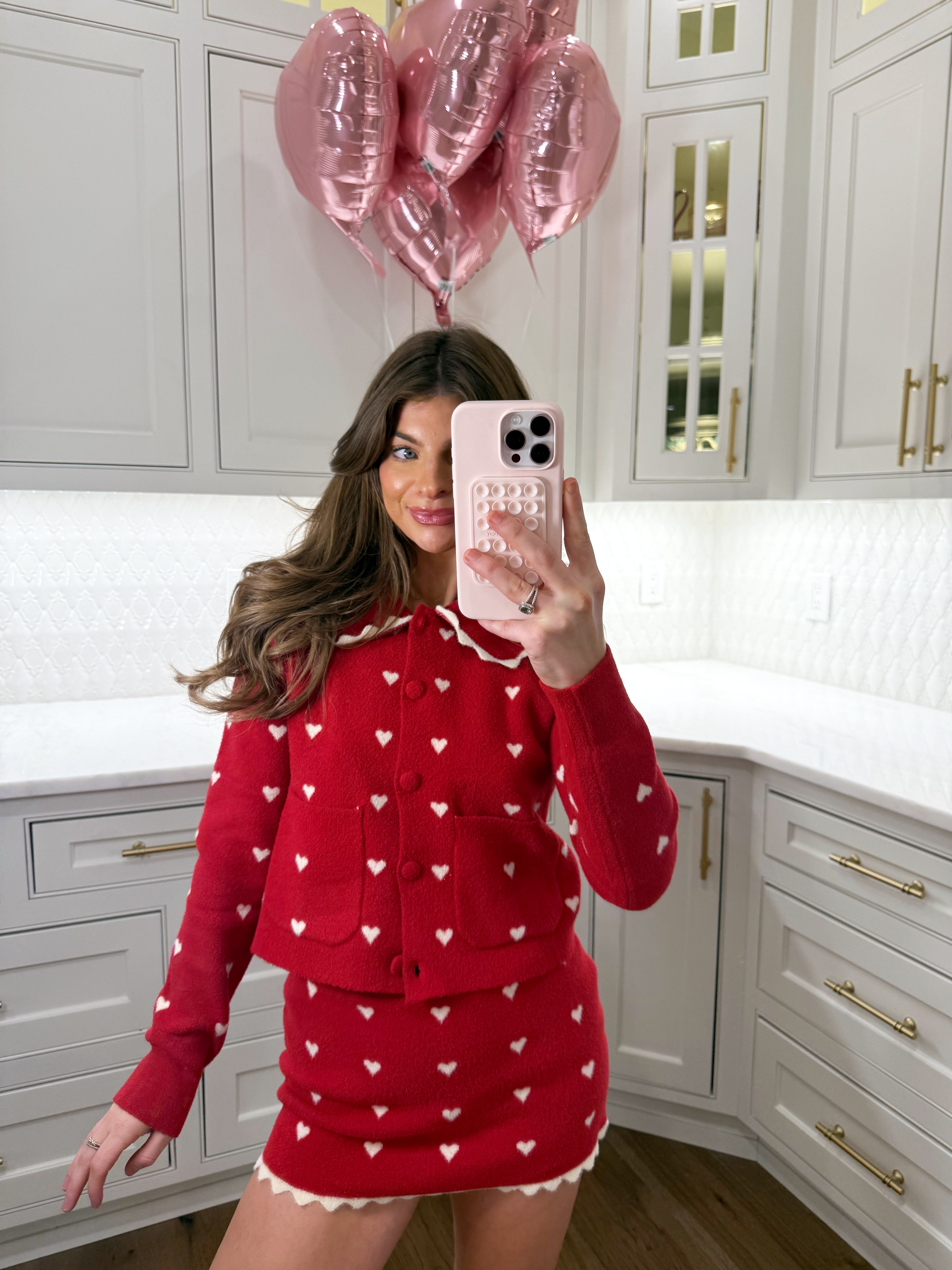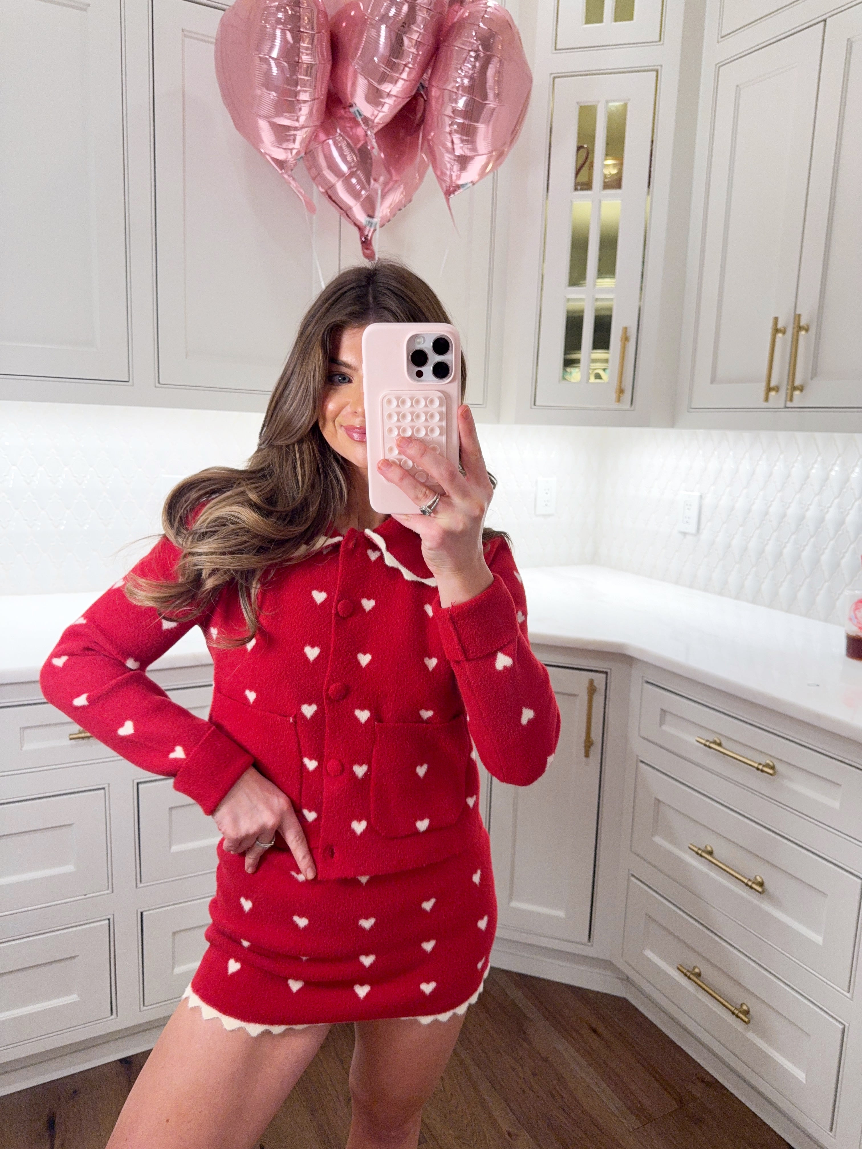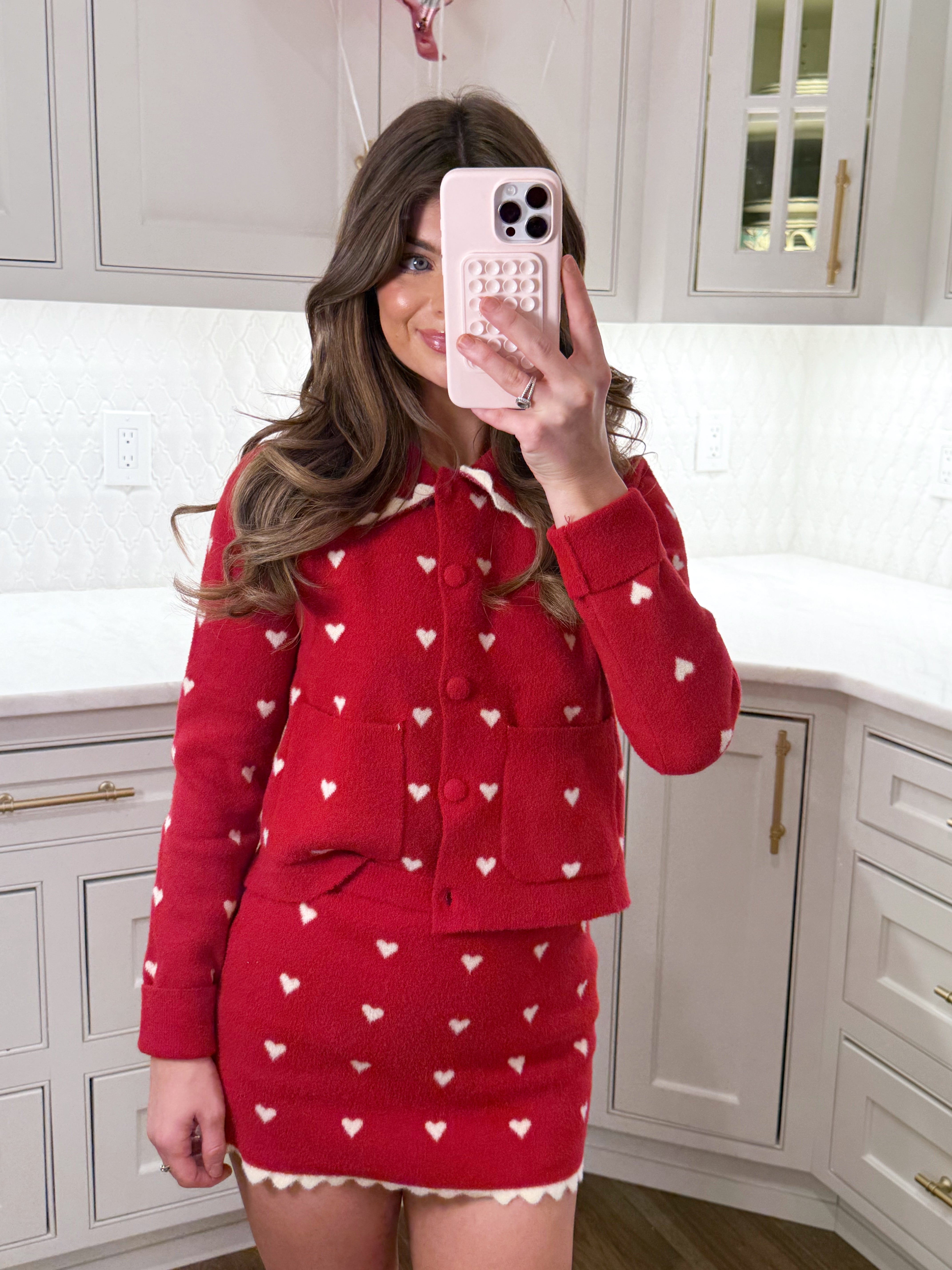 Heart print knit set featuring a button front sweater with a scallop shape lace trim, patched pockets, and a high waist fitted mini skirt.