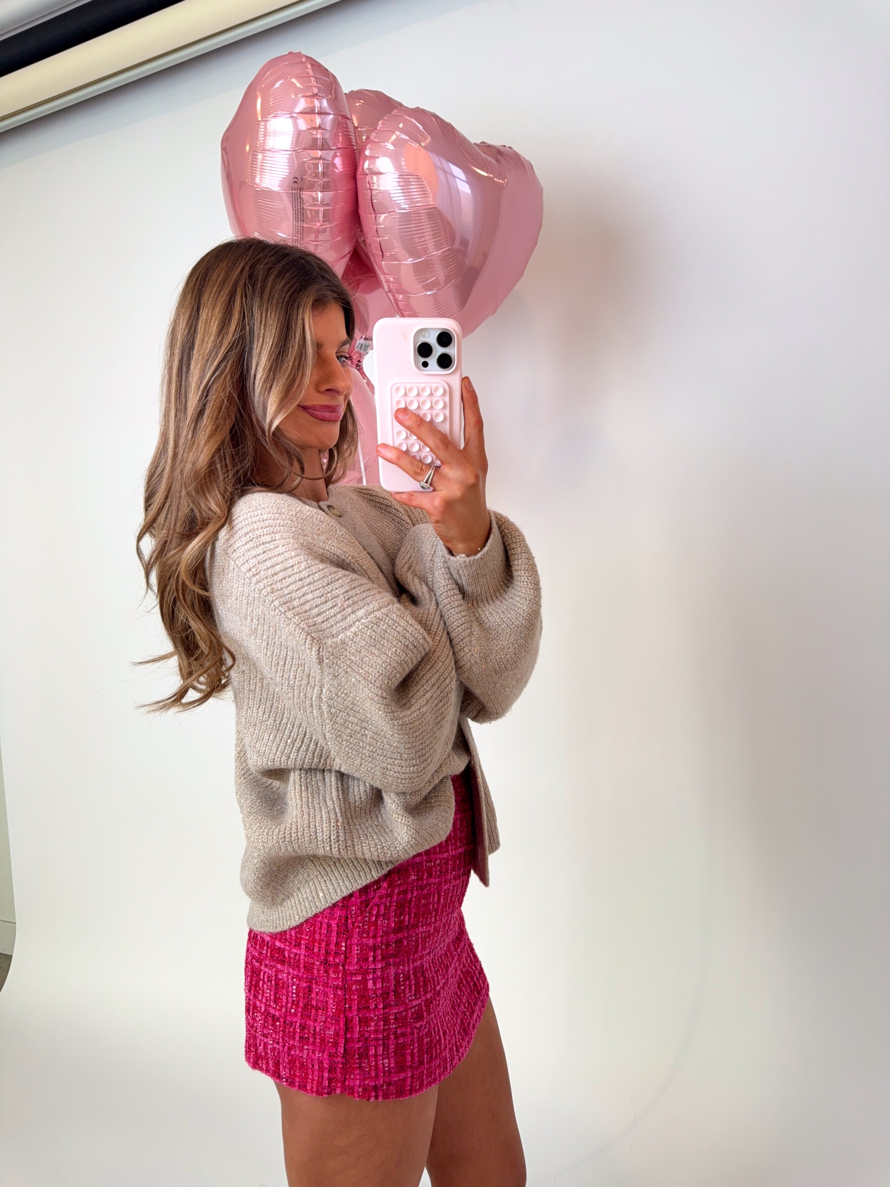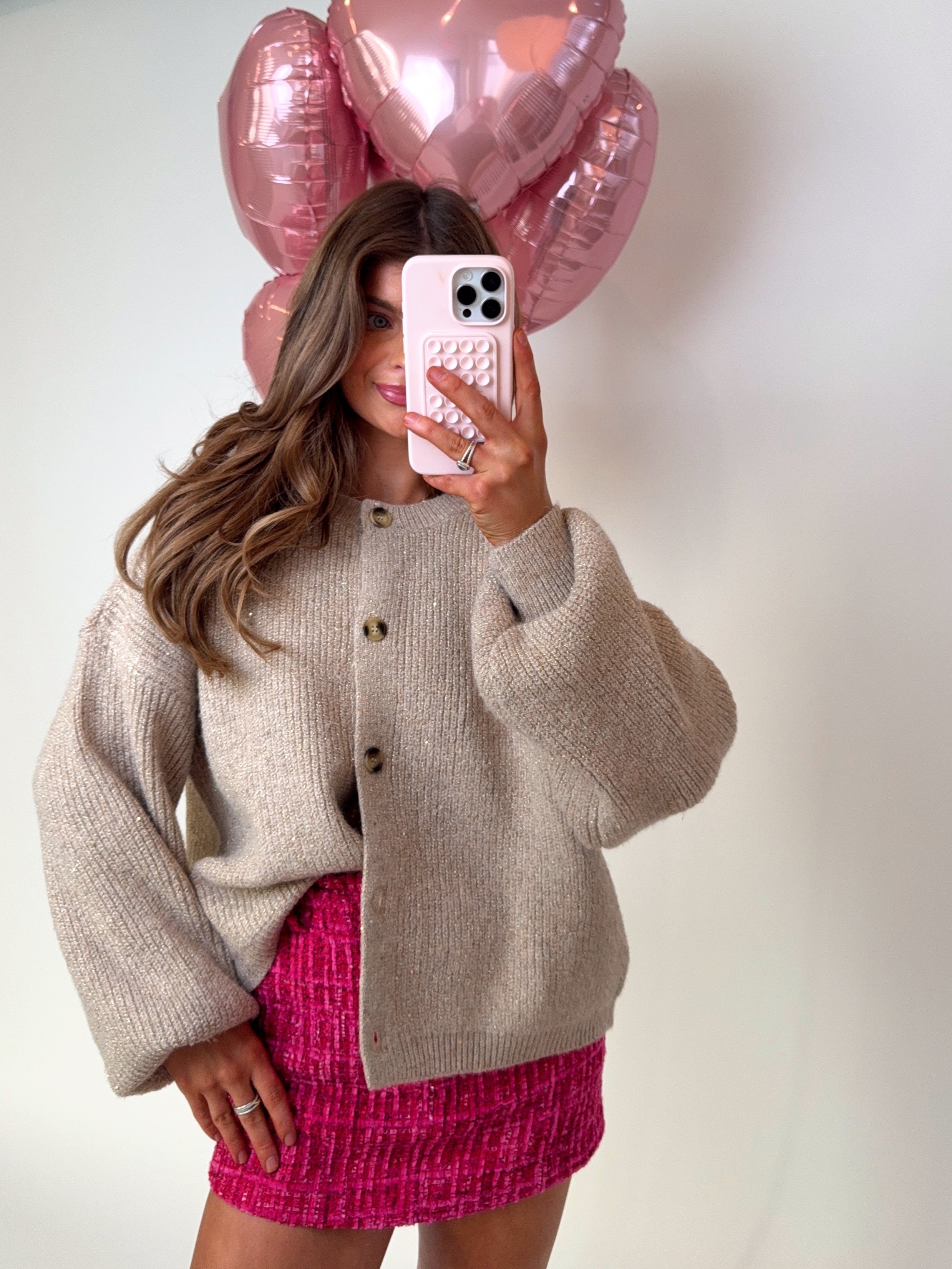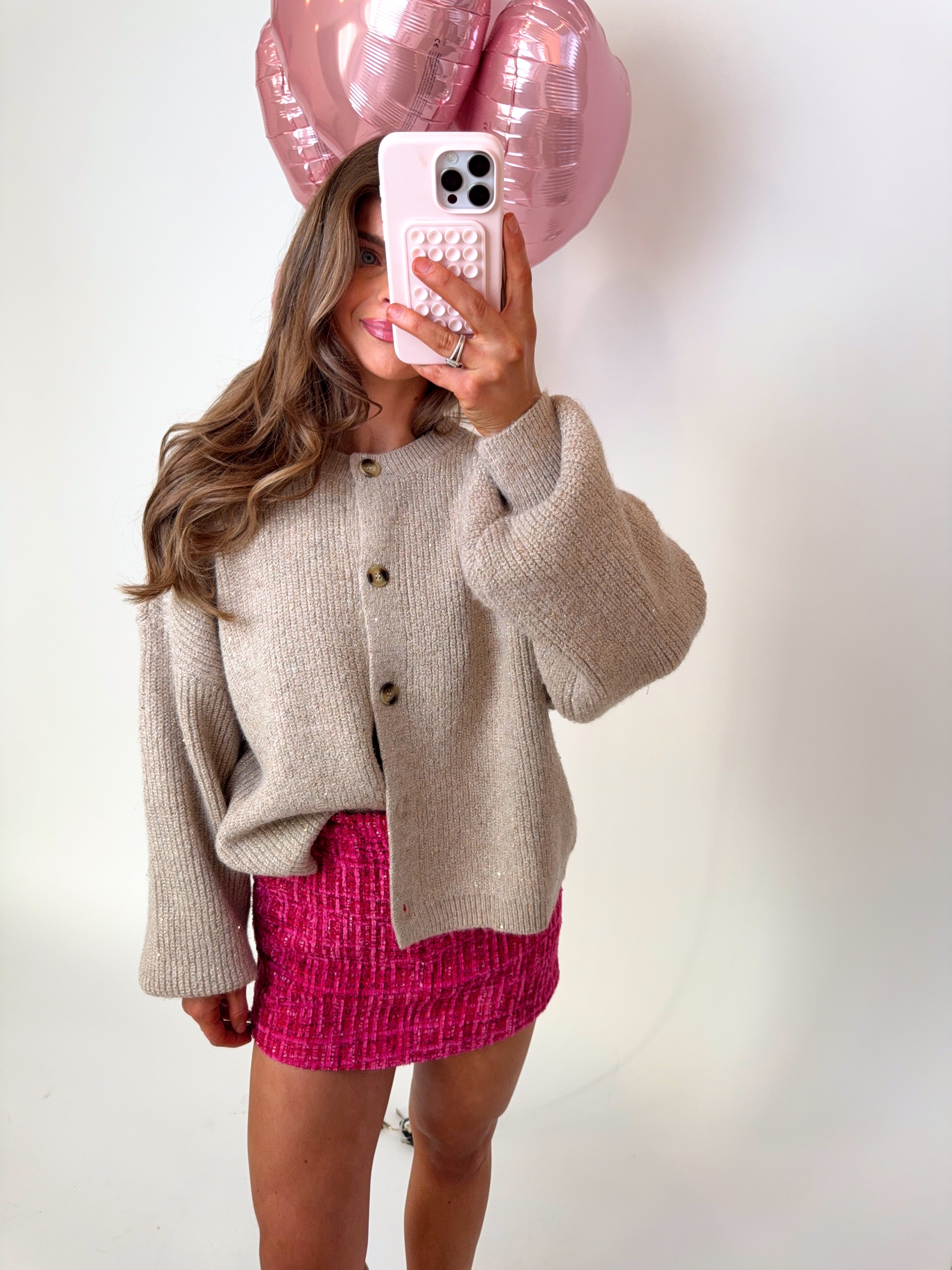 The Albie Cardigan features a button down front, round neckline, and a subtle shimmer.