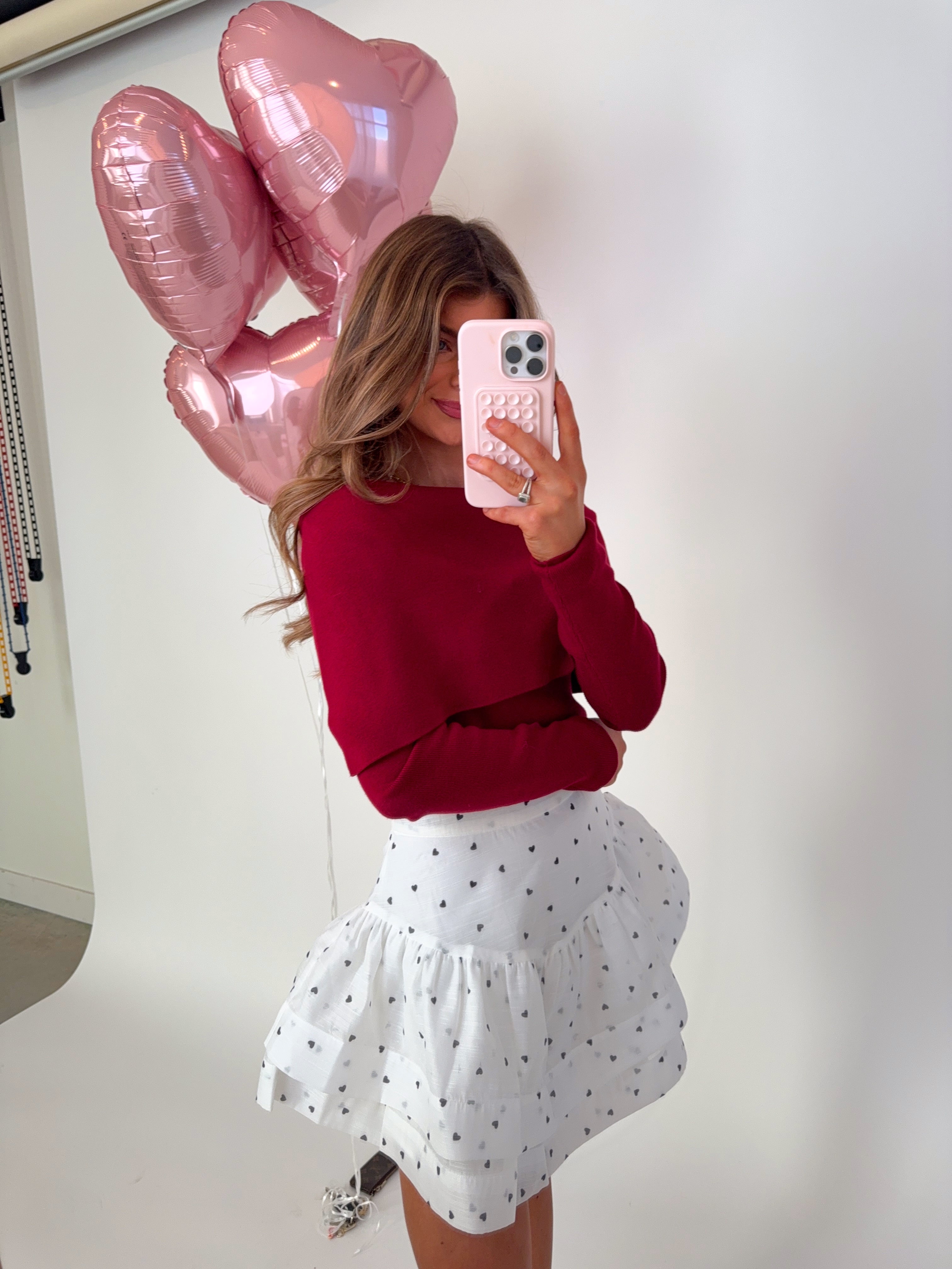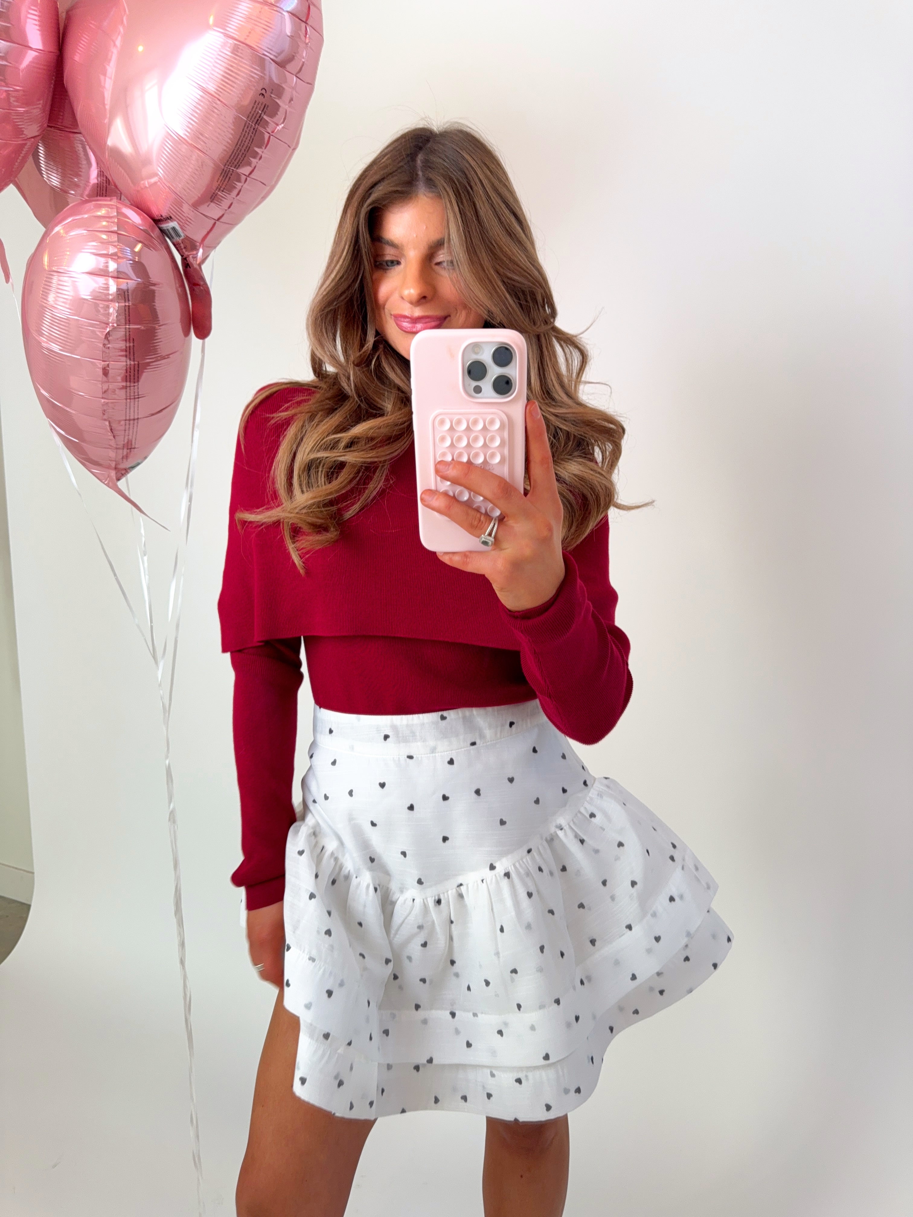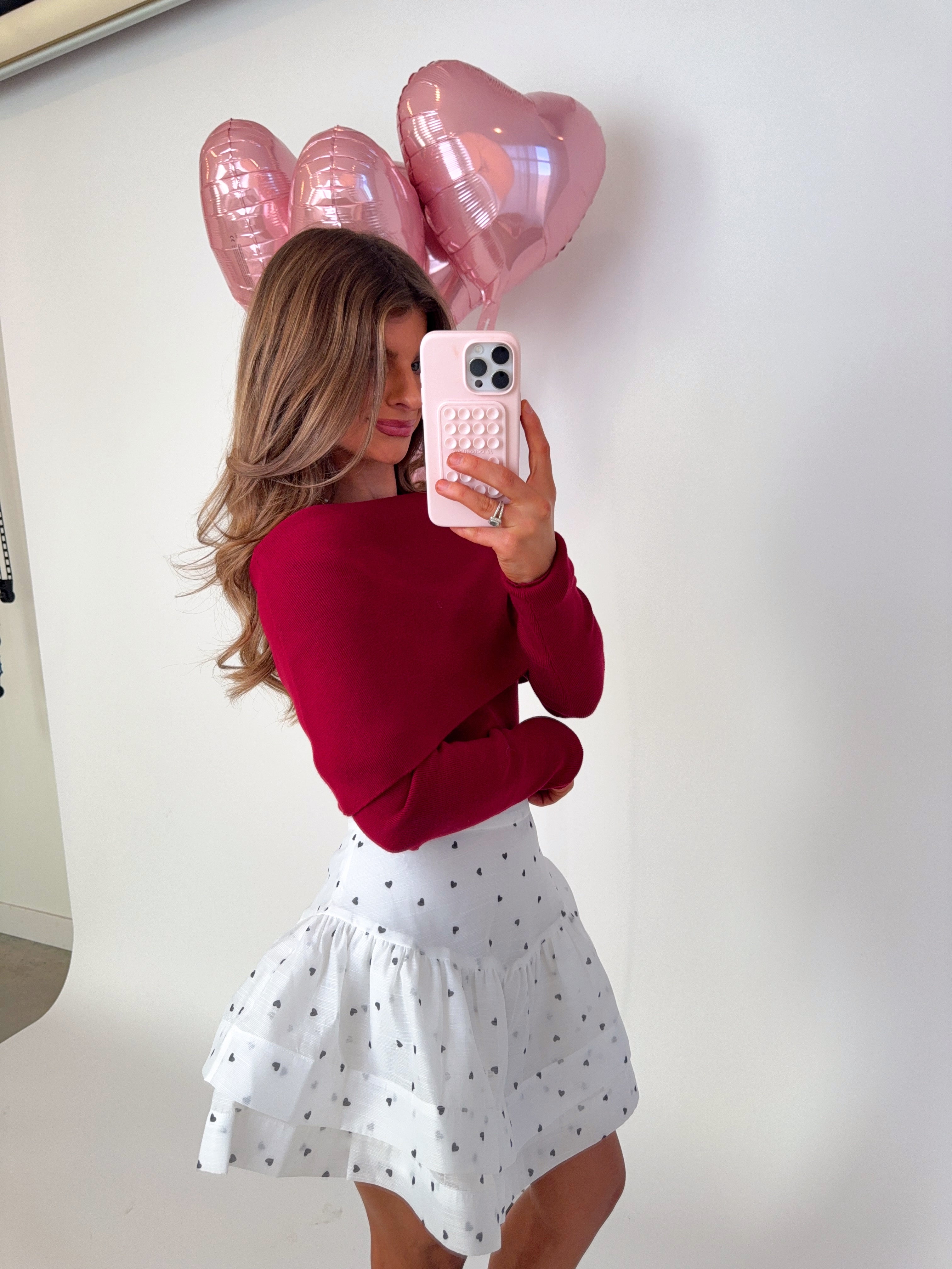 This lightweight white mini skirt features an all-over tiny heart print and soft tiered ruffles for the most romantic, twirl-worthy look. Designed with a flattering high-rise fit and airy, flowy silhouette. Finished with a zipper up the back for closure.