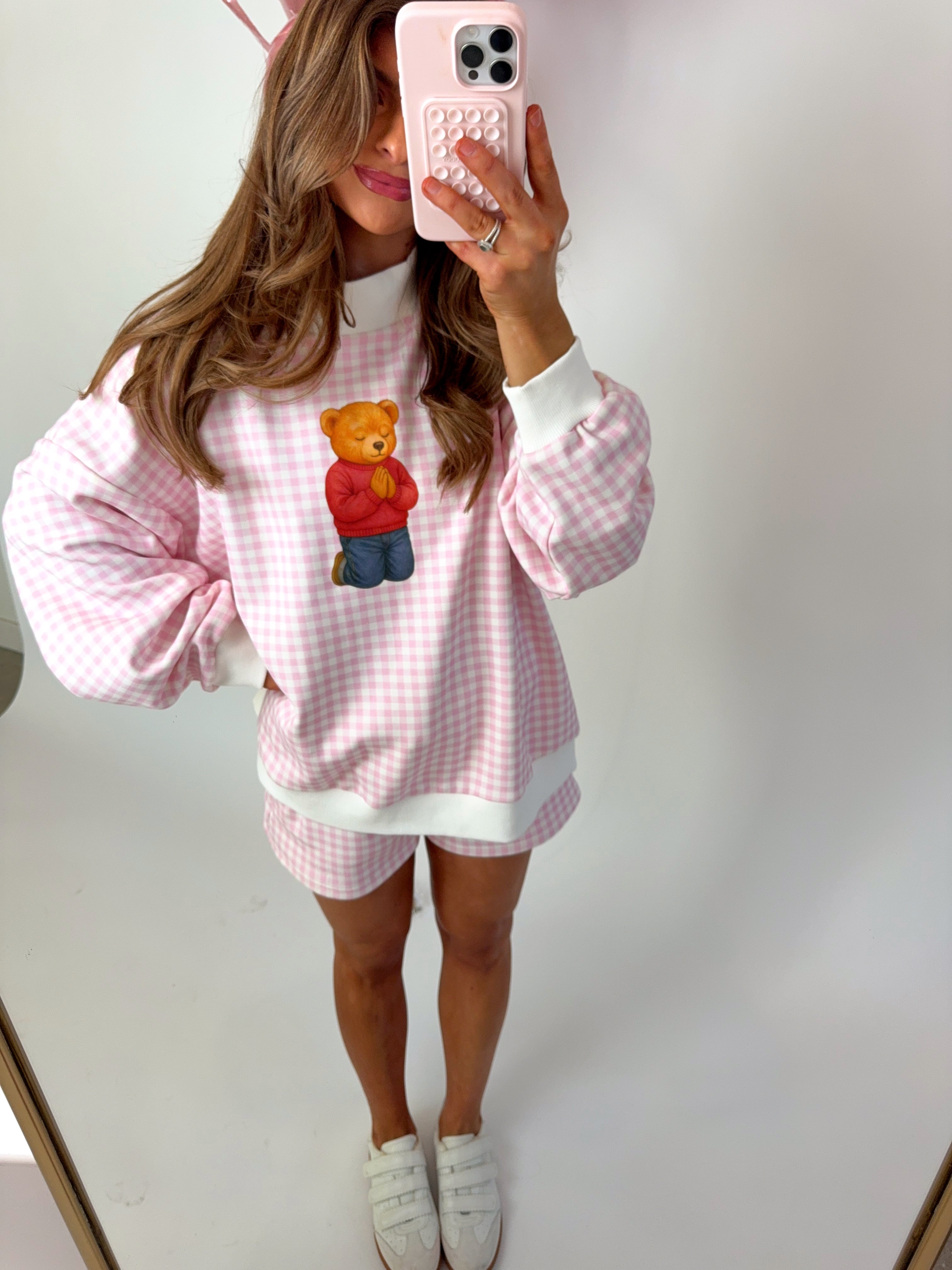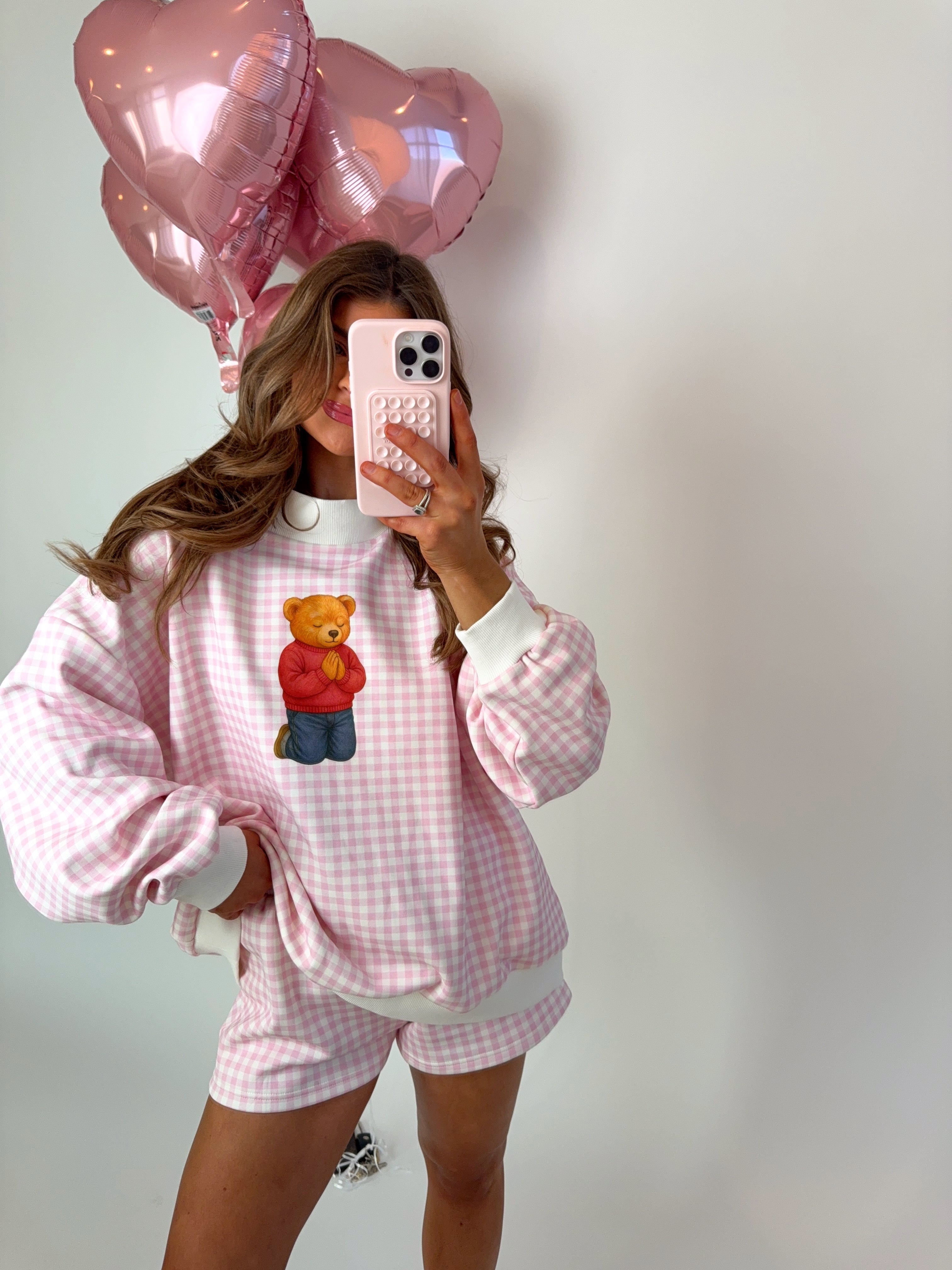 Meet your new favorite feel-good super soft, fleece lined lounge set. Gingham Teddy Bear Mockneck features the softest blush pink gingham fabric paired with our exclusive kneeling teddy bear graphic — a sweet, heartwarming detail that makes this set truly one-of-a-kind. Designed to feel just as special as it looks, this set blends cozy comfort with whimsical Ave & Liv charm.
