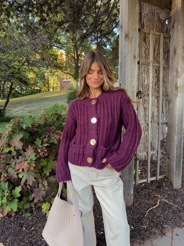 Chunky Knit Long Sleeve Cardigan - Deep Purple