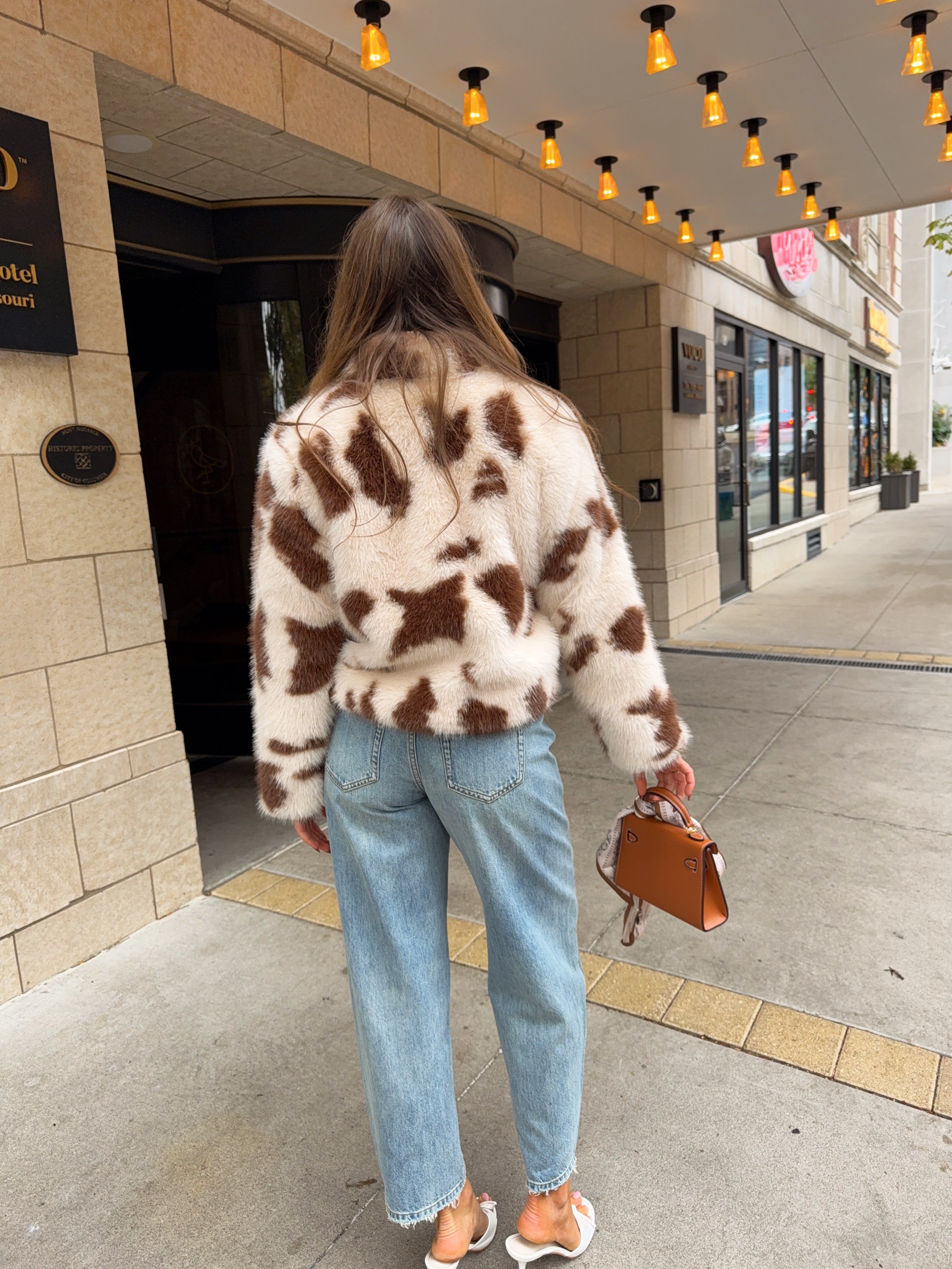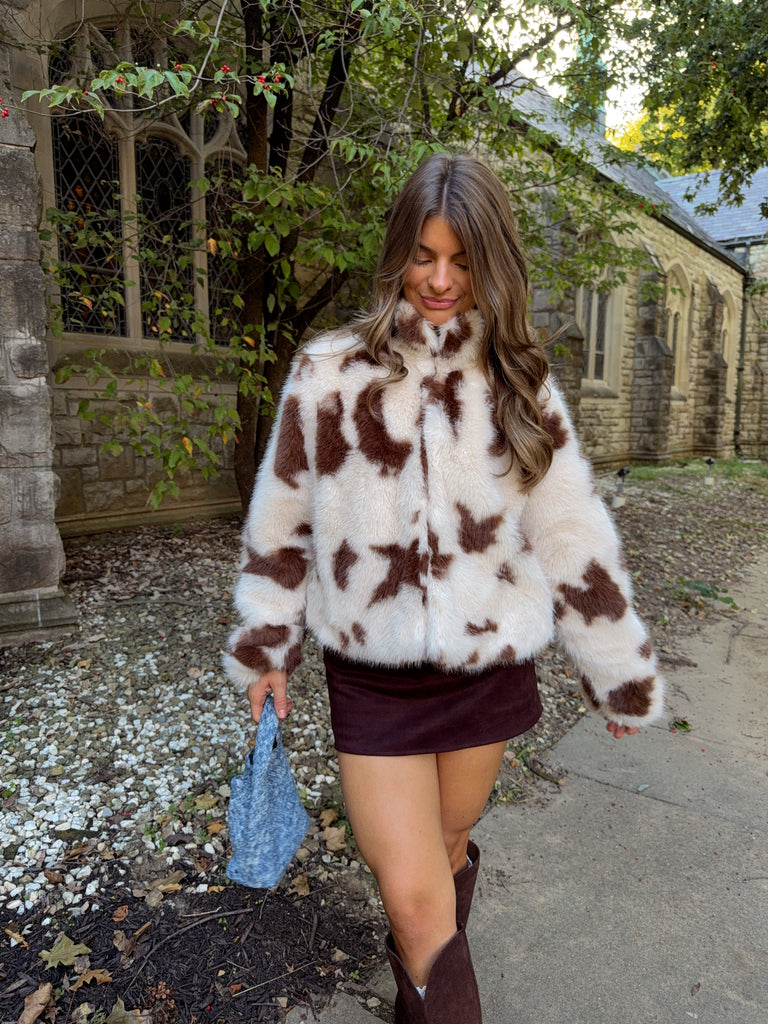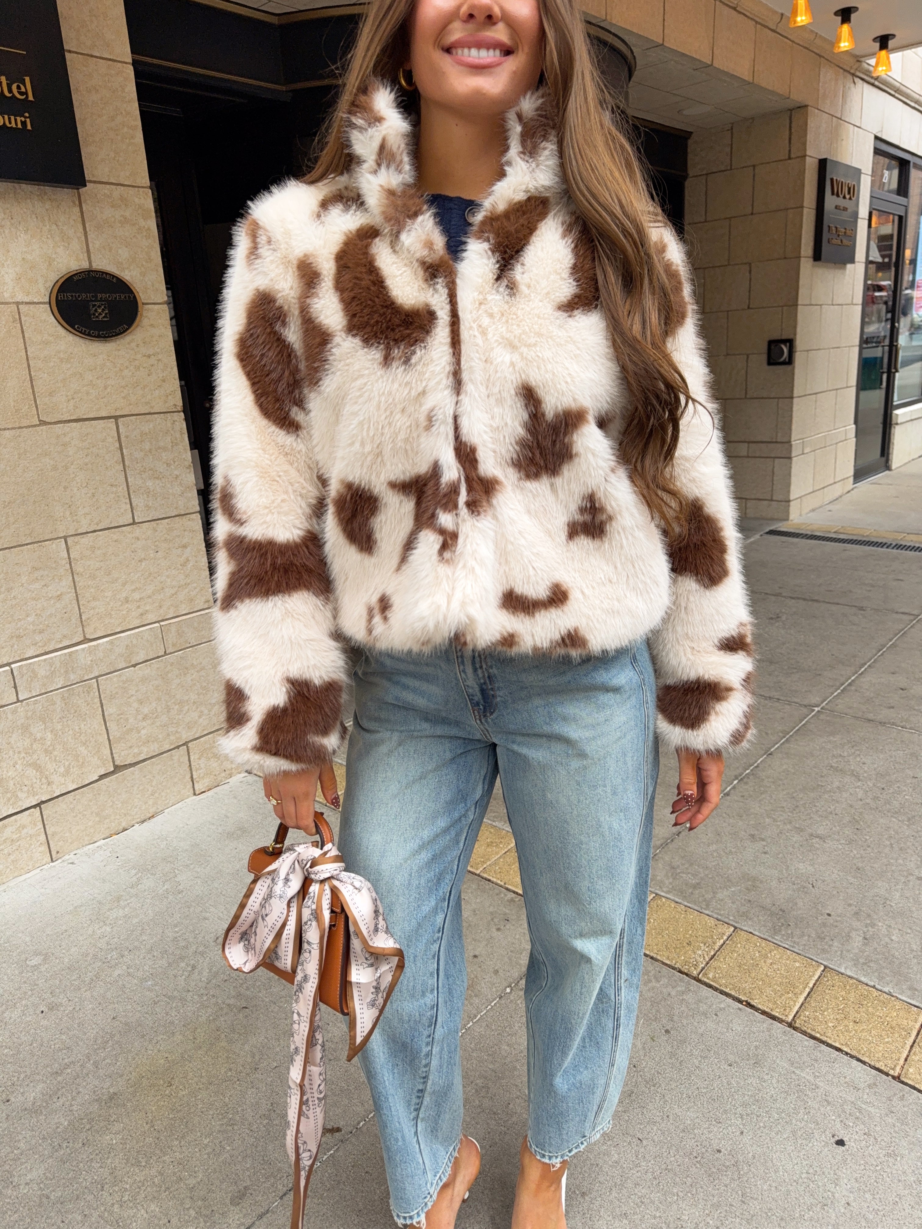 Faux fur cow hide print coat featuring a stand up collar and hook and eye clasps for closure.