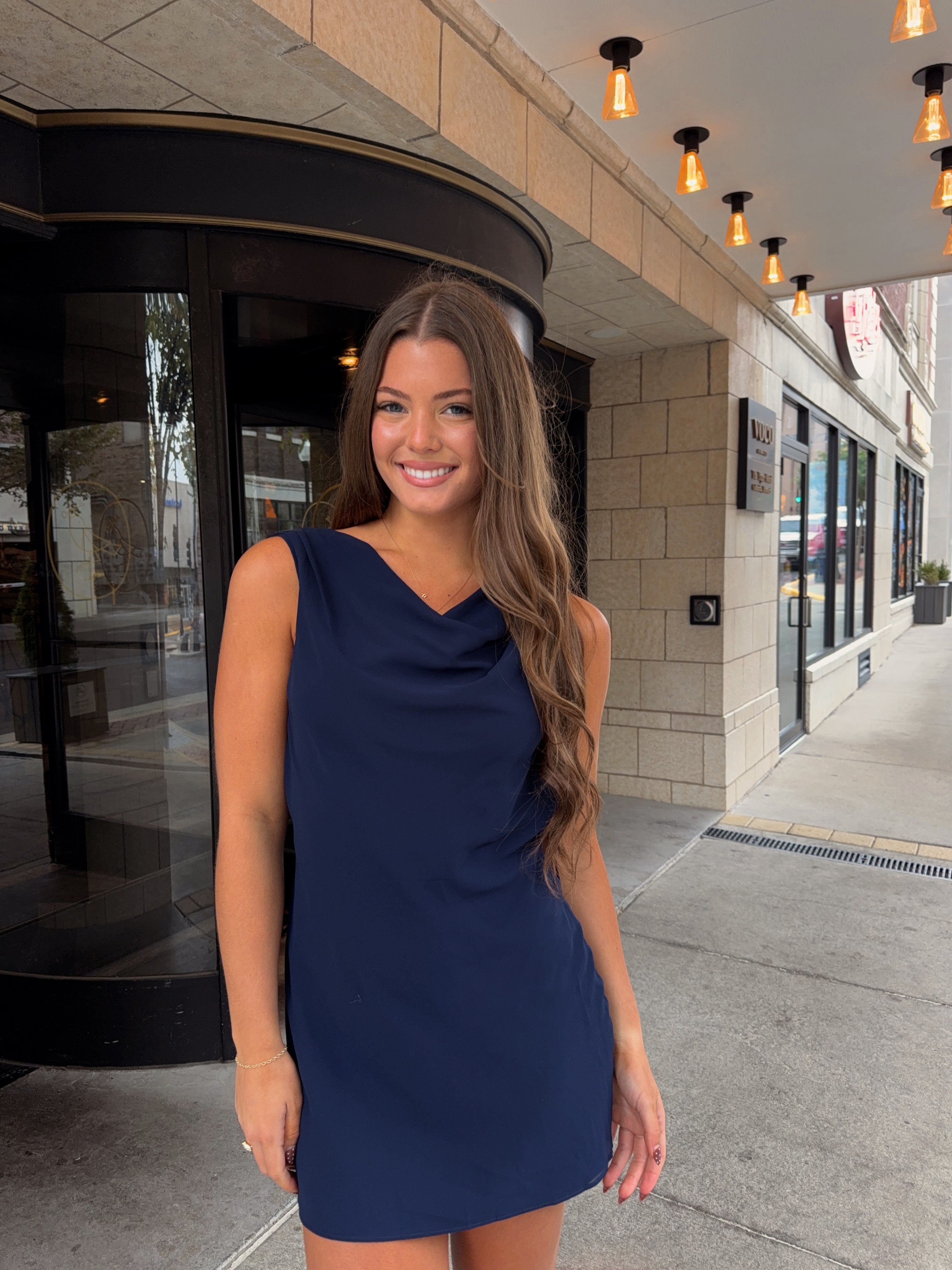 Halter tie neckline open back mini dress featuring a drop waist silhouette crafted from a flowy chiffon fabric.