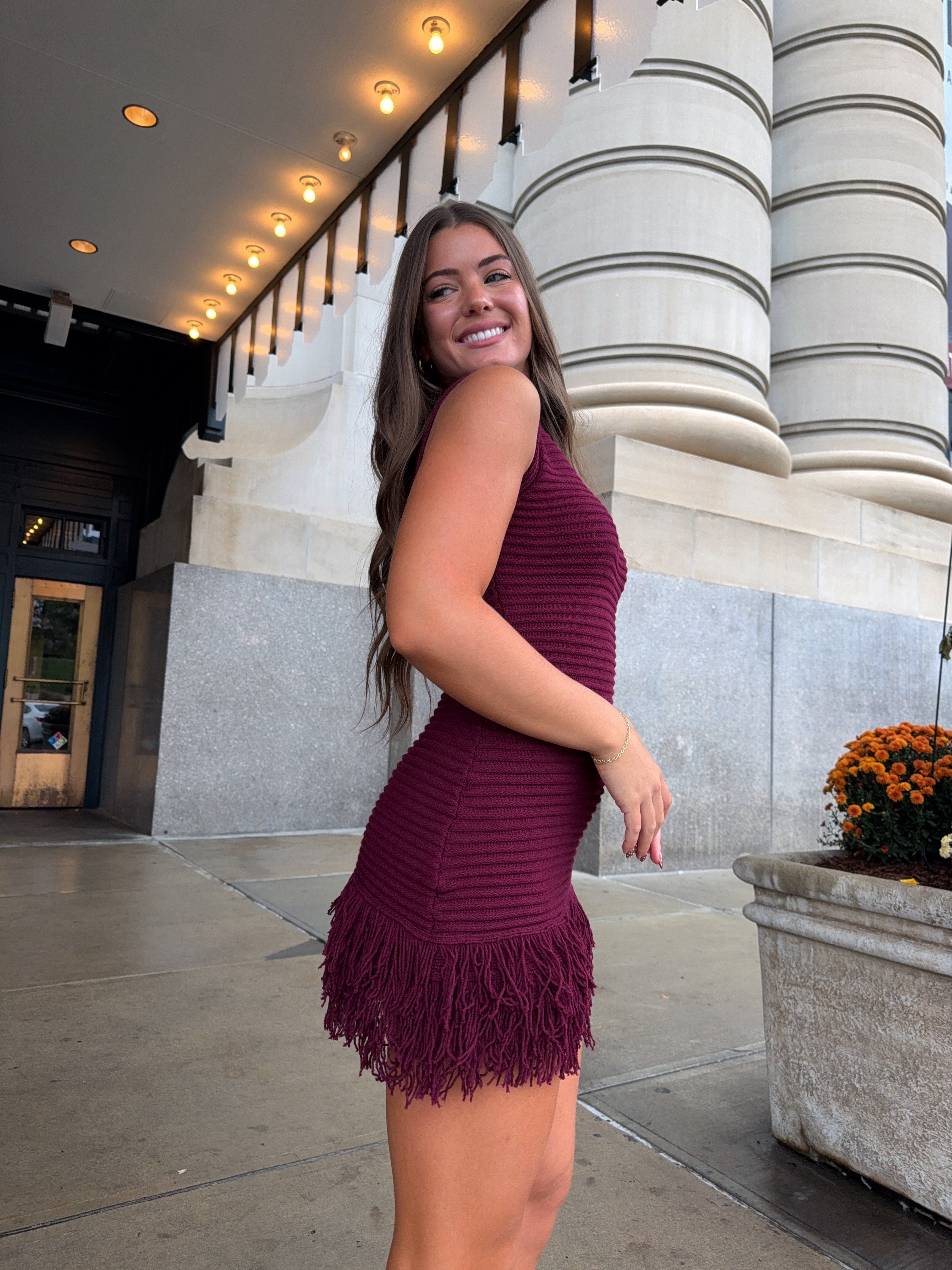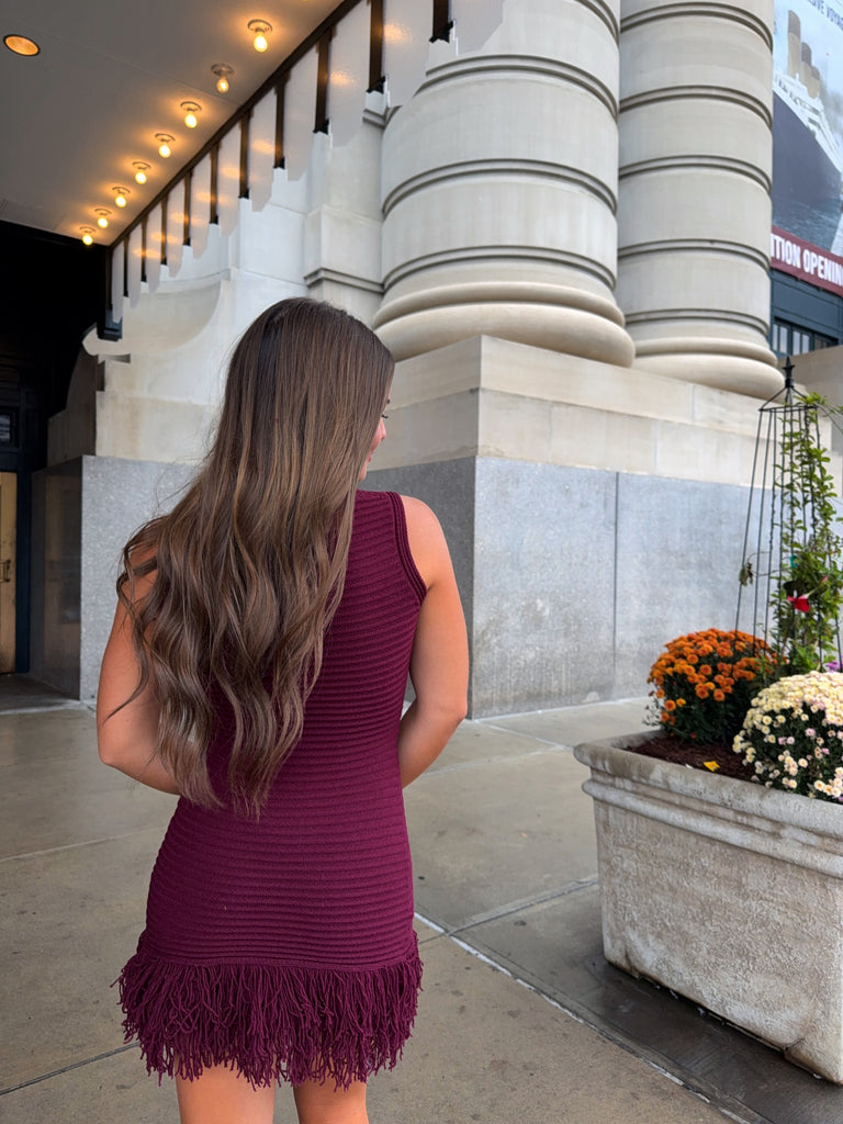 The Bordeaux Fringe Knit Sweater Mini Dress - Cherry Lacquer