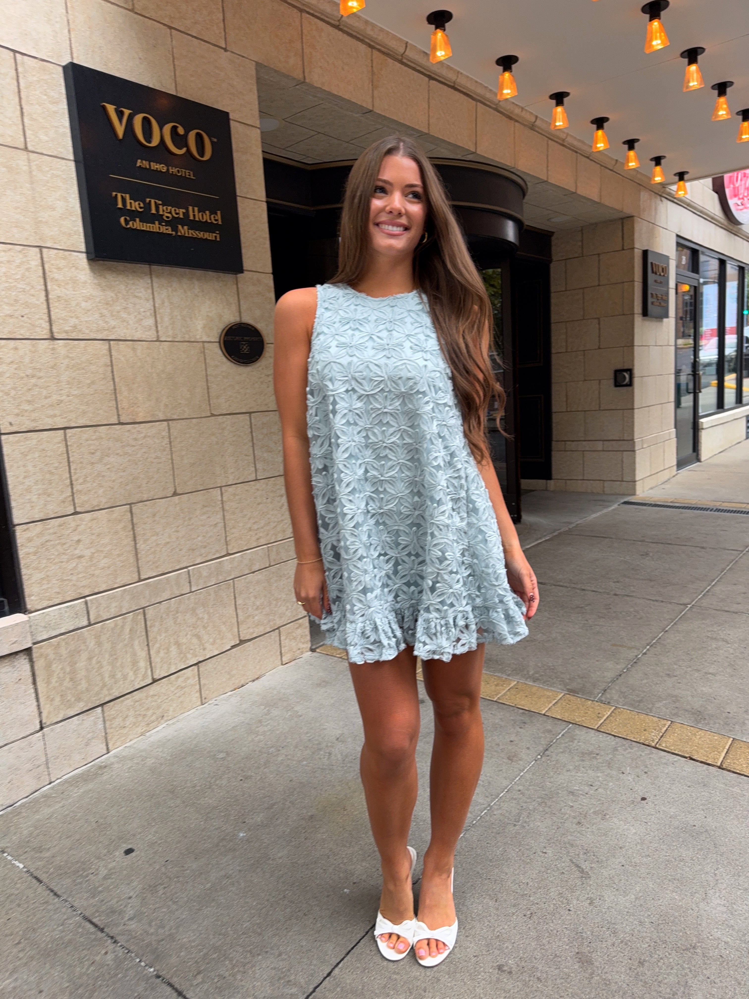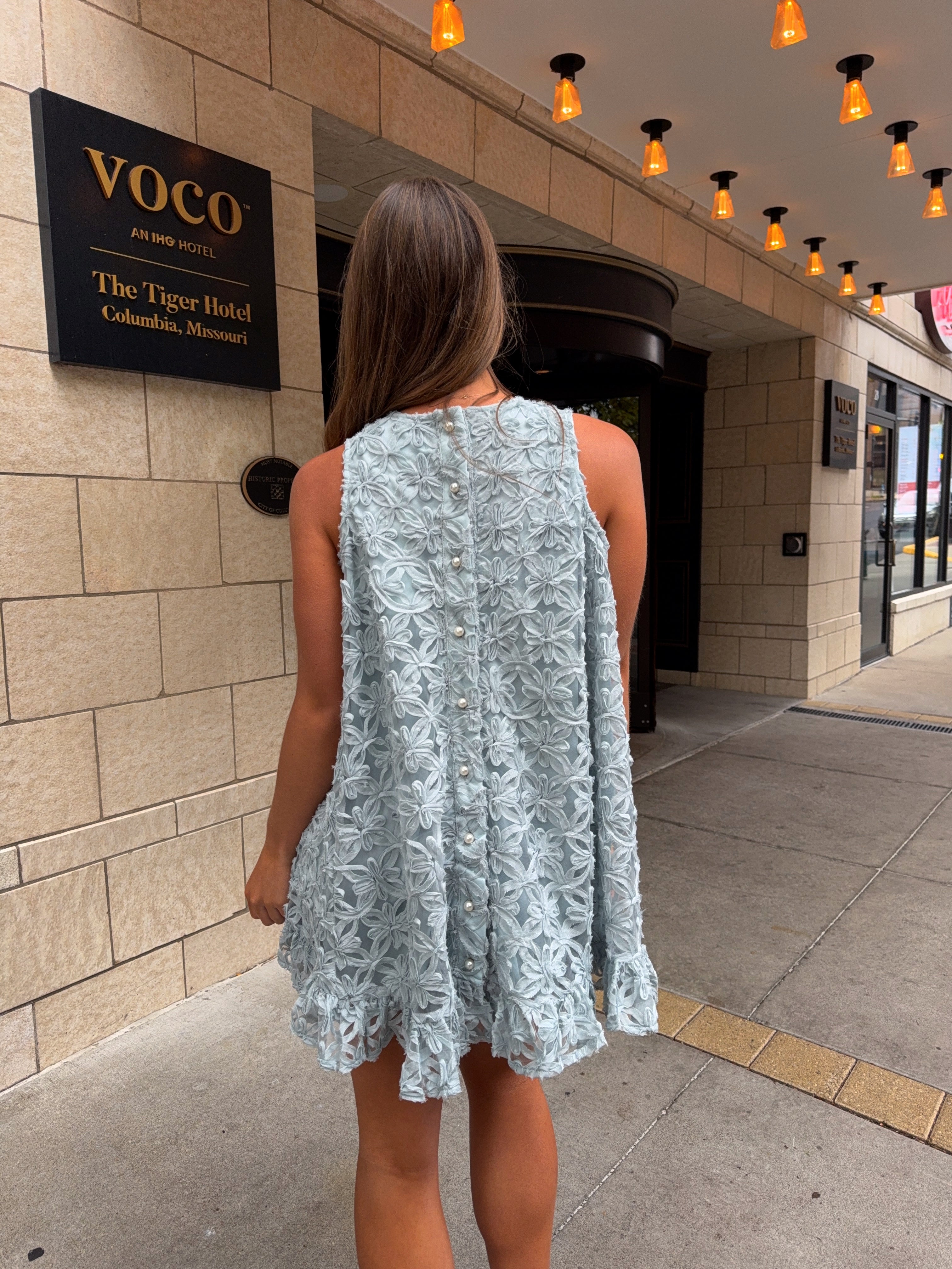 Floral Applique Button Back Mini Dress - Dusty Blue