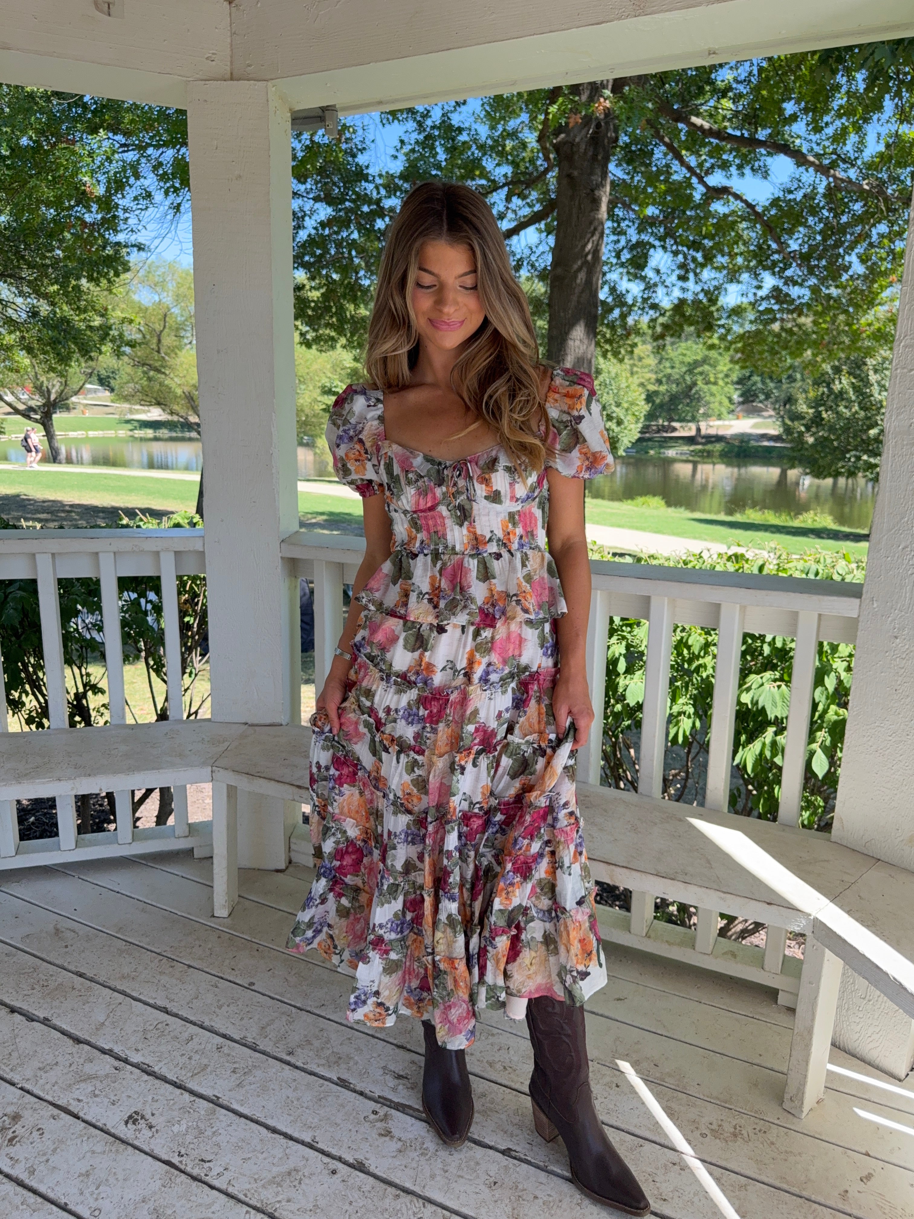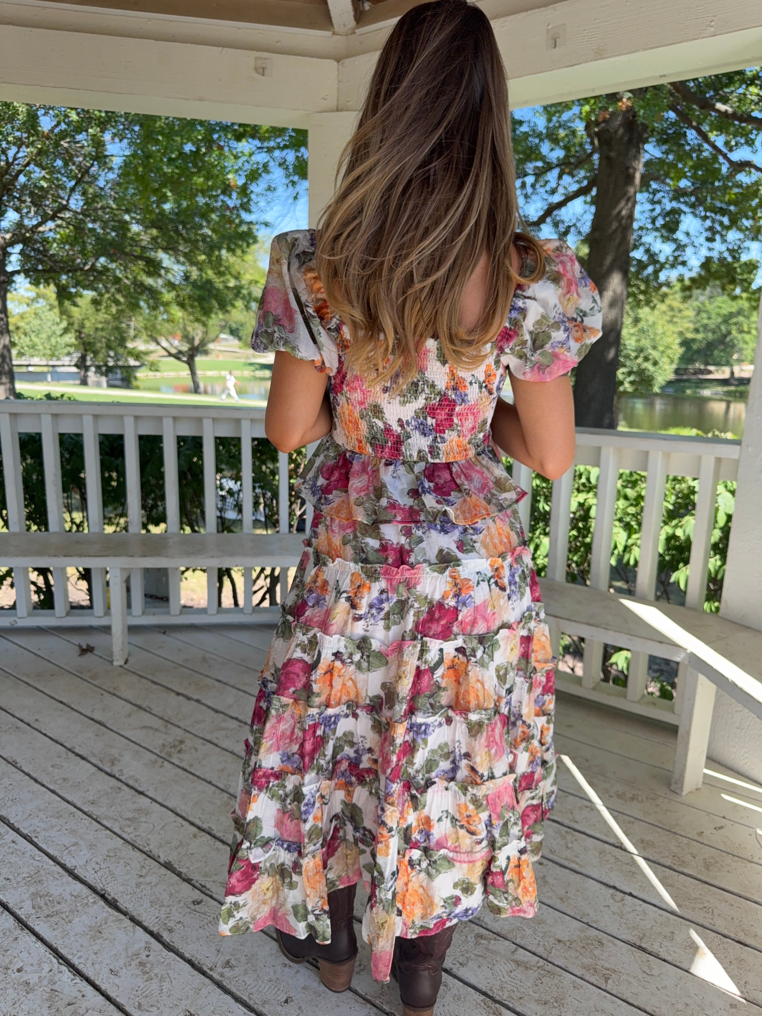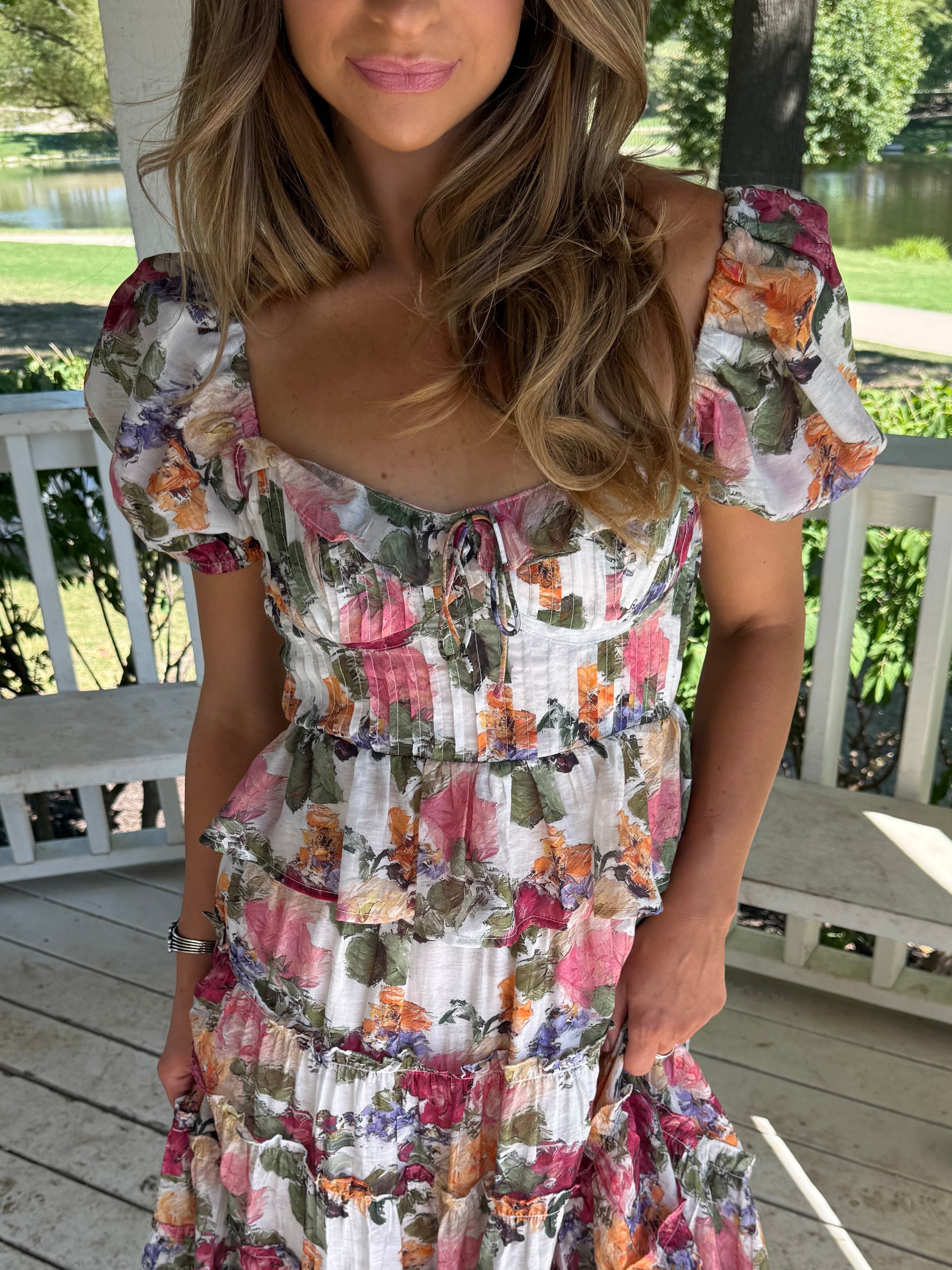Short sleeve multi color floral blouse featuring a corset silhouette bodice and a ruffle hem. Also featuring elastic lined shoulder and sleeves.