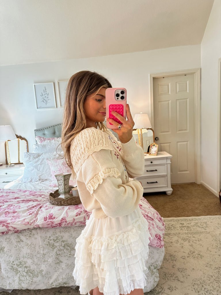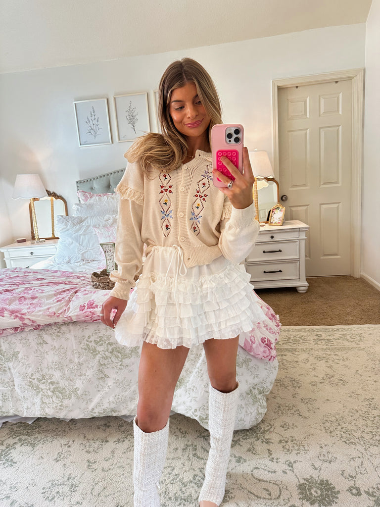 Introducing the Poppi cardigan. This delicate floral embroidered sweater features an intricate knit pattern and a wide collar. Featuring buttons down the front and a ruffle on each sleeve.