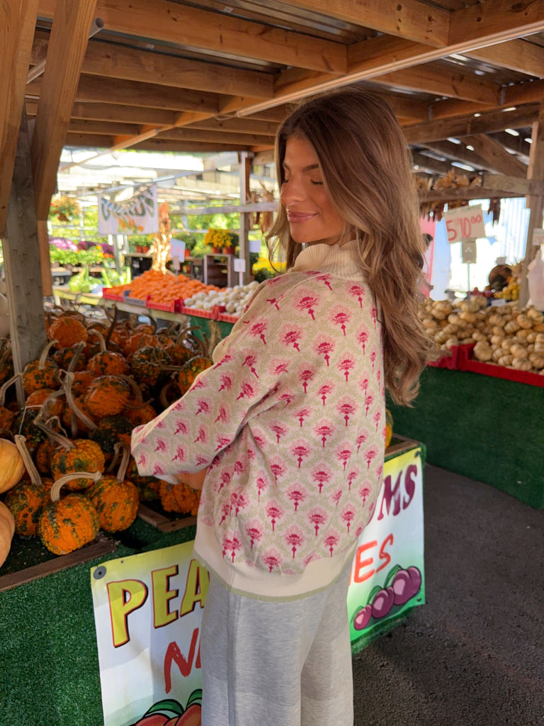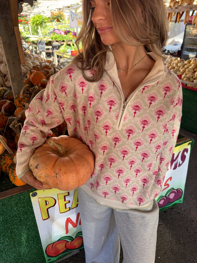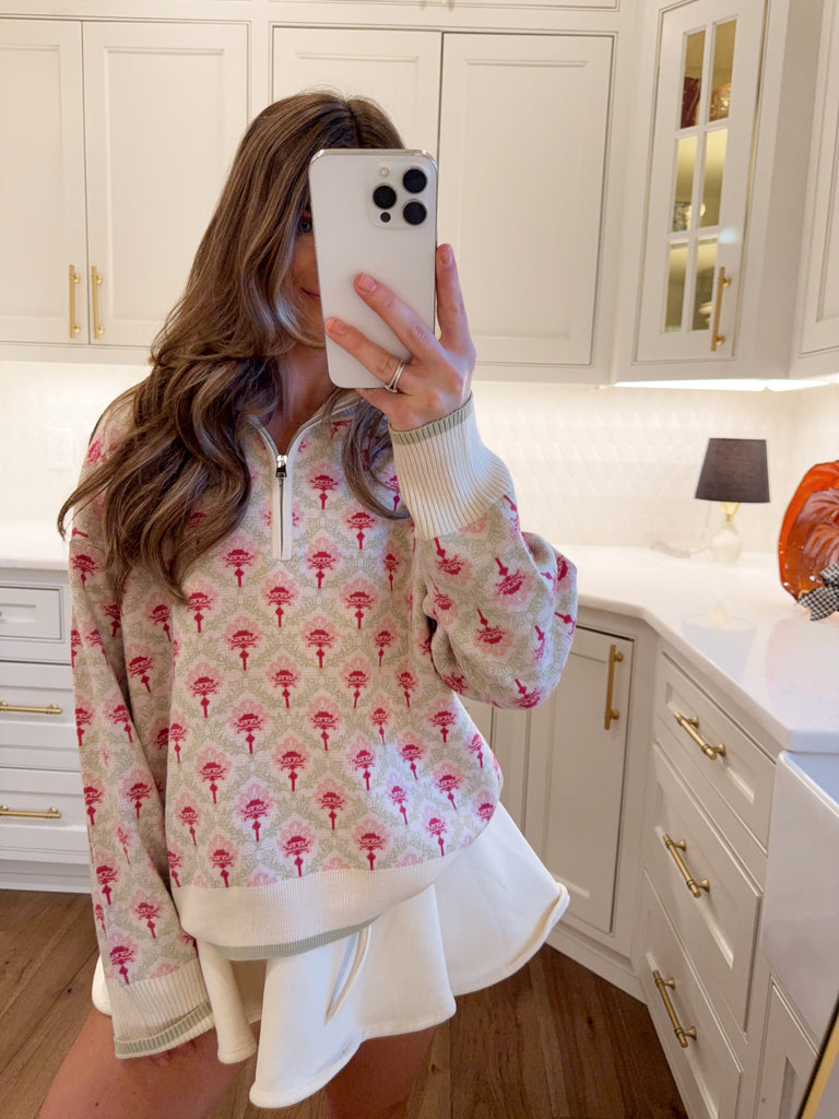 Floral knit half zip pullover featuring a classic mockneck, half zip, and drop shoulder sleeves. Contrasting ribbed knit accents on the neckline, cuffs, and hem. The relaxed bodice falls to the perfect length.