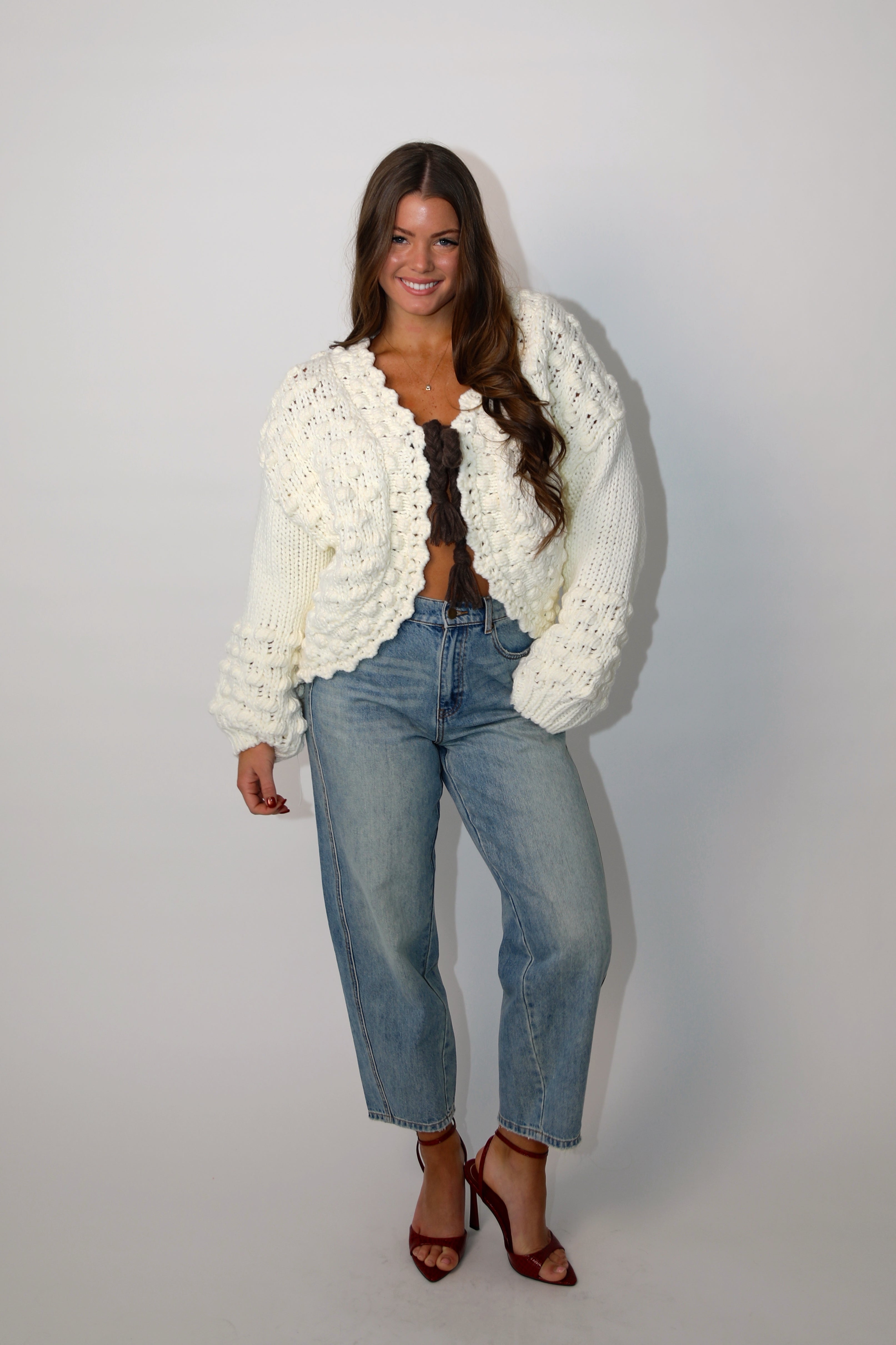 Sweet with a touch of charm, this chunky knit cardigan is the perfect layering piece for effortless everyday styling. Designed in a soft cream knit, it features delicate scalloped edging, textured knit detailing, and a flattering cropped length. The statement tie-front closure with braided tassel ties adds a playful, feminine finish while allowing you to style it open or closed.