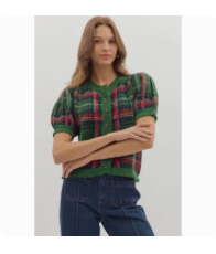 Plaid Short Puff Sleeve Sweater Knit Top - Green